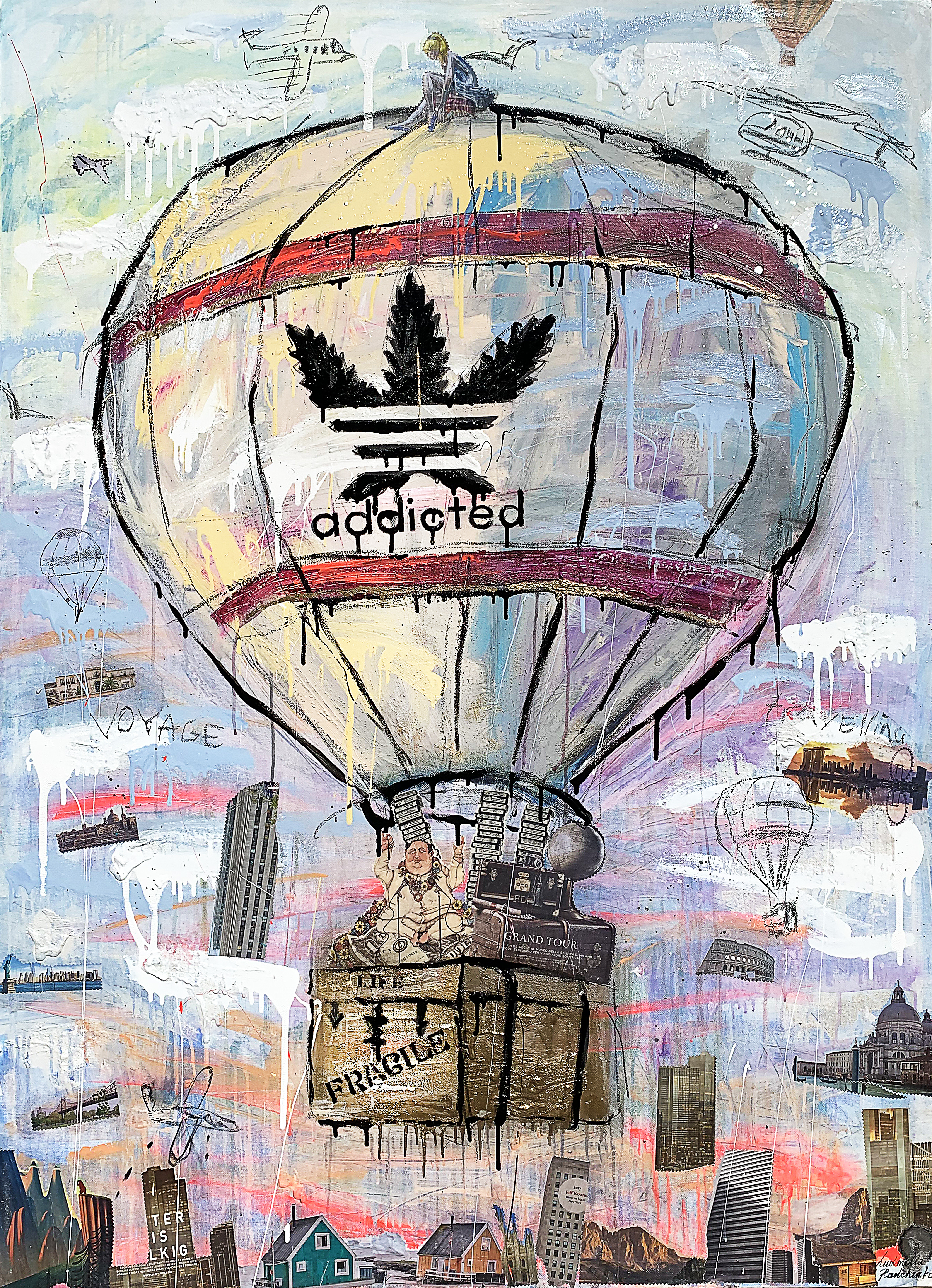 SERIE VOYAGE NATA NEI MESI CHE HANNO CONTRADDISTINTO LE FASI DELLA DIFFUSIONE DEL COVID 19, QUESTA SERIE ATTRAVERSA CON IRONICA POSITIVITÀ I MOMENTI PIÙ DRAMMATICI DI QUESTA COMPLESSA FASE DI PORTATA MONDIALE. CONCEPITA PRIMA ANCORA DEL DIFFONDERSI DELLA PANDEMIA, QUASI COME SE FOSSE STATA ANTICIPATA DAL PENSIERO DELLA RADCHENKO, HA LA FORZA DI TRASPORTARCI ATTRAVERSO CITTÀ AMMALIANTI SVUOTATE DALL'ENERGIA DELLA QUOTIDIANITÀ, E VIAGGI CARICHI DI SPERANZA, CHE CI FANNO VOLARE IN ALTO PROPRIO COME QUELLA MONGOLFIERA CARICA DI SOGNI. UN AMORE DIVERSO, E UN BACIO SENZA CONTATTO, AFFRONTANO TEMATICHE CONTEMPORANEE DI DIFFICILE ACCETTAZIONE. L'ARTE DELLA RADCHENKO, HA IL POTERE RIGENERANTE DELLA RINASCITA, RACCONTATO IN UN QUADRO SIMBOLICO "IL RISVEGLIO DOPO LA CONFUSIONE" CHE SI CONFRONTA CON IL DRAMMA DELLA PANDEMIA, LASCIANDOCI SEMPRE UNA SPERANZA DI NUOVI INIZI, PROPRIO COME I SUOI PICCOLI FIORI CHE SBOCCIANO COLORANDO IL GRIGIO DEL TEMPO. ANCORA UNA VOLTA, IL TEMA DEL VIAGGIO IN PRIMO PIANO, VIENE RAFFIGURATO DA UN'ENORME MONGOLFIERA CHE SORVOLA LE CITTÀ DEL MONDO. UN GIOCO, COME SEMPRE, TRA IRONIA E SIMBOLISMO, CI RIMANDA AD EPOCHE DIVERSE CHE CONVIVONO TRA LORO. UN GRANDE BAULE, PROPRIO COME QUELLI USATI DURANTE L'OTTOCENTO PER COMPIERE IL "GRAND TOUR" TANTO AMATO ED AMBITO DAI GIOVANI ARTISTI, È POSTO A FIANCO DI UN UOMO "BUDDHA", CHE È SOSTENUTO DA UN DOLLARO CHE FUNGE DA TAPPETO VOLANTE. UNA GRANDE SCATOLA, CON LA SCRITTA "LIFE" E FRAGILE" CI RICORDA, COME LA VITA, È UN BAGAGLIO DA CUI NON POTREMMO MAI SEPARARCI, E CHE È TANTO IMPORTANTE QUANTO FRAGILE. UNA BALLERINA, POSTA IN CIMA ALLA MONGOLFIERA, SI ALLACCIA CANDIDAMENTE LA SUA SCARPETTA. UN OMAGGIO A JEFF KOONS E ALLA LEGGIADRIA DEI SOGNI, CHE CI PORTANO LÌ DOVE POSSIAMO TOCCARE IL CIELO CON UN DITO. VOYAGE SERIES BORN DURING THE MONTHS THAT MARKED THE PHASES OF THE SPREAD OF COVID 19, THIS SERIES GOES THROUGH THE MOST DRAMATIC MOMENTS OF THIS COMPLEX GLOBAL PHASE WITH IRONIC POSITIVITY. CONCEIVED EVEN BEFORE THE SPREAD OF THE PANDEMIC, ALMOST AS IF IT HAD BEEN ANTICIPATED BY THE THOUGHT OF HE ARTIST, IT HAS THE STRENGTH TO TRANSPORT US THROUGH FASCINATING CITIES EMPTIED OF THE ENERGY OF EVERYDAY LIFE, AND JOURNEYS FULL OF HOPE, WHICH MAKE US FLY HIGH JUST LIKE THAT BALLOON FULL OF DREAMS. A DIFFERENT LOVE, AND A KISS CONTACTLESS, FACE CONTEMPORARY ISSUES THAT ARE DIFFICULT TO ACCEPT. RADCHENKO'S ART HAS THE REGENERATING POWER OF REBIRTH, TOLD IN A SYMBOLIC PAINTING "THE AWAKENING AFTER THE CONFUSION" THAT CONFRONTS THE TRAGEDY OF THE PANDEMIC, ALWAYS LEAVING US WITH HOPE OF NEW BEGINNINGS, JUST LIKE THAT LITTLE BLOSSOMING FLOWERS COLORING THE GRAY OF TIME. ONCE AGAIN, THE THEME OF TRAVEL IN THE FOREGROUND IS DEPICTED BY A HUGE HOT AIR BALLOON FLYING OVER THE CITIES OF THE WORLD. A GAME, AS ALWAYS, BETWEEN IRONY AND SYMBOLISM, TAKES US BACK TO DIFFERENT ERAS THAT COEXIST WITH EACH OTHER. A LARGE CASE, JUST LIKE THOSE USED DURING THE NINETEENTH CENTURY TO MAKE THE "GRAND TOUR" SO LOVED AND COVETED BY YOUNG ARTISTS, IS PLACED NEXT TO A "BUDDHA" MAN, WHO IS SUPPORTED BY A DOLLAR THAT SEEMS A FLYING CARPET. A LARGE BOX, WITH THE WORDS "LIFE" AND FRAGILE "REMINDS US, THAT LIFE, IS A BAGGAGE FROM WHICH WE COULD NEVER PART AWAY, AND WHICH IS AS IMPORTANT AS IT IS FRAGILE. A DANCER, PLACED ON TOP OF THE BALLOON, CANDIDLY FASTENS HER SHOE. A TRIBUTE TO JEFF KOONS AND THE GRACEFULNESS OF DREAMS, WHICH LEAD US TO WHERE WE CAN TOUCH THE SKY WITH A FINGER.