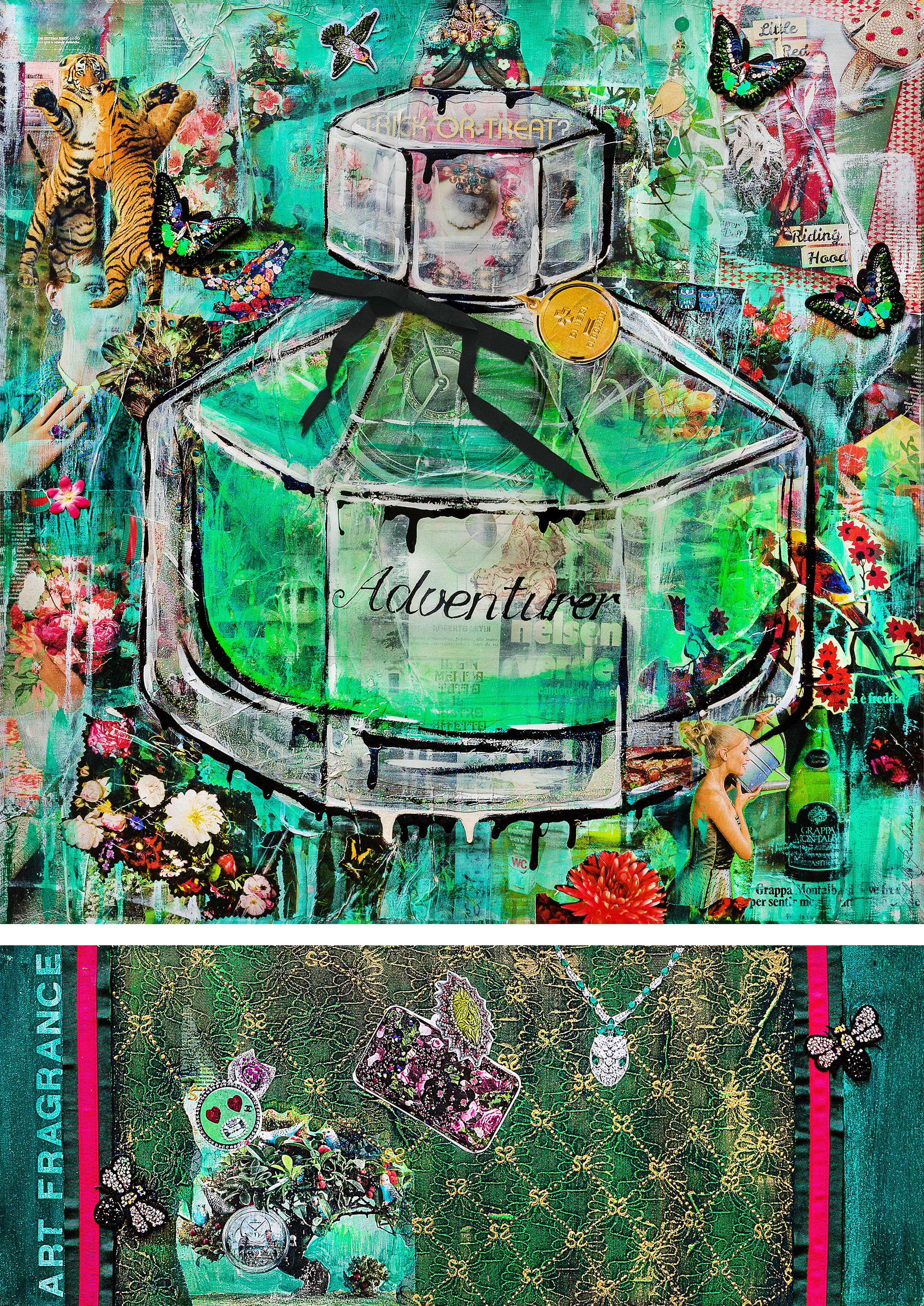 ADVENTURER, 80X80 + PANTONE. 30X80. L'OPERA ESPRIME TUTTO IL FASCINO SENZA TEMPO, L'INTRAPRENDENZA ED IL CORAGGIO DELLE PERSONALITÀ AVVENTUROSE PANTONE: VERDE SMERALDO. LUDMILLA RADCHENKO CONTINUA LA SUA RICERCA ARTISTICA DECENNALE, RIPROPONENDO IL TEMA DELLE ESSENZE, CHE ORMAI RAPPRESENTA E IDENTIFICA LA SUA CREATIVITÀ NEL PANORAMA INTERNAZIONALE: NELLA SERIE FABRIQUE DU FRAGRANCE L'ARTISTA RIELABORA ICONICHE BOCCETTE DI PROFUMO IN CHIAVE PERSONALE, NELLA SUA "POP FACTORY", SVELANDO COSÌ ANCHE LE PERSONALITÀ E IL CARATTERE DI CHI LE SCEGLIE PER LA PROPRIA PELLE. UOMINI E DONNE DI TUTTO IL MONDO CREANO OGNI GIORNO IL LORO STILE GRAZIE ALLE FRAGRANZE PIÙ RAFFINATE DEI PIÙ RICONOSCIUTI BRAND INTERNAZIONALI, SCEGLIENDO IL PROFUMO DELLA PROPRIA PERSONALITÀ. OGNI OPERA È REALIZZATA COME DITTICO, ABBINATA AD UNA TELA ORIZZONTALE, UN PANTONE, CHE NE RIPRENDE IL COLORE PRINCIPALE E IL CARATTERE, SOTTOLINEANDONE LE PARTICOLARITÀ STILISTICHE GRAZIE A PREZIOSI INSERTI E DETTAGLI. ADVENTURER, 80X80 + PANTONE. 30X80. THE WORK EXPRESSES ALL THE TIMELESS CHARM, THE RESOURCEFULNESS AND COURAGE OF ADVENTUROUS PERSONALITIES PANTONE: EMERALD GREEN. LUDMILLA RADCHENKO CONTINUES HER TEN-YEAR ARTISTIC RESEARCH, RE-PROPOSING THE THEME OF ESSENCES, WHICH NOW REPRESENTS AND IDENTIFIES HER CREATIVITY ON THE INTERNATIONAL SCENE: IN THE FABRIQUE DU FRAGRANCE SERIES, THE ARTIST REWORKS THE ICONIC BOTTLES OF PERFUME IN A PERSONAL KEY, IN HER "POP FACTORY", ALSO REVEALING THE PERSONALITIES AND CHARACTER OF THOSE WHO CHOOSE THEM FOR THEIR OWN SKIN. MEN AND WOMEN FROM ALL OVER THE WORLD CREATE THEIR EVERY DAY STYLE THANKS TO THE MOST REFINED FRAGRANCES OF THE MOST RECOGNIZED INTERNATIONAL BRANDS, CHOOSING THE SCENT OF THEIR OWN PERSONALITY. EACH ARTWORK IS MADE AS A DIPTYCH, COMBINED WITH A HORIZONTAL CANVAS, A PANTONE, WHICH EMPHASIZES THE MAIN COLOR AND CHARACTER, UNDERLINING THE STYLISTIC PECULIARITIES THANKS TO PRECIOUS INSERTS AND DETAILS.