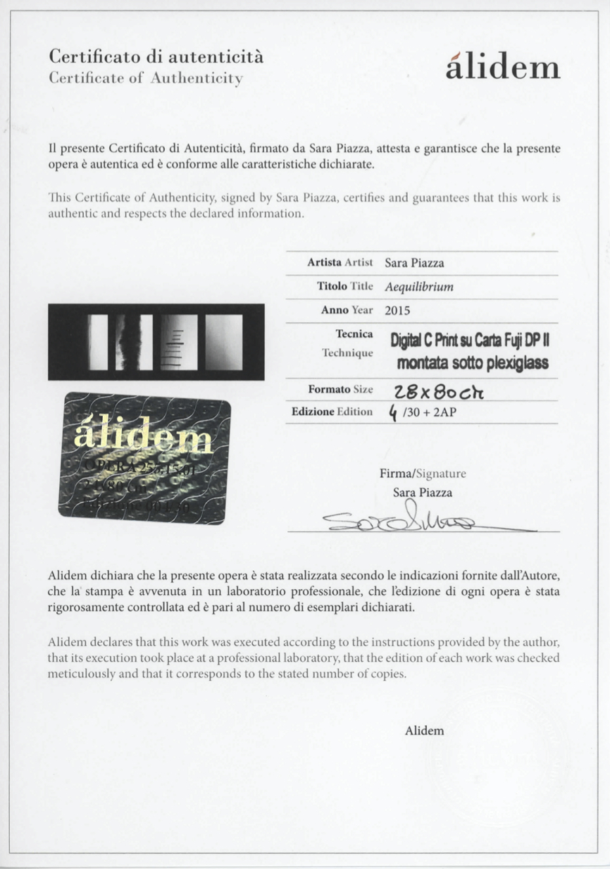 EN After graduating in Physics and Math, Sara Piazza decided to attend the Istituto Italiano di Fotografia in Milan, in order to pursue a professional career in photography. At the IIF, she had a chance to experiment all the potentialities of the photographic medium. At the end of her studies, she was selected by the Istituto Italiano di Fotografia to feature in a collective show organised on occasion of the eight edition of Photofestival, a cultural event sponsored by AIF - Associazione Italiana Foto e Digital Imaging - and part of the photo fair Photoshow (Milan, 2009). In the following years, Sara Piazza participated in several international art fairs. In 2013, her work was staged at Swab Barcelona, in 2014 and 2015 at the Affordable Art Fair Milano. Her shots have also been shown in France, at the Galerie Etienne des Causans (Paris, 2014), on occasion of the Salone Art3F (Lyon, 2015) and the Salon international d’art contemporain Art3F (Nice, 2015), and in the Netherlands at the Affordable Art Fair Amsterdam (2015). IT Dopo la laurea in Scienze Fisiche e Matematiche Sara Piazza avvia la sua carriera di fotografa professionista diplomandosi presso l’Istituto Italiano di Fotografia di Milano dove inizia molto presto a sperimentare le potenzialità del mezzo fotografico. Al termine del suo percorso formativo è selezionata dall’Istituto Italiano di Fotografia per la mostra collettiva curata in occasione dell’ottava edizione di Photofestival un evento culturale promosso da AIF - Associazione Italiana Foto e Digital Imaging – collateralmente alla fiera di fotografia Photoshow (Milano 2009). Nel corso degli anni Sara Piazza è stata protagonista di importanti fiere di arte contemporanea a livello internazionale. Nel 2013 è presente a Swab Barcelona nel 2014 e nel 2015 ad Affordable Art Fair Milano. Parallelamente agli impegni italiani le opere fotografiche di Sara raggiungono anche la Francia presso la Galerie Etienne des Causans (Parigi 2014) e in occasione del Salone Art3F (Lione 2015) e del Salon international d’art contemporain Art3F (Nizza 2015) e l’Olanda Affordable Art Fair Amsterdam (2015).