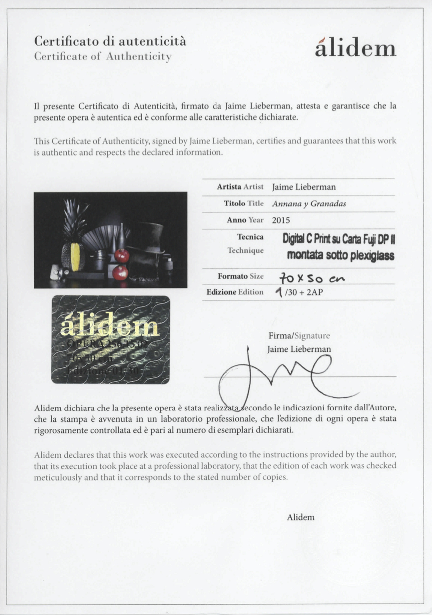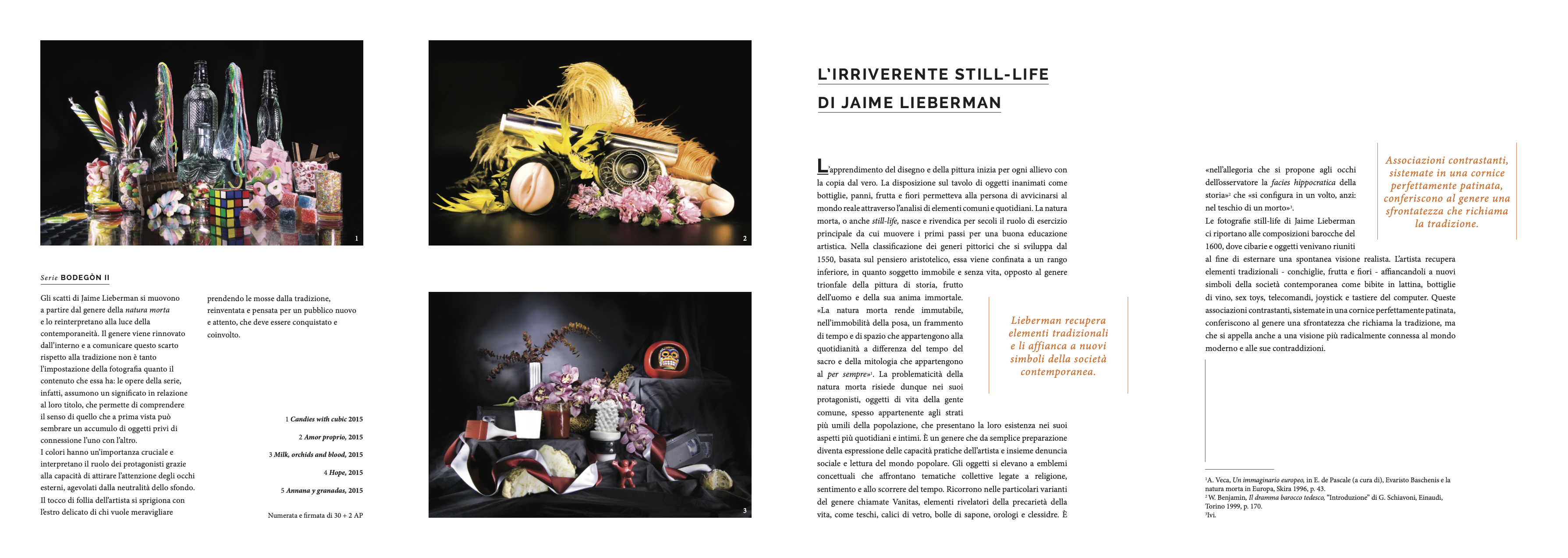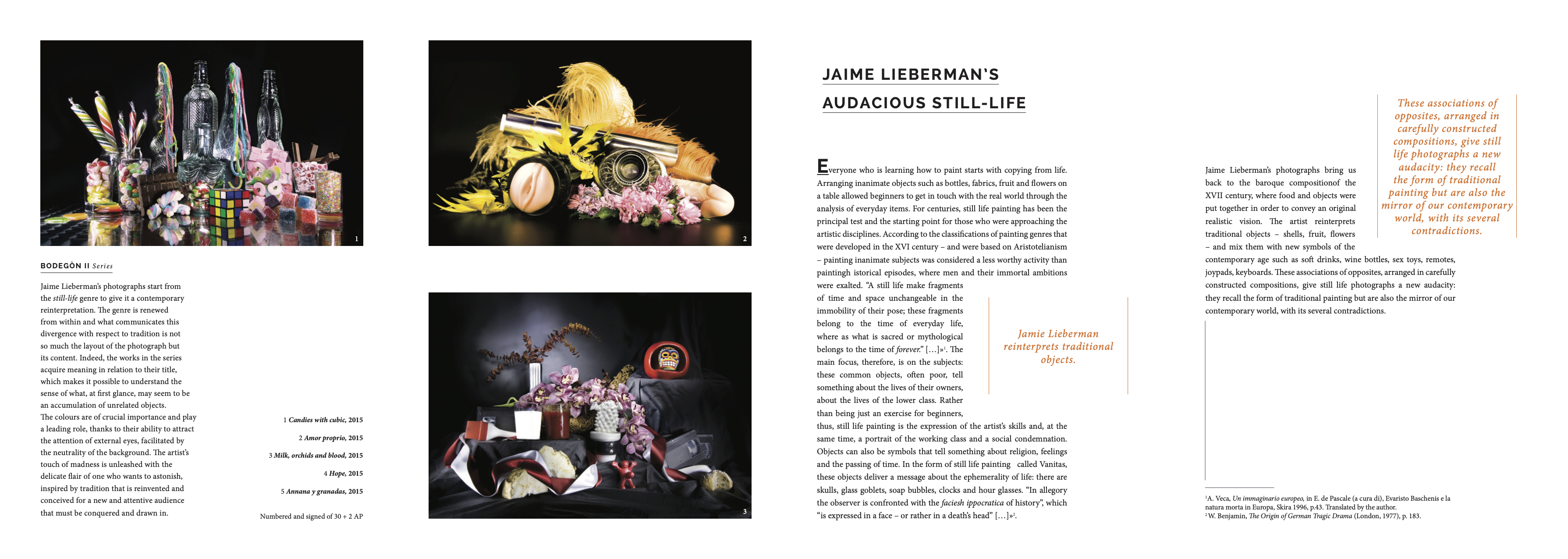EN After studying photography at the Escola Grisart in Barcelona, Jamie Lieberman commenced his promising career with a photo shoot for Soho Shop published in Vogue in 2007. He later continued his artistic path by collaborating with other authoritative periodicals such as Horizon Magazine, Revista Zero and Shanghai Magazine. In 2013 he participated in a collective exhibition entitled Points of View (Photography) at Galeria N.2 in Barcelona. At the gallery, he showed Verde Santo, the first work in an extensive series that takes a demystifying look at the still-life genre. The magazine Arte Fotografico examined this distinctive artistic aspect and that year it published an article on one of Lieberman’s most famous works, Bodegón: two eccentric photo series in which he proposes this reinterpretation with erotic shading. The following year – 2014 – he participated in the Semana Cultural de Sallent and was also one of the key figures in a collective exhibition staged at the Teatro La Massa in Vilassar de Dalt. In 2015 he was a guest at Art Photo Barcelona, a photographic festival of emerging artists and specialized galleries. There he showed abstract photographs in which black backgrounds are crossed by cracks of polychrome lights. IT Jaime Lieberman, a seguito degli studi in fotografia presso la Escola Grisart di Barcellona, inizia la sua promettente carriera con la realizzazione di un servizio fotografico per Soho Shop su Vogue nel 2007. Successivamente il suo percorso artistico prosegue grazie anche alla collaborazione con altre autorevoli testate giornalistiche come Horizon Magazine, Revista Zero e Shanghai Magazine. Nel 2013 partecipa ad una esposizione collettiva intitolata Points of View (Photography) presso la Galeria N.2 di Barcellona. In questa sede espone la sua opera Verde Santo, la prima di una lunga serie che decodifica il genere still life in chiave demistificante. Proprio su questa sua peculiarità artistica si sofferma la rivista Arte Fotografico, la quale pubblica nello stesso anno un articolo su uno dei suoi lavori più celebri, Bodegón: due eccentriche serie fotografiche in cui propone proprio questa reinterpretazione dall’erotica ombreggiatura. L’anno seguente, nel 2014, partecipa alla Semana Cultural de Sallent ed è inoltre tra i protagonisti di una mostra collettiva allestita presso il Teatro La Massa a Vilassar de Dalt. Nel 2015 verrà ospitato da Art Photo Barcelona, festival fotografico di artisti emergenti e gallerie specializzate. Qui espone fotografie abstract dove fondali neri vengono attraversati da fenditure di luci policromatiche.