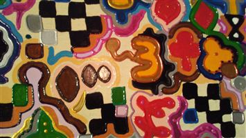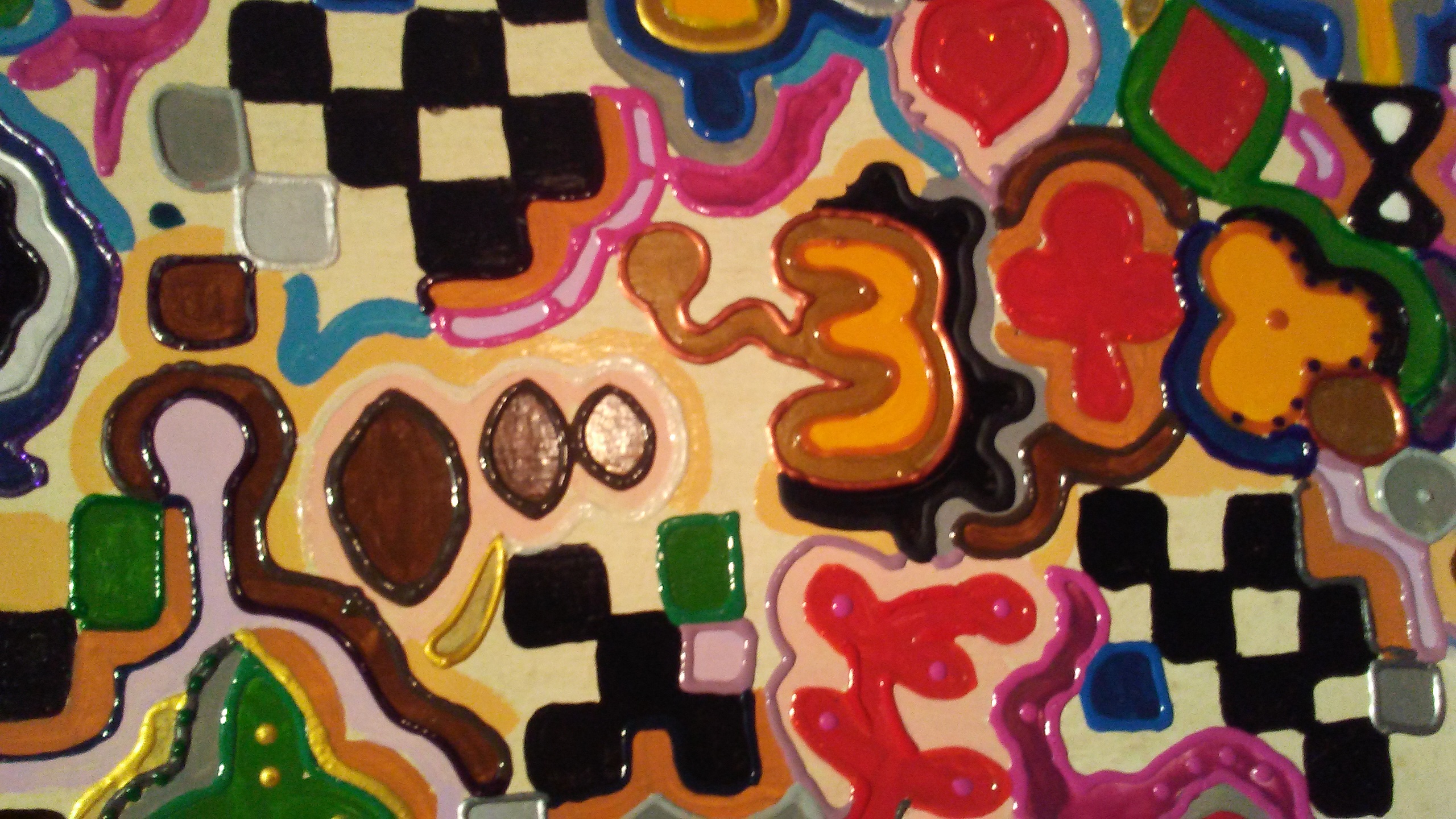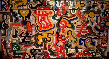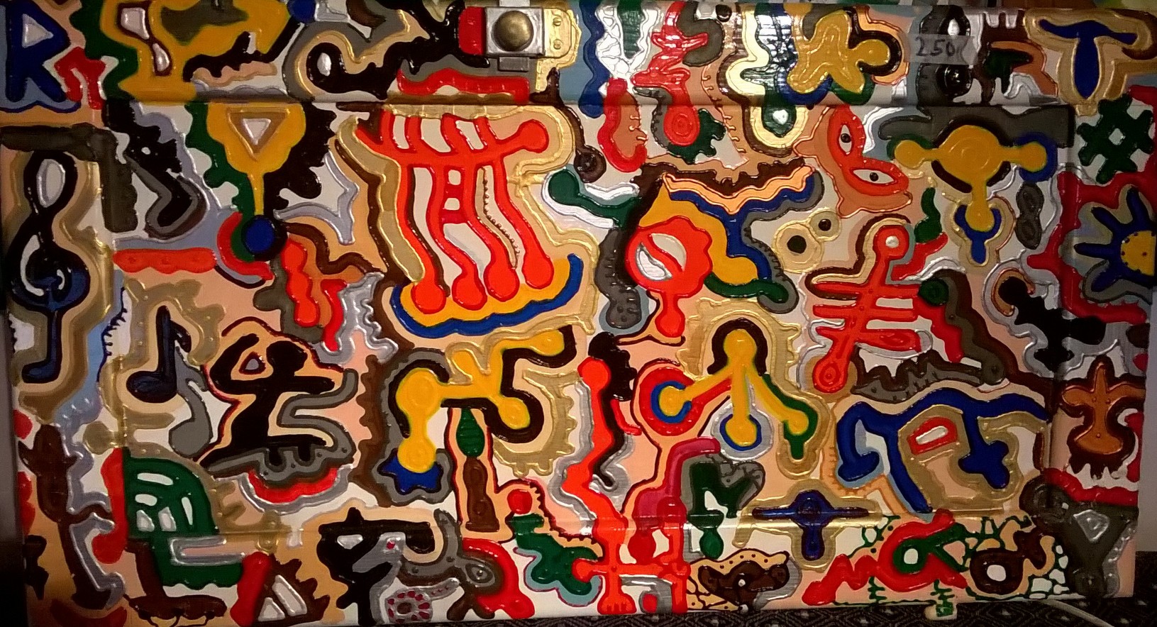 QUADRO ASTRATTO A TECNICA MISTA A RILIEVO , REALIZZATO SU UNO SCURO DI LEGNO. RAPPRESENTA UN MIX DI SIMBOLI NUMERI E COLORI INSPIRATI A RUOTA LIBERA