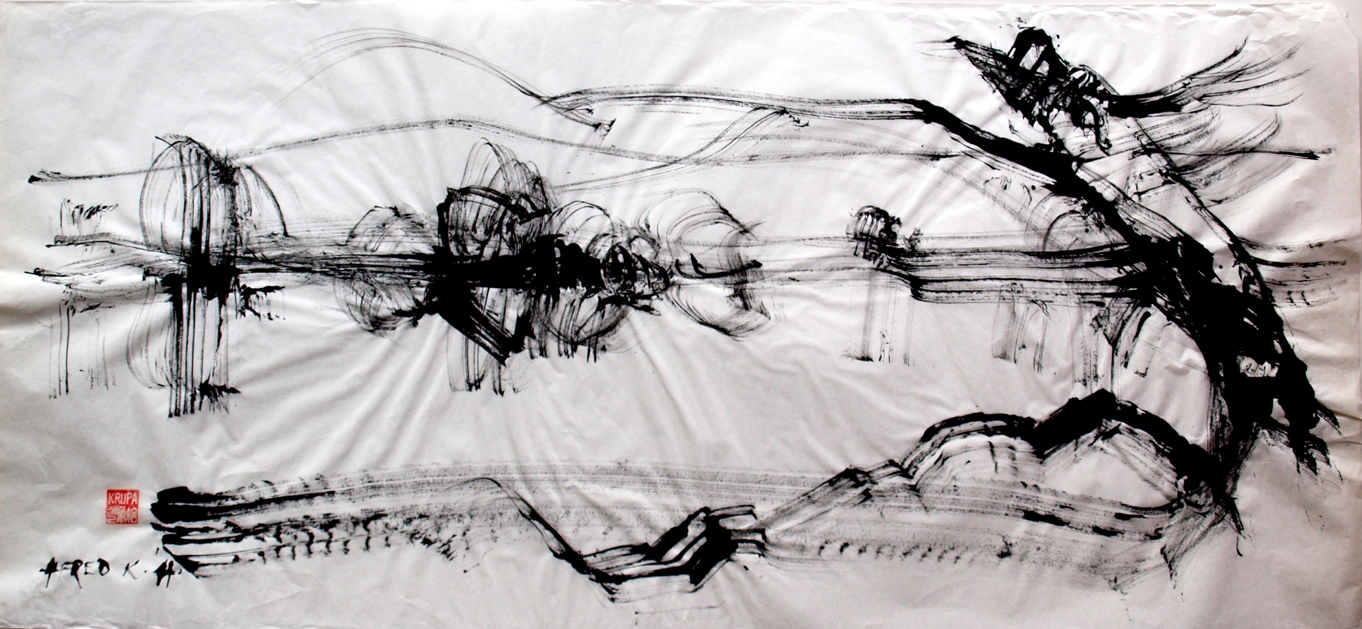 CONTEMPORARY INK ART WITH A TRADITIONAL JAPANESE CALLIGRAPHIC DESIGN, INTENSE MOVEMENTS, AND HIGHLY EMOTIONAL STYLE.