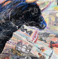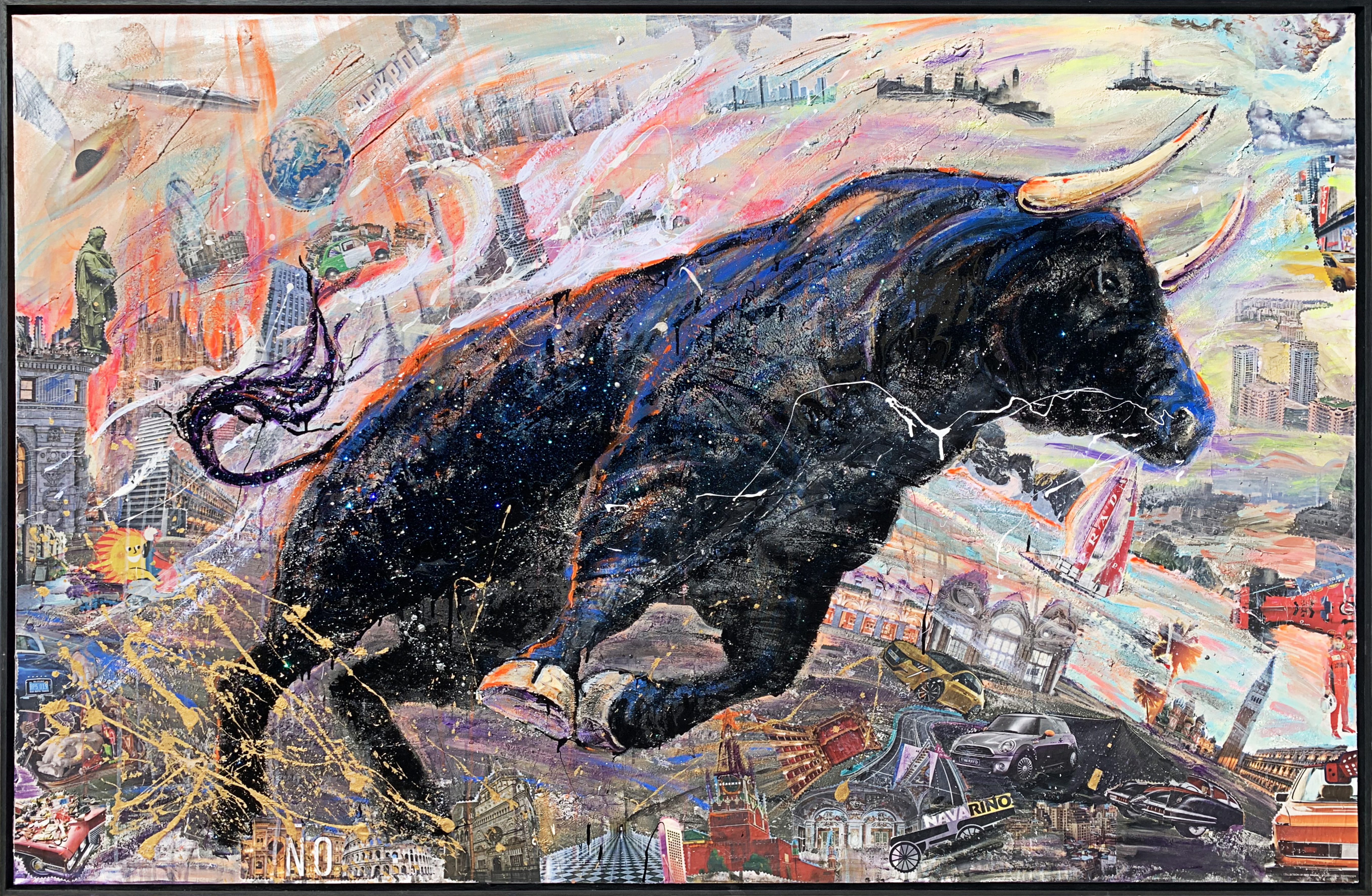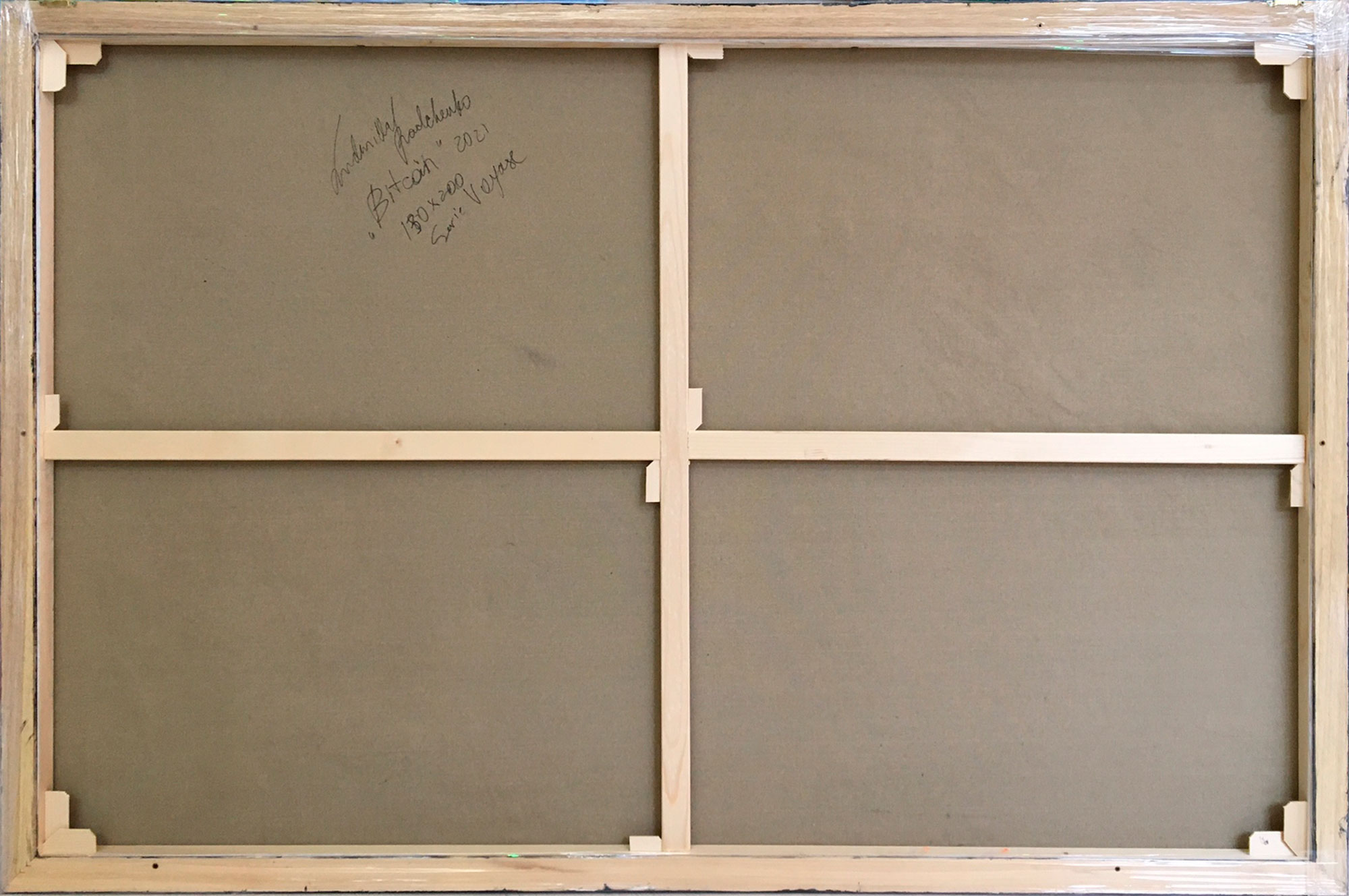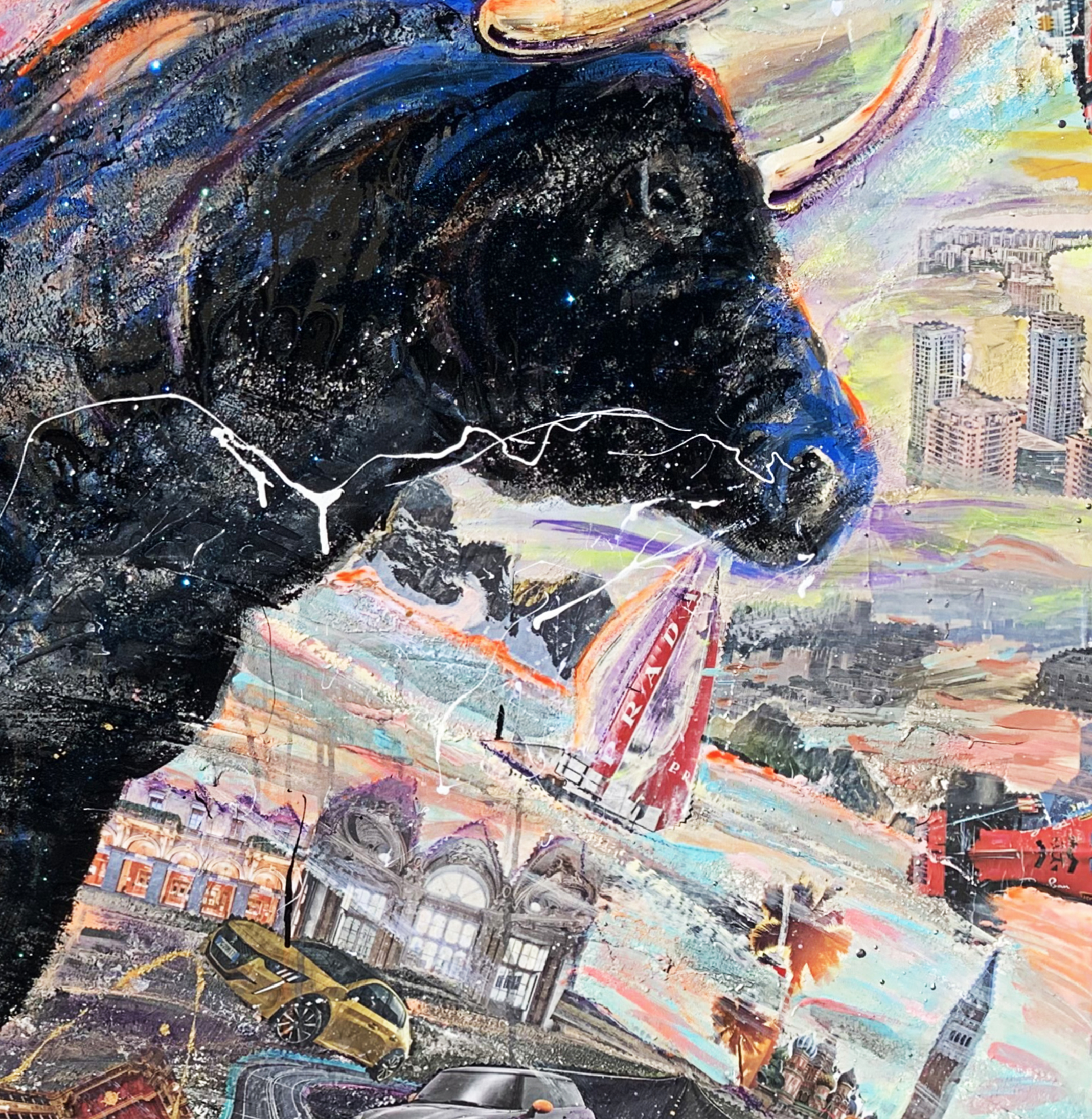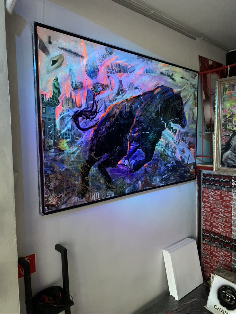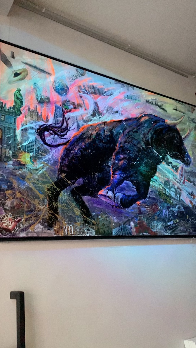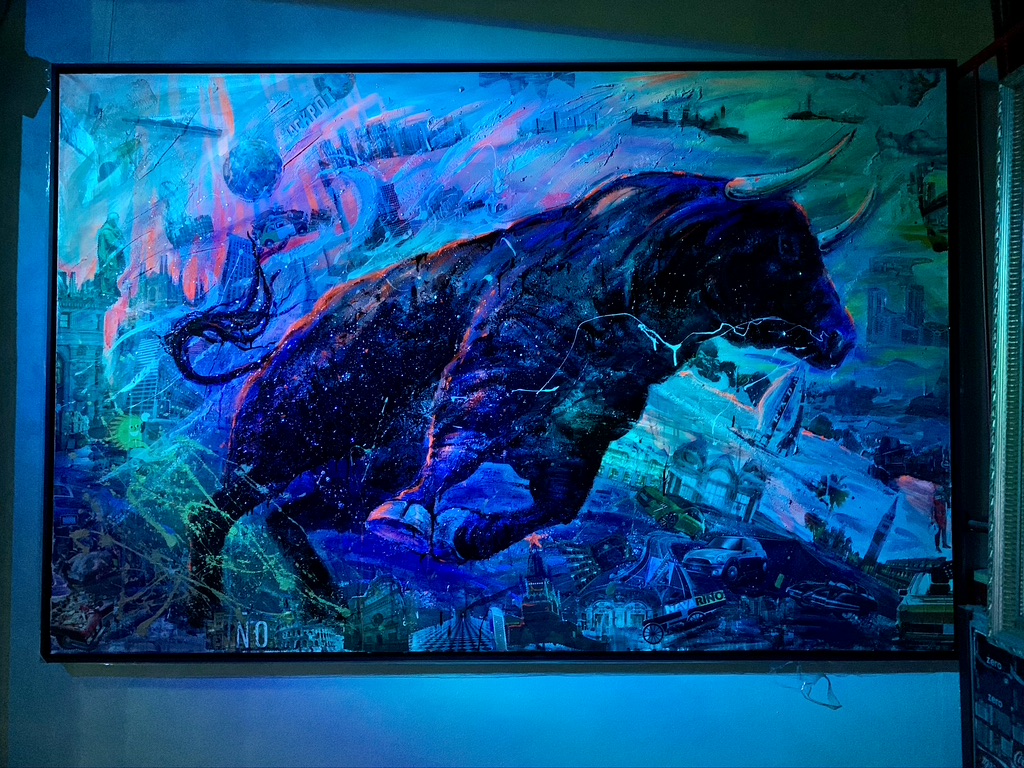 CHI CONOSCE IL FASCINO DELLE IMMAGINI, CHI NE HA CONTEMPLATE E ANALIZZATE TANTE, DISPONE DI QUELLO CHE POTREMMO CHIAMARE UN SENSO ICONICO E SA CON CERTEZZA CHE ESISTE UNA SORTA DI INTELLIGENZA PARTICOLARE CHE FA SÌ CHE GLI ARTISTI RIESCANO AD EMANCIPARSI DAL LINGUAGGIO, TRASFORMANDO UN'IMMAGINE IN UN SIMBOLO. LA RADCHENKO, SCEGLIE UN TORO, COME SIMBOLOGIA DEL MONDO FINANZIARIO, ED UN TITOLO PER QUEST'OPERA: "BITCOIN" CHE CONTRADDISTINGUE UN'EPOCA, LA NOSTRA. L'ANIMALE SEMBRA INCURANTE DELLA BIDIMENSIONALITÀ DELLA TELA, E CON LA FORZA CHE DA SEMPRE LO CONTRADDISTINGUE, ESCE LETTERALMENTE DALLE BARRIERE IMPOSTE. L'IMMAGINE DIVENTA TERRENO D’INCONTRO DOVE I PROCESSI CULTURALI POSSONO DIVENTARE SOGGETTIVI. PROPRIO IN VIRTÙ DI TALE COMPLESSITÀ, PERDE LA SUA APPARENTE COERENZA E SI TRASFORMA QUI, DIVENTANDO LOTTA CONTRO LA STATICITÀ ECONOMICA, IN VIRTÙ DELLA FORZA E DELL'OSTINAZIONE PRESENTI NEL TORO, E NELL'ESSERE UMANO. METAFORE LINGUISTICHE E METAFORE ICONICHE, SI DIMOSTRANO INDISPENSABILI ALLEATE, PER L'INTERPRETAZIONE DI QUEST'OPERA. THOSE WHO KNOW THE CHARM OF IMAGES, THOSE WHO HAVE CONTEMPLATED AND ANALYZED SO MANY, HAVE WHAT WE COULD CALL AN ICONIC SENSE AND KNOW WITH CERTAINTY THAT THERE IS A SORT OF PARTICULAR INTELLIGENCE THAT MAKES IT POSSIBLE FOR ARTISTS TO BE ABLE TO EMANCIPATE THEMSELVES FROM LANGUAGE, TRANSFORMING A IMAGE IN A SYMBOL. RADCHENKO CHOOSES A BULL, AS A SYMBOL OF THE FINANCIAL WORLD, AND A TITLE FOR THIS ARTWORK: "BITCOIN" WHICH DISTINGUISHES AN ERA, OURS. THE ANIMAL SEEMS HEEDLESS OF THE TWO-DIMENSIONALITY OF THE CANVAS, AND WITH THE STRENGTH THAT HAS ALWAYS DISTINGUISHED IT, IT LITERALLY COMES OUT OF THE IMPOSED BARRIERS. THE IMAGE BECOMES A MEETING GROUND WHERE CULTURAL PROCESSES CAN BECOME SUBJECTIVE. PRECISELY BY VIRTUE OF THIS COMPLEXITY, IT LOSES ITS APPARENT COHERENCE AND IS TRANSFORMED HERE, BECOMING A STRUGGLE AGAINST ECONOMIC STATIC, BY VIRTUE OF THE STRENGTH AND OBSTINACY PRESENT IN THE BULL, AND IN THE HUMAN BEING. LINGUISTIC METAPHORS AND ICONIC METAPHORS PROVE TO BE INDISPENSABLE ALLIES FOR THE INTERPRETATION OF THIS ARTWORK.