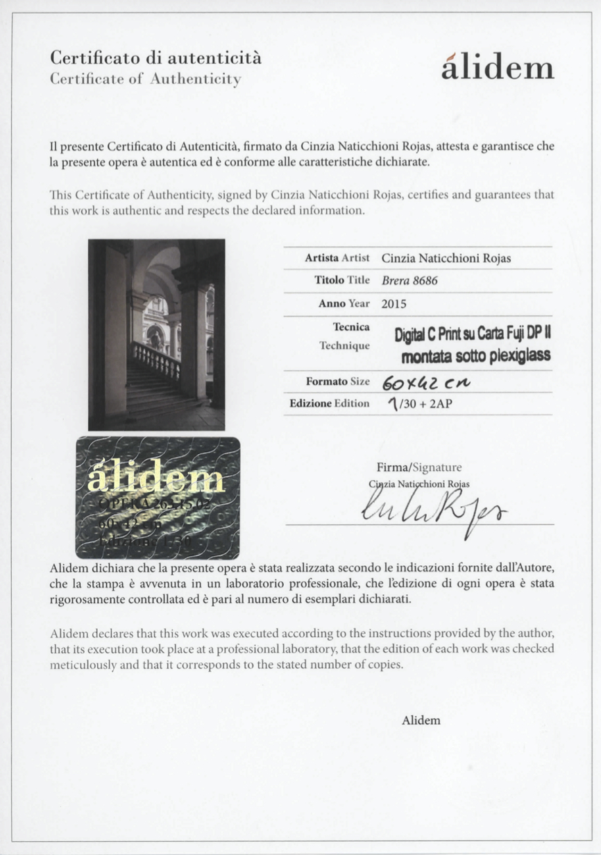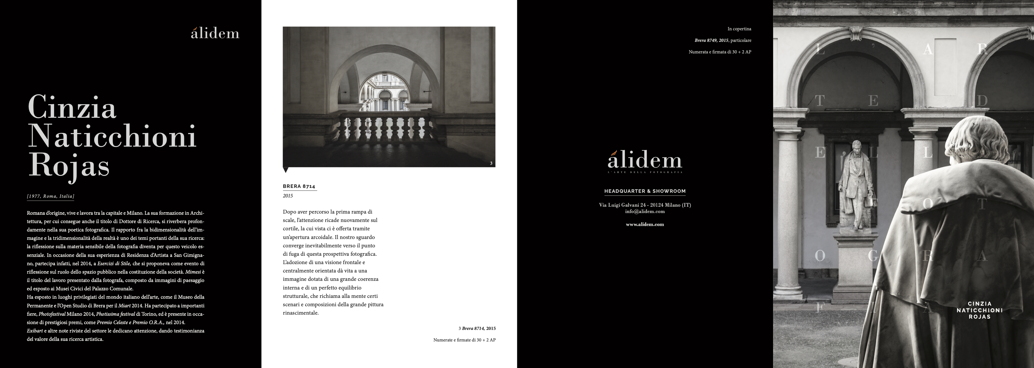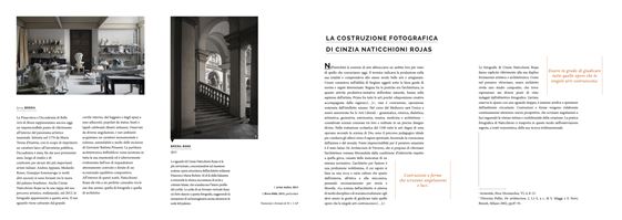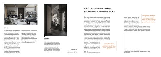 EN Born in Rome, Cinzia Naticchioni Rojas lives and works between the Italian ca- pital and Milan. Her education as an Architect, that she carried on to a PhD level, strongly reflects in her photographic vision. The relation between two-dimensional images and a three-dimensional reality is one of the main themes of her work; therefore, a meditation on the perceivable subjects of photography is one of the essential messages of her shots. While on a residency program in San Gimignano in 2014, she took part in Esercizi di Stile, an event that focused on how public spaces can contribute to shape society. Mimesi, the work she presented upon this occasion, was a series of landscape photos and was exhibited at the Musei Civici del Palazzo Comunale. Her works have been displayed at some of the most prominent Italian locations for artwork, such as the Museo della Permanente and the Open Studio Brera during the Miart 2014. She also participated in important art fairs, like the Photofestival Milano 2014, the Photissima Festival in Turin, and competed for prestigious prizes like the Premio Celeste and the Premio O.R.A. in 2014. The attention Exibart and other renowned magazines pay to Cinzia Naticchioni Rojas’s work is a reflection of the value of her artistic research. IT Romana d’origine, vive e lavora tra la capitale e Milano. La sua formazione in Archi- tettura, per cui consegue anche il titolo di Dottore di Ricerca, si riverbera profon- damente nella sua poetica fotografica. Il rapporto fra la bidimensionalità dell’im- magine e la tridimensionalità della realtà è uno dei temi portanti della sua ricerca: la riflessione sulla materia sensibile della fotografia diventa per questo veicolo es- senziale. In occasione della sua esperienza di Residenza d’Artista a San Gimigna- no, partecipa infatti, nel 2014, a Esercizi di Stile, che si proponeva come evento di riflessione sul ruolo dello spazio pubblico nella costituzione della società. Mimesi è il titolo del lavoro presentato dalla fotografa, composto da immagini di paesaggio ed esposto ai Musei Civici del Palazzo Comunale. Ha esposto in luoghi privilegiati del mondo italiano dell’arte, come il Museo della Permanente e l’Open Studio di Brera per il Miart 2014. Ha partecipato a importanti fiere, Photofestival Milano 2014, Photissima festival di Torino, ed è presente in occa- sione di prestigiosi premi, come Premio Celeste e Premio O.R.A., nel 2014. Exibart e altre note riviste del settore le dedicano attenzione, dando testimonianza del valore della sua ricerca artistica.