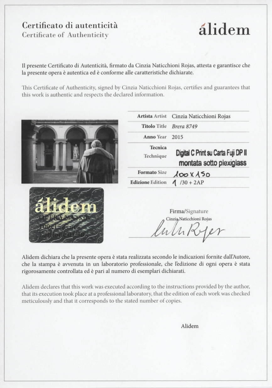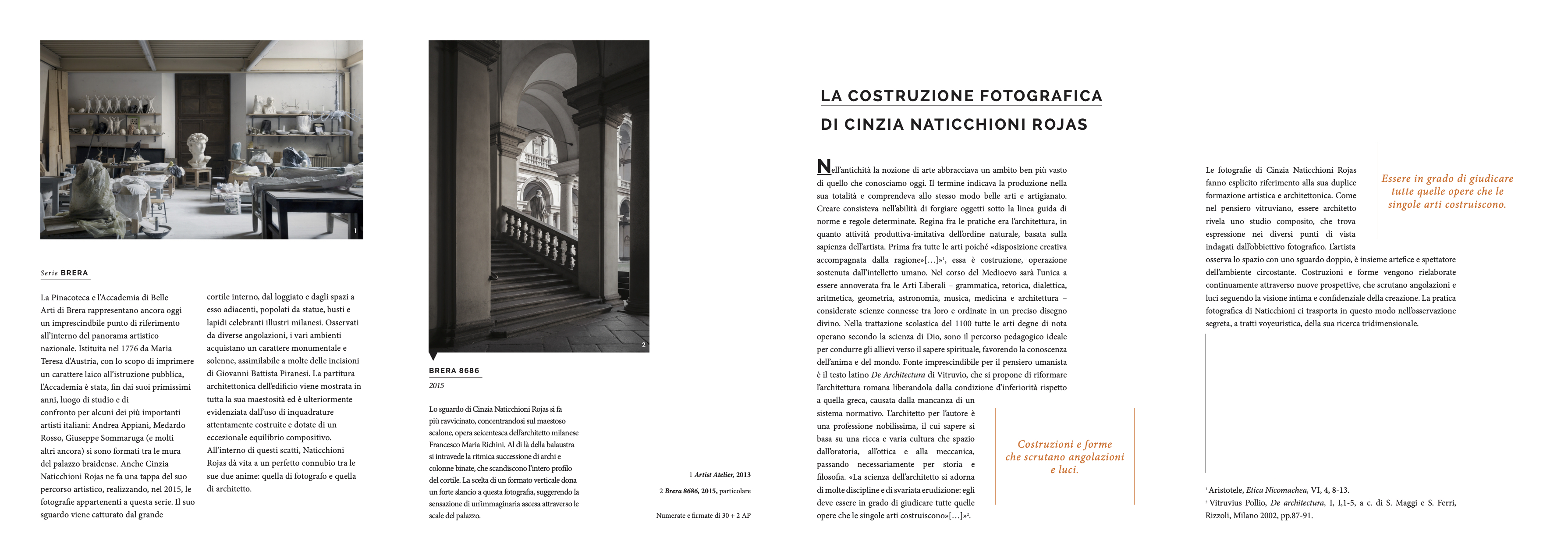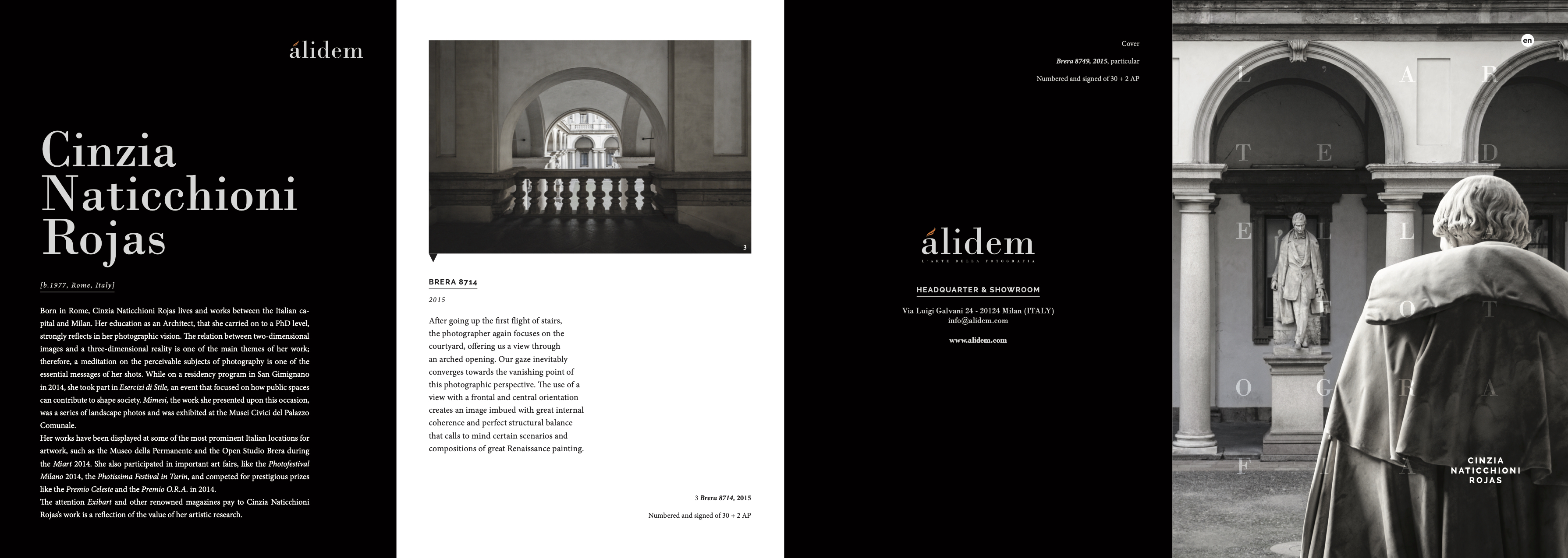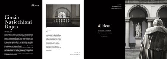 EN Born in Rome, Cinzia Naticchioni Rojas lives and works between the Italian ca- pital and Milan. Her education as an Architect, that she carried on to a PhD level, strongly reflects in her photographic vision. The relation between two-dimensional images and a three-dimensional reality is one of the main themes of her work; therefore, a meditation on the perceivable subjects of photography is one of the essential messages of her shots. While on a residency program in San Gimignano in 2014, she took part in Esercizi di Stile, an event that focused on how public spaces can contribute to shape society. Mimesi, the work she presented upon this occasion, was a series of landscape photos and was exhibited at the Musei Civici del Palazzo Comunale. Her works have been displayed at some of the most prominent Italian locations for artwork, such as the Museo della Permanente and the Open Studio Brera during the Miart 2014. She also participated in important art fairs, like the Photofestival Milano 2014, the Photissima Festival in Turin, and competed for prestigious prizes like the Premio Celeste and the Premio O.R.A. in 2014. The attention Exibart and other renowned magazines pay to Cinzia Naticchioni Rojas’s work is a reflection of the value of her artistic research. IT Romana d’origine, vive e lavora tra la capitale e Milano. La sua formazione in Archi- tettura, per cui consegue anche il titolo di Dottore di Ricerca, si riverbera profon- damente nella sua poetica fotografica. Il rapporto fra la bidimensionalità dell’im- magine e la tridimensionalità della realtà è uno dei temi portanti della sua ricerca: la riflessione sulla materia sensibile della fotografia diventa per questo veicolo es- senziale. In occasione della sua esperienza di Residenza d’Artista a San Gimigna- no, partecipa infatti, nel 2014, a Esercizi di Stile, che si proponeva come evento di riflessione sul ruolo dello spazio pubblico nella costituzione della società. Mimesi è il titolo del lavoro presentato dalla fotografa, composto da immagini di paesaggio ed esposto ai Musei Civici del Palazzo Comunale. Ha esposto in luoghi privilegiati del mondo italiano dell’arte, come il Museo della Permanente e l’Open Studio di Brera per il Miart 2014. Ha partecipato a importanti fiere, Photofestival Milano 2014, Photissima festival di Torino, ed è presente in occa- sione di prestigiosi premi, come Premio Celeste e Premio O.R.A., nel 2014. Exibart e altre note riviste del settore le dedicano attenzione, dando testimonianza del valore della sua ricerca artistica.