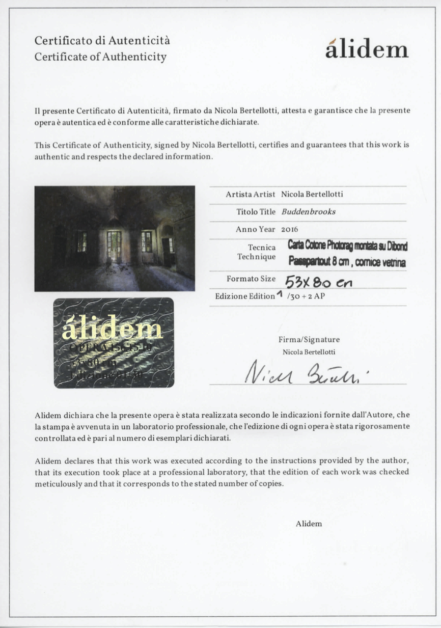 EN After studying history at the University of Pisa, Nicola Bertellotti developed a personal vision oriented towards an aesthetic of decline, in which the sense of the fleetingness of all things is profoundly rooted. His research emerged in his first solo exhibition, Fenomenologia della Fine, held in the province of Lucca in 2013. The exhibition was staged again in 2014, in Pisa, and the same year Petrartedizioni published the catalogue with essays by Pier Luigi Pinelli, entitled Fenomenologia della Fine. In 2014 Bertellotti participated in the European Photographic Festival (Busto Arsizio), where he exhibited Damnatio Memoriae, and in Tuscany he featured with the exhibition Focus on/ così com’è that Francesca Sensi Arte a Colori Galleria devoted to him. He participated in the Affordable Art Fair and the Set Up Art Fair in 2015. That year the #091LAB exhibition space (Palermo) devoted a solo show to him, Il lungo addio. In addition to photography, Bertellotti is also active at conferences and workshops. In 2016 he organized exhibition Hic Sunt Dracones at Castel dell’Ovo (Naples). In 2017 he realized the social project Blue eye at the Museum of Contemporary Art LIMEN, Permanent collection (Vibo Valencia) and in 2016 he took par in the CODICE MIA at the MIA Photo Fair (Milan). IT Dopo gli studi di storia presso l’Università di Pisa, Nicola Bertellotti elabora una personale visione orientata verso un’estetica della decadenza, in cui è profondamente radicato il senso di caducità di ogni cosa. La sua ricerca si concretizza nella prima mostra personale Fenomenologia della Fine che gli viene dedicata nel 2013 in provincia di Lucca. L’esposizione si ripete nel 2014, a Pisa, e nello stesso anno Petrartedizioni ne fa una pubblicazione con testi di Pier Luigi Pinelli. Nel 2014 prende parte al Festival Fotografico Europeo (Busto Arsizio) dove espone Damnatio Memoriae ed è protagonista in Toscana con la mostra Focus on/ così com’è che Francesca Sensi Arte a Colori Galleria gli tributa. Partecipa ad Affordable Art Fair e a Set Up Art Fair nel 2015. Nello stesso anno lo spazio espositivo #091LAB (Palermo) gli dedica la mostra personale Il lungo addio. Nicola Bertellotti è attivo nell’intervento a conferenze e workshop. Nel 2016 espone Hic Sunt Dracones a Castel dell’Ovo (Napoli). Nel 2017 realizza il progetto speciale Blue eye al Museo D’Arte Contemporanea LIMEN, Collezione Permanente (Vibo Valentia) e nel 2016 partecipa con CODICE MIA al Mia Photo Fair (Milano).