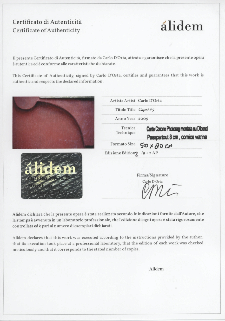 EN D’Orta, who was already a photographer for passion, decided to enhance his artistic aptitudes. He attended advanced painting and photography courses at the University of Fine Arts in Rome and IED in Milan: his photographic technique transformed completely. The artist started to dedicate himself to a style, which tends to artistic abstraction and makes the importance of the colour to stand out in such a way that his photographs result to be similar to pictorial representation. The object of his photography are often architectonical details, preferably taken out of contest, or portraits, deformed by the reflections of the glass walls, such as the ones in the two series of Berlin: il Bianco, il Grigio, la Luce e Vibrazioni . Meanwhile, he reached a peculiar surrealistic inclination, which found its highest expression in Paesaggi Surreali : the characteristic technique of using mirrors to deform the image gives value to the movement. Then, D’Orta obtained attention for his shapes and geometric abstraction and in 2013 he started the series (Re)FineArt. In this latter one he portrayed large refineries and industrial complex, reassessed from an artistic point of view. D’Orta returns back to tridimensionality with the series (S)Composizioni. Between 2012 and 2015 he created the series Liquidance for the Accademia Nazionale di Danza. In 2015 he took part in Art Fair (Romberg Contemporary Art Gallery). In 2016 he took part in the MIA Photo Fair with Biocities II, Traslazioni e Vibrazioni curated by Italo Bergamini. In 2017 his exhibition Italian Vibrations was at the National Museum of Singapore, with the sponsorship of the Italian Institute of Culture in Singapore. His artworks are conserved in many public collections, such the Contemporary Art Museum of Palazzo Calicola, Collezione 2.0 (Spoleto) and the Italian Institute of Culture in New York. He took part in several national and international completion, such as the Sony World Phtography Award and he exhibited his artwork in many public galleries in Italy and Germany; his interviews were published in Artitude (2011), AdToday (2014) and InsideArt (2016). IT Già fotografo per passione, nel 2003 D’Orta decide di approfondire le proprie attitudini artistiche. Frequenta corsi avanzati di pittura e fotografia presso la University of Fine Arts di Roma e lo IED di Milano: la sua tecnica fotografica subisce una completa trasformazione. L’artista inizia a dedicarsi a uno stile che tende all’astrazione e risalta l’importanza del colore, rendendo lo scatto molto vicino alla rappresentazione pittorica. Oggetto della sua fotografia è spesso un particolare architettonico, preferibilmente decontestualizzato, o ritratti deformati dai riflessi delle vetrate, centrali nelle due serie Berlino: il Bianco, il Grigio, la Luce e Vibrazioni. Nel frattempo matura una particolare inclinazione surrealista che trova massima espressione in Paesaggi Surreali: il movimento viene valorizzato con la particolare tecnica di specchi che deformano l’immagine. D’Orta torna, poi, all’attenzione per le forme e l’astrazione geometrica e nel 2013 avvia la serie (Re)FineArt, in cui ritrae grandi raffinerie e complessi industriali, qui rivalutati in chiave artistica. Torna di nuovo alla tridimensionalità con la serie (S)Composizioni. Tra il 2012 e il 2015 nasce la serie Liquidance, realizzata per l’Accademia Nazionale di Danza. Nel 2015 partecipa ad Arte Fiera (Romberg Arte Contemporanea Gallery). Nel 2016 partecipa al MIA Photo Fair con la personale Biocities II, Traslazioni e Vibra- zioni - a cura di Italo Bergantini. Nel 2017 è al National Museum di Singapore con Ita- lian Vibrations, col patrocinio dell’Istituto Italiano di Cultura a Singapore. Le sue opere sono presenti in collezioni pubbliche come il Museo di Arte Contemporanea Palazzo Collicola, Collezione 2.0 (Spoleto) e l’istituto Italiano di Cultura a New York. Partecipa a numerosi premi nazionali e internazionali come il Sony World Photography Award, presenta le proprie opere in numerose gallerie pubbliche in Italia, Germania e a New York; sue interviste sono pubblicate su Artitude (2011), AdToday (2014), InsideArt (2016).