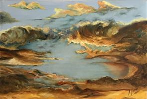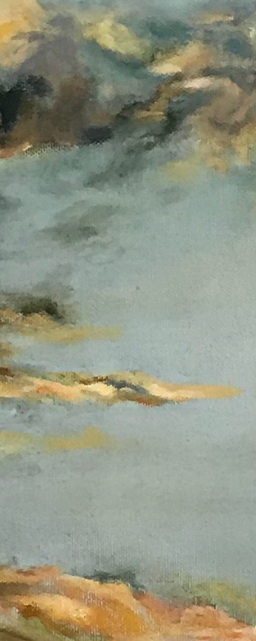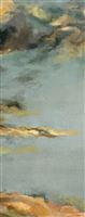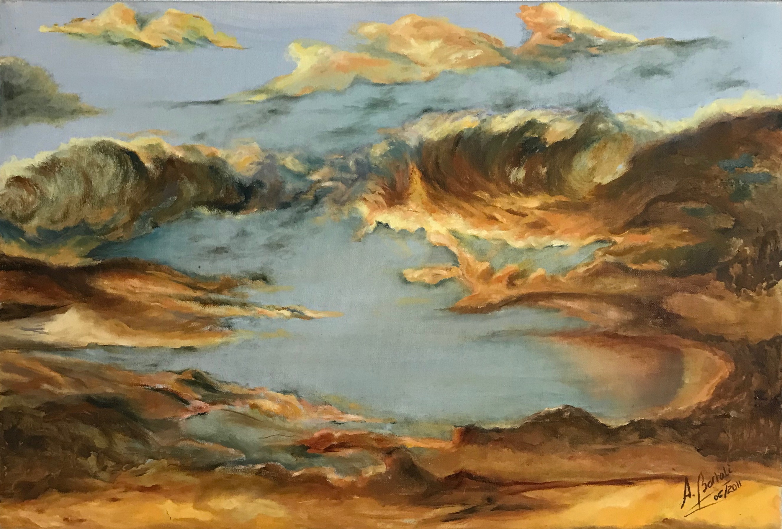 PREDOMINIO DE AMARILLOS, OCRES Y MARRONES DE LAS NUBES VAN DEFINIENDO UN PAISAJE SOBRE UN AZUL GRISÁCEO Y CLARO SIMULANDO UNA GRAN CALA QUE SE ABRE AL MAR EN LA LEJANÍA.