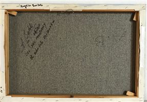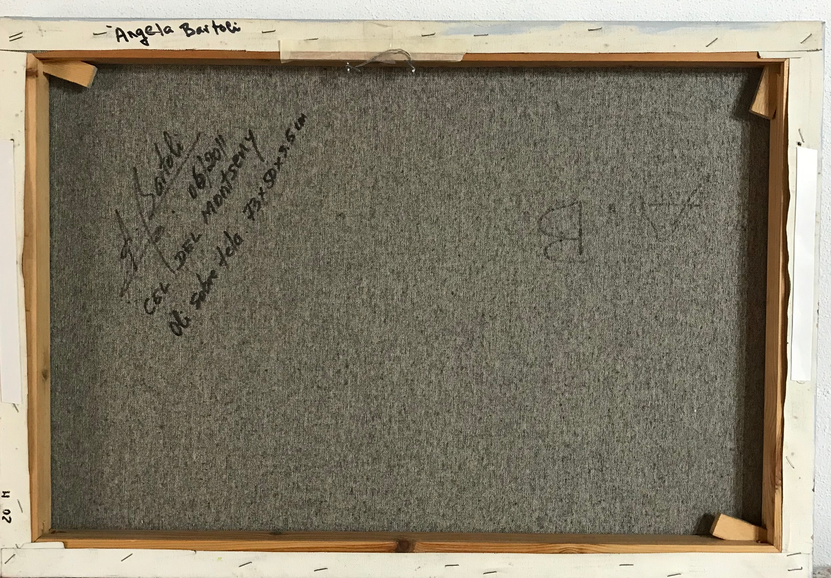 PREDOMINI DE GROCS, OCRES I MARRONS DELS NÚVOLS VAN DEFININT UN PAISATGE SOBRE UN BLAU GRISENC I CLAR SIMULANT UNA GRAN CALA QUE S’OBRE AL MAR EN LA LLUNYANIA.