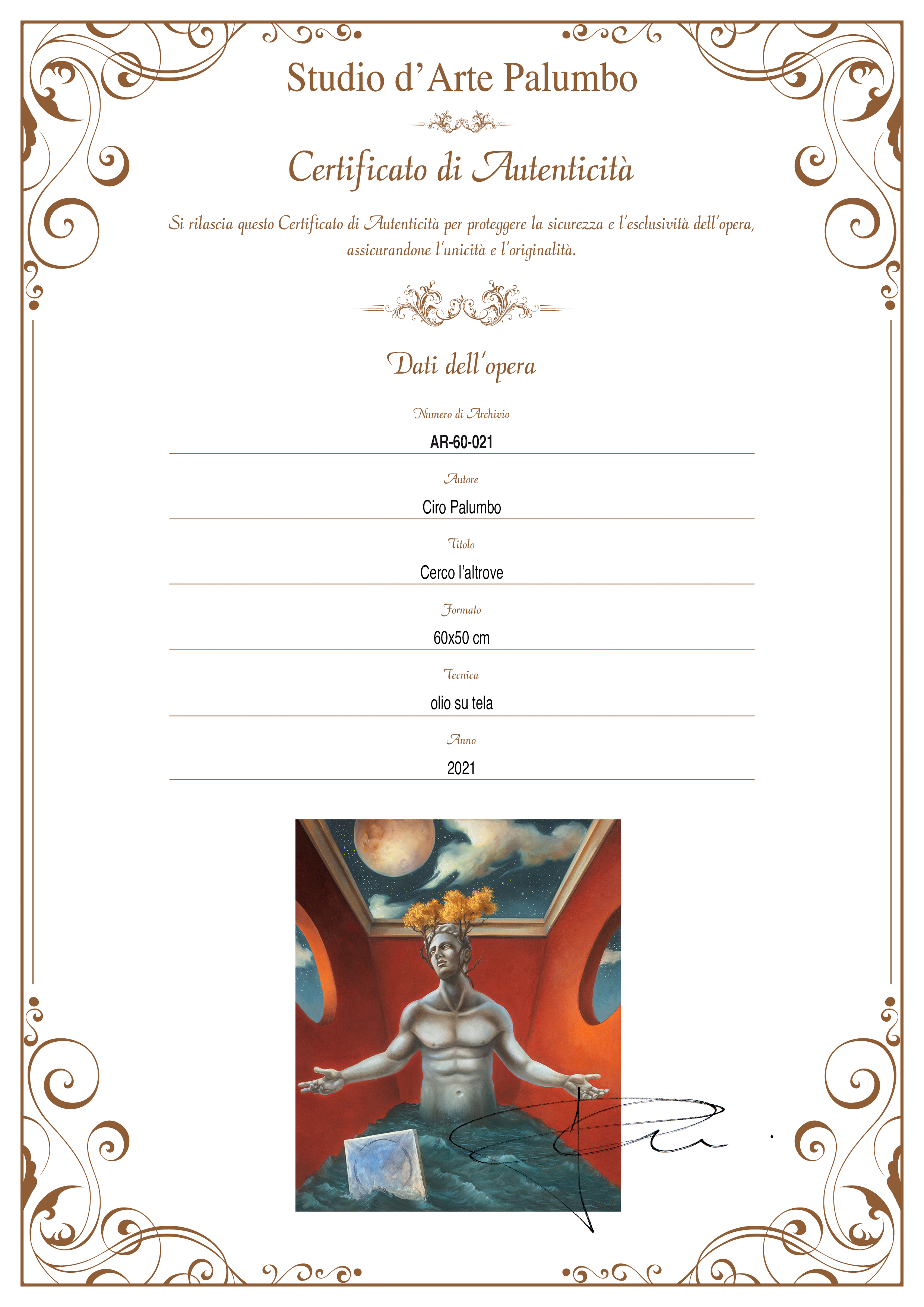 Nato a Zurigo nel 1965. Il suo percorso artistico prende l’avvio dalla poetica della scuola Metafisica di Giorgio de Chirico e Alberto Savinio, per reinventarne tuttavia i fondamenti secondo un’interpretazione personale del tutto originale. Nella sua ricerca procede attraverso momenti di contemplazione e silenzi metafisici, a cui si contrappongono espressività notturne e intimamente travagliate, dove si respira netto il distacco dall’immobilità silente che abita le tele del Pictor Optimus. Le sue opere si presentano dunque come palcoscenici in cui gli oggetti presenti sono portatori di simbologie oniriche. Ciro Palumbo non è solo un pittore, ma di fatto un poeta che riflette, agisce e compone per coniugare metafore sull’inafferrabilità del tempo e l’incommensurabilità dello spazio, mostrando quindi la sua capacità di approfondire l’osservazione non tanto della natura, quanto delle impressioni immaginifiche che provengono dalla memoria. Curioso ricercatore e studioso, lavora da qualche anno anche sul tema del Mito, interpretando la mitologia classica in chiave squisitamente moderna, e dandone una lettura profondamente colta e suggestiva. L’artista riesce dunque a sublimare e contestualizzare i miti antichi in spazi al di fuori del tempo, dimostrando la loro contemporaneità. La sua formazione di grafico pubblicitario lo porta ad esercitare per anni la professione di Art Director in Agenzie pubblicitarie di Torino. È durante questo percorso che scopre ed amplia le sue capacità visive e compositive. Successivamente, l’esperienza in una moderna bottega d’arte e la conoscenza di alcuni Maestri contemporanei, lo conducono ad approfondire la tecnica della pittura ad olio con velatura. Negli ultimi anni l’artista si dedica con successo anche alla scultura donando tridimensionalità, attraverso la terracotta, ai topos della sua poetica. Mostre ed eventi più recenti Mostre personali Rinascenza. Dolor et Furor a cura di Luca Cantore D’Amore presso Palazzo Velli Expo, Roma (in collaborazione con 7ettanta6ei Art, Milano) maggio 2021 Homo Viator. Il poeta visionario a cura di Salvo Daniele Torrisi presso Ex Chiesa del Carmine, Taormina (Me) (organizzata da Catania Art Gallery / con rappresentazione della pièce teatrale ispirata all’Homo Viator, scritta e interpretata da PierGiuseppe Francione) agosto 2020 Moby Dick mi disse a cura di Laura Tartarelli presso Laura Tartarelli Contemporary Art, Pietrasanta (Lu) luglio 2020 La pittura. Una finzione vera presso Castello Baronale di Minturno (Lt) (organizzata da Cristiano Art Gallery) 2019 Homo Viator. Il poeta visionario presso Stadio di Domiziano, Roma (organizzata da Canova Arte, Roma / con rappresentazione della pièce teatrale ispirata all’Homo Viator, scritta e interpretata da PierGiuseppe Francione) 2019 Rinascenza. Un risveglio per l’anima (all’interno della collettiva “Risvegli”) presso Museo civico di Palazzo della Penna, Perugia (organizzata da Michela Lupi e Antonello Turchetti / in collaborazione con 7ettanta6ei Art, Milano) 2019 The strenght of gods and heroes. La forza degli dei e degli eroi a cura di Angelo Crespi presso: . ST ART, Mondadori Megastore, Milano . Stadio di Domiziano, Roma 2018 Palumbo - Fellini. Immaginario surreale tra pittura e cinema (all’interno dell’Ischia Film Festival) presso Carcere Borbonico del Castello Aragonese d’Ischia, Ischia (Na) (organizzata da 7ettanta6ei Art, Milano) 2018 Rinascenza. La pittura, un segreto non ancora svelato presso Palazzo Medici Riccardi, Sale Fabiani, Firenze (organizzata da Riccardo Ferrucci / in collaborazione con 7ettanta6ei Art, Milano) 2018 Isole migranti a cura di Ivan Quaroni e Alessandra Redaelli presso Palazzo della Cultura, Catania 2017 Il volo del Poeta visionario con racconti in versi di Aldo Nove a cura di Alessandra Redaelli presso Sala Colonnato del Palazzo della Città Metropolitana di Bari, Bari 2016 Le Soglie dell’enigma a cura di Francesca Bogliolo presso Galleria Il Forte Antichità, Forte dei Marmi (Lu) 2016 Lo Spirito e la Carne a cura di Alessandra Redaelli presso Galleria Biffi Arte, Piacenza 2016 Homo Viator a cura di Flaminio Gualdoni / con testo di Riccardo Ferrucci presso Museo Piaggio, Pontedera (Pi) 2016 Sguardi eterni tra la terra e il cielo a cura di Alessandra Redaelli (organizzata dal MACS di Catania) presso: . MAUTO Museo Nazionale dell’Automobile di Torino . Castello di Schisò, Giardini Naxos (Me) . Castello Carlo V, Monopoli (Ba) 2015 I mulini di Dio a cura di Alessandra Frosini e Stefano Gagliardi (organizzata da ArToday Events, San Gimignano) presso Ex Ospedale San Rocco, Matera 2015 La solitudine di Prometeo Presso MACS Museo Arte Contemporanea Sicilia, Catania 2014 I mulini di Dio a cura di Alberto Agazzani (organizzata dalla Galleria Gagliardi, San Gimignano) presso Convento di Santo Spirito ex carceri, Nola (Na) 2014 Affinità silenti. Giorgio de Chirico e Ciro Palumbo a cura di Paolo Levi (organizzata da Sangiorgio International) presso Spazio Espositivo e Culturale della Società Bancaria Ticinese, Bellinzona, Svizzera 2014 Metafisiche visioni a cura di Stefania Bison presso Manni Art Gallery, Venezia Lido 2013 Islands and journeys. The color of silence presso Just Art - Contemporary Art Gallery, Providence (USA) 2013 Viaggi, naufragi, tempeste e nuove rotte a cura di Alberto D’Atanasio presso Galleria Arte Barbato, Scafati (Sa) 2013 Nuove terre e nuovi mari a cura di Alberto D’Atanasio presso Galleria Wikiarte, Bologna 2013 Al di là della realtà del nostro tempo presso Centrum Sete Sóis Sete Luas, Frontignan, Francia 2013 Il mistero dell’isola a cura di Alberto D’Atanasio presso CERP/Centro Espositivo Rocca Paolina, Perugia 2012 Paestum Arte 2012 (organizzata dall’ Associazione culturale G. Verdi) Paestum (Sa) 2012 Di aria, di acqua di terra, di fuoco, sono le sostanze dei sogni presso Civica Galleria d’Arte moderna “Giuseppe Sciortino”, Monreale (Pa) 2012 Il mistero dell