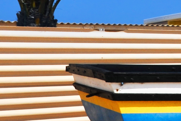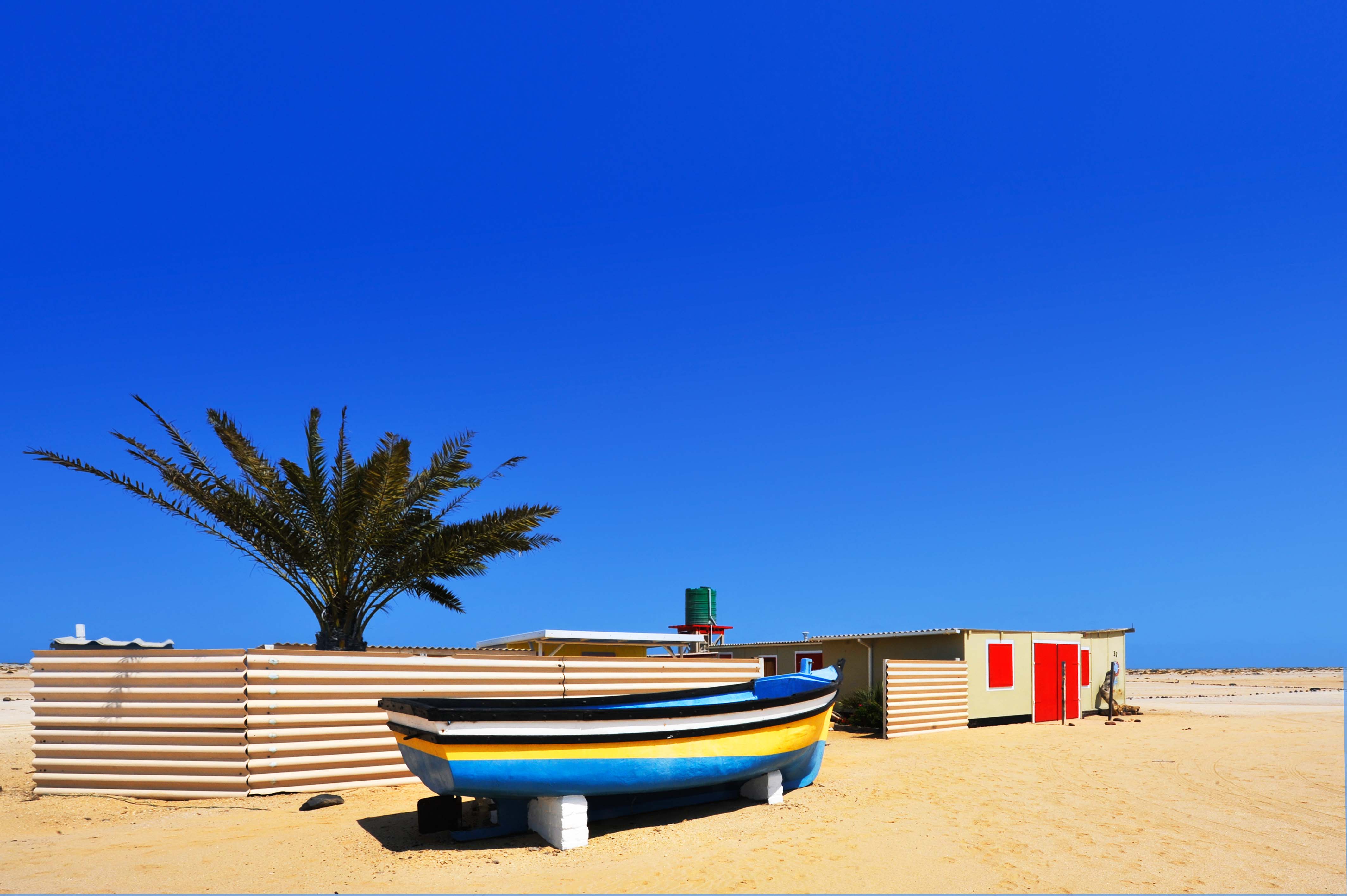 ON THE FLAT DESERT BEACH CLOSE TO SWAKOPMUND, IN NAMIBIA, SUDDENLY THE SURREAL VIEW OF A VIVID BOAT APPEARS, BREAKING THE MONOTONY OF THE LANDSCAPE. IT HAS THE SAME COLORS OF THE SAND AND OF THE SKY, MAYBE WAITING TO NAVIGATE ON THE ATLANTIC OCEAN BEYOND THE DESERT, LOOKING FOR FREEDOM. PRISONER OF THE HOLIDAYS' HOUSE REMAINS THE SHORT PALM TREE, FENCED BEHIND A METAL WALL, ITS BRANCHES WIDELY SPREADING TO EMBRACE THE VAST BLUE SKY ABOVE.