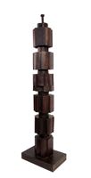 ES UNA OBRA QUE SE DESARTICULA MÓDULO POR MÓDULO HASTA LOS DOS ÚLTIMOS DE ABAJO QUE ESTÁN FIJOS A SU BASE DE MADERA Y ES MACIZA EN SU CENTRO TIENE UN MÓDULO VACIADO EN RESINA CON VIRUTAS DE MADERA ADENTRO PARA DAR FIDELIDAD A SU CONCEPTO DE FRAGMENTACIÓN