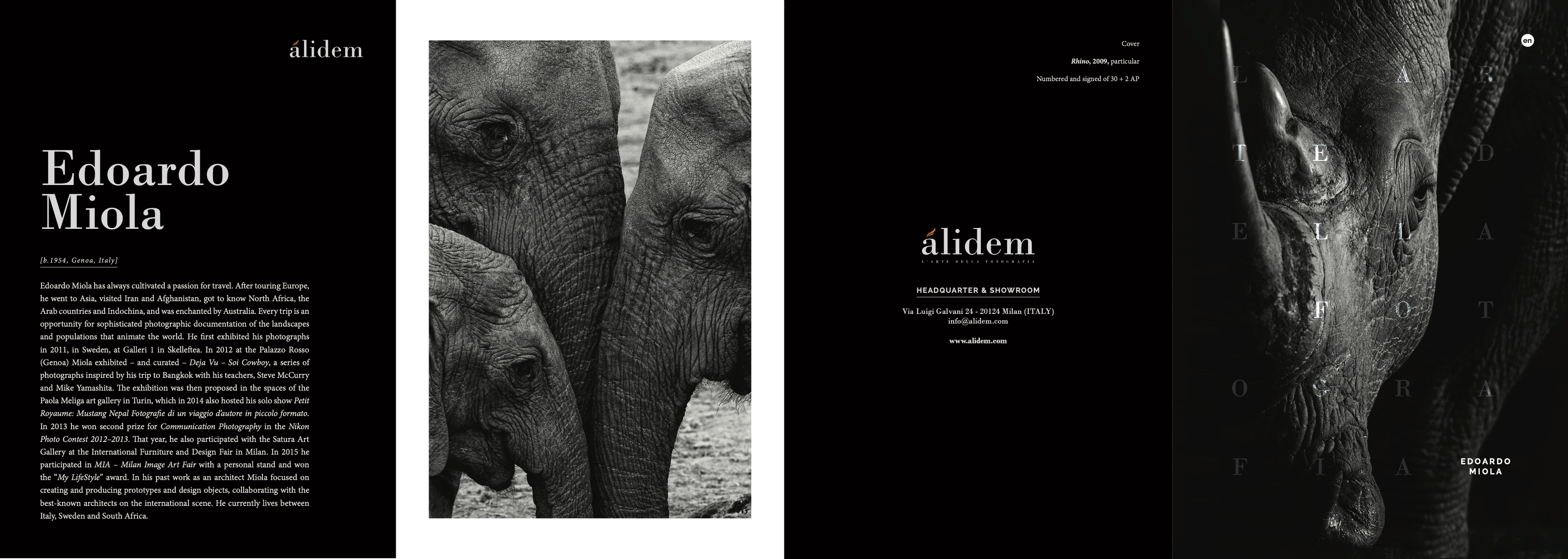 EN Edoardo Miola has always cultivated a passion for travel. After touring Europe, he went to Asia, visited Iran and Afghanistan, got to know North Africa, the Arab countries and Indochina, and was enchanted by Australia. Every trip is an opportunity for sophisticated photographic documentation of the landscapes and populations that animate the world. He first exhibited his photographs in 2011, in Sweden, at Galleri 1 in Skelleftea. In 2012 at the Palazzo Rosso (Genoa) Miola exhibited – and curated – Deja Vu – Soi Cowboy, a series of photographs inspired by his trip to Bangkok with his teachers, Steve McCurry and Mike Yamashita. The exhibition was then proposed in the spaces of the Paola Meliga art gallery in Turin, which in 2014 also hosted his solo show Petit Royaume: Mustang Nepal Fotografie di un viaggio d’autore in piccolo formato. In 2013 he won second prize for Communication Photography in the Nikon Photo Contest 2012–2013. That year, he also participated with the Satura Art Gallery at the International Furniture and Design Fair in Milan. In 2015 he participated in MIA – Milan Image Art Fair with a personal stand and won the “My LifeStyle” award. In his past work as an architect Miola focused on creating and producing prototypes and design objects, collaborating with the best-known architects on the international scene. He currently lives between Italy, Sweden and South Africa. IT Edoardo Miola da sempre coltiva la passione per i viaggi. Dopo l’Europa approda in Asia, visita Iran e Afghanistan, conosce il Nord Africa, i paesi Arabi, l’Indocina e si lascia incantare dall’Australia. Ogni viaggio è l’occasione per condurre ricercate documentazioni fotografiche su paesaggi e popolazioni che animano il mondo. Espone per la prima volta le sue fotografie nel 2011, in Svezia, presso la Galleri 1 di Skelleftea. Nel 2012 a Palazzo Rosso (Genova) espone, curandola in prima persona, Deja Vu - Soi Cowboy, la serie di scatti fotografici che nasce da un viaggio dell’autore a Bangkok con i suoi maestri Steve Mc Curry e Mike Yamashita. La mostra è riproposta collateralmente negli spazi della Galleria d’arte Paola Meliga di Torino, la stessa galleria che nel 2014 ospita la sua personale Petit Royaume: Mustang Nepal Fotografie di un viaggio d’autore in piccolo formato. Nel 2013 ottiene il secondo premio per la fotografia Communication al Nikon Photo Contest 2012-2013. Nello stesso anno, partecipa con Satura Art Gallery alla Fiera Internazionale dell’Arredamento e del Design di Milano. Nel 2015, partecipa a MIA – Milan Image Art Fair – con uno stand personale e vince il premio My LifeStyle. Nel suo passato di architetto si è concentrato sulla progettazione e sulla realizzazione di prototipi e oggetti di design, collaborando con i più noti architetti della scena mondiale. Attualmente vive tra l’Italia, la Svezia e il Sud Africa.