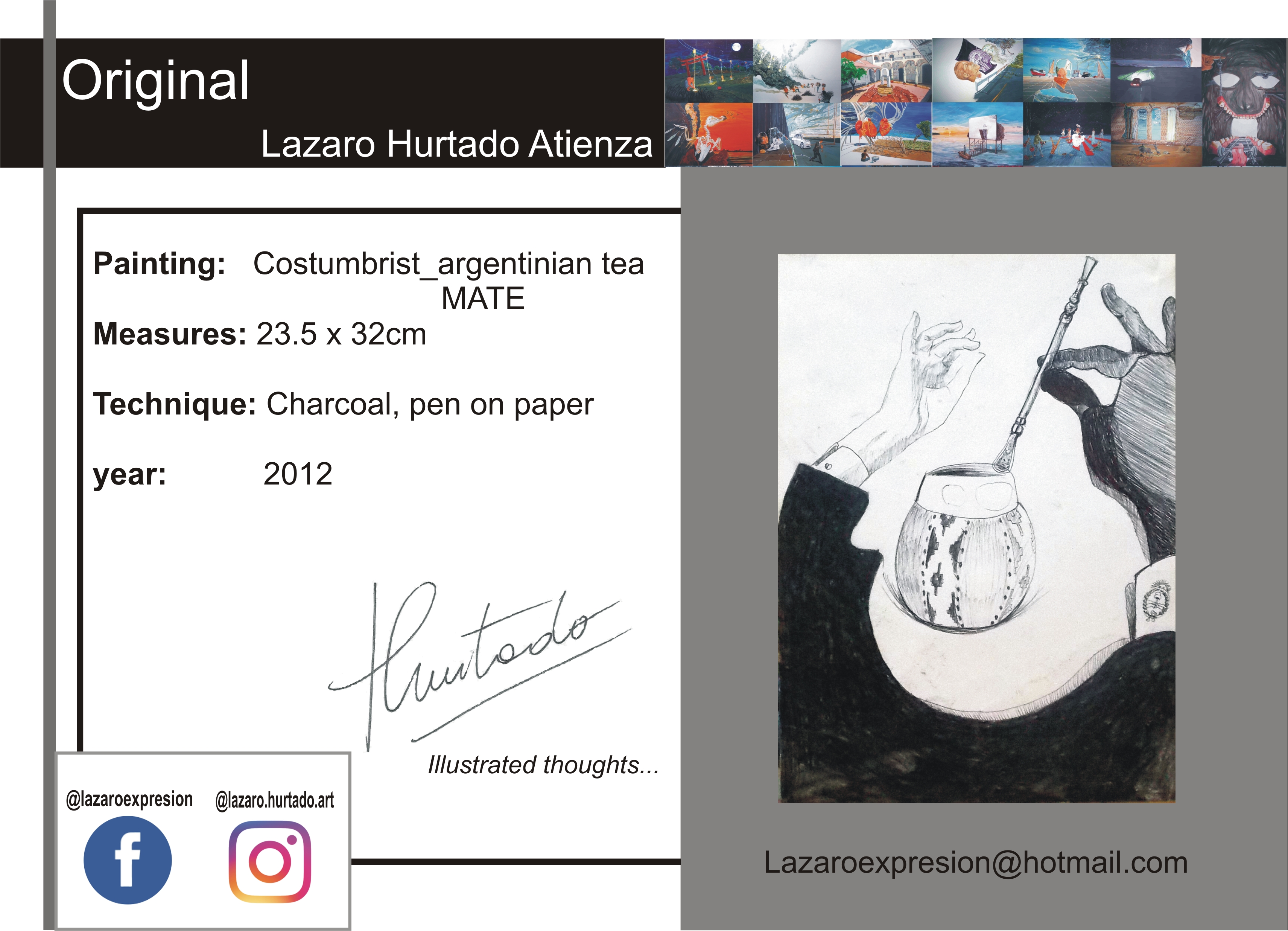 Lázaro Hurtado is an argentinian artist currently living in Buenos Aires, Argentina, were he works .Graduate Fine arts “ Bachillerato de Bellas Artes “ affiliated National University of La Plata. He states than more than an artist, he is a thinker.His work born from the necesity of expressing thoughts and conceptions of the World that surrounds him. The images he offers us project humanistic messages, the nature of mankind, the possible and the ridiculous. He makes comments about reality and the social forces and orders, but at the same time he demostrates a playful face, ironic in some cases. The transcription of inner alchemies into paintings of surrealist character wakes a curiosity in the viewer. The spectators would often find themselves been tickle by the ideas and concepts on reality and human behaviour that he seems to contemplate and rebuilt on his mind. The images you see are the working mechanics of a brain on a mind made world... Media: www.facebook.com/lazaroexpresion http://lazaro-hurtado.pixels.com http://www.redbubble.com/people/lazarohurtado https://twitter.com/lazaroexpresion 2019 _ Bio-Art Contest winner Excellence Prize . Seoul, South korea _ Premios a la Creación Artistica. Universidad de Belgrano. 27° Edición. Buenos Aires 2018 _ Artplu and Artron Art Auction: Western Modern & Contemporary Art _Picturesque Hotel . Wuxi, China 2017 _ X-Power Gallery Taipei . Taiwan _ Shenzhen International Art Fair. China _ Secoo 707 Deco Art Festival. China _ Artplu & Yidian China Art Auction:Western Contemporary Art Auction. China _ Art Nanjing- Baijiahu Art Mansion. China _ Art revolution Taipei 2017. Taiwan _ Get Art Museum Taipei, Taiwan 2016 _ Eggo Art Fair . Buenos Aires. _ ‘Thoughts’ curated by Tintin Yue JCCAC . Hong Kong _ 22 Salon de Pintura Palermo Viejo. Newbery Central Gallery. _ ‘Out of Gallery’ Hilton Hotel. Nanjin City. China _ Art Suning Plaza Collective Exhibition China _ Exposition at School Freud Lacan La Plata . Argentina 2015 _ Premio a la Creación Artística Universidad de Belgrano Buenos Aires _ Ar(t)gentina and Friends Castello Di Coazzolo (AT) Piemonte Italy _ Ar(t)gentina and Friends Pinacoteca Civica Camo ? Museo di Camo (CN) Piemonte Italy _ Ar(t)gentina and Friends Badnight Café Temporary Home Art Gallery Turín Italy _ ‘Illustrated thoughts’ Instituto de Capacitación Política. Argentina _ Museum of Contemporary Art, Artplu Shanghái, China _ 'Art on the Clouds', The Blue Skyline, Camphorwood, Wuxi City, China. _ " VIDEO KILLED THE ART STAR #2 "Spazio Arte 24, Via Corte 24, Dogliani Italy _ Tokyo International Art Fair Digital showcase Quest Hall Harajuku , Tokyo, Japan . _ Art Revolution Taipei 2015 Taiwan _ Arte La Plata stand unipersonal Argentina _ ‘ Colours of the World’ International Collective Exposition Bellas Artes. Museum And Academy., Bs As Argentina _ Motor Village Gallery City of Turin. Italy_ _ "il colori latini nell'arte contemporanea" Mondovi Piazza City of Mondovi, Cuneo, Italy 2014 _ ‘Becoming Conscience’ Cultural Centre Islas Malvinas Bs.As. Argentina _ 160th Stock Market Anniversary Buenos Aires. Argentina _ 1st Salón Municipal de Ilustration .La Plata . Argentina _ That Damned Show Detroit 2014 with a fineart canvas print ‘Lost sometimes’ USA