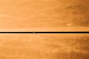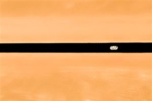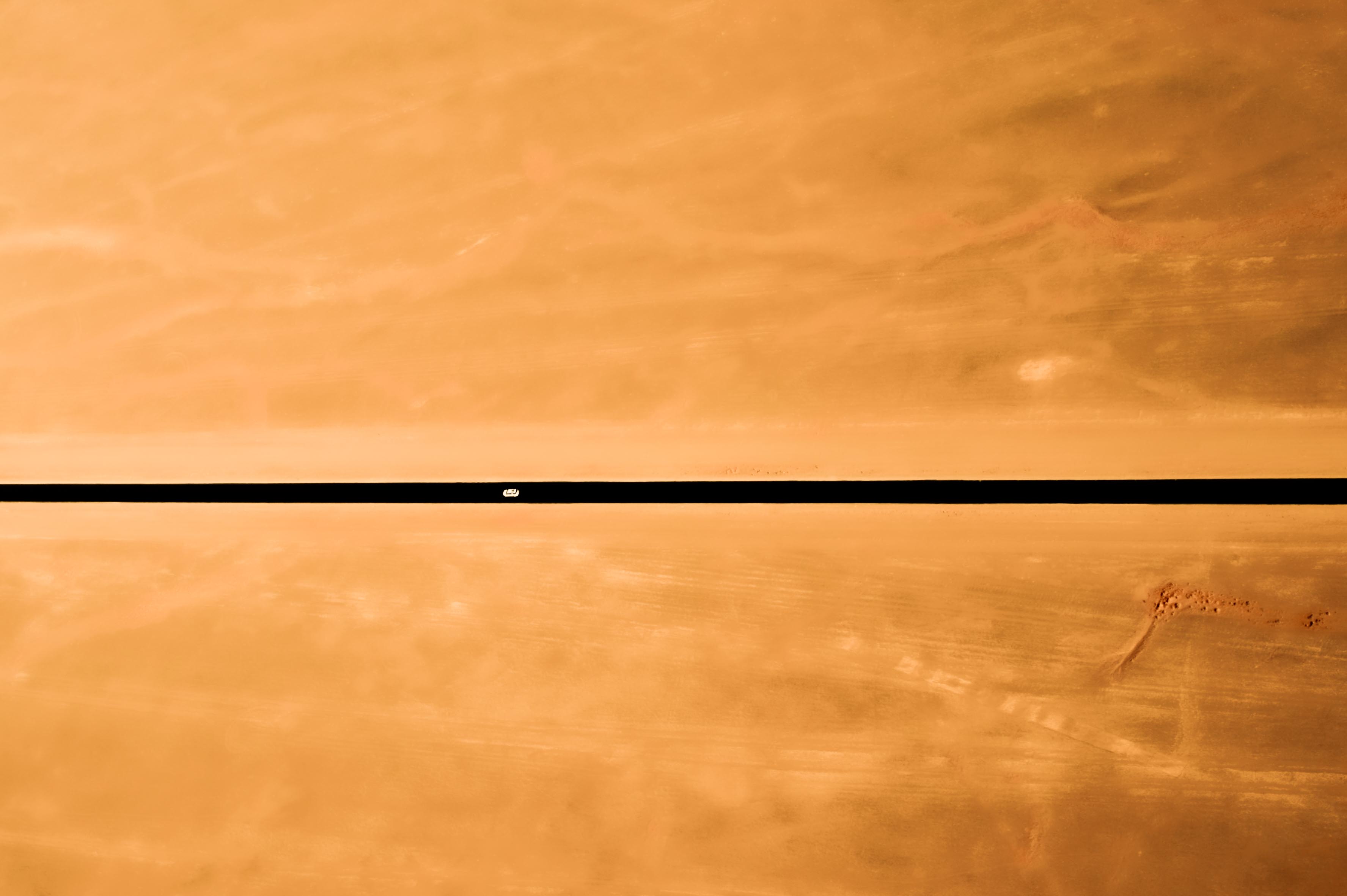 FLYING OVER THE NAMIBIAN DESERT TO PHOTOGRAPH THE HIGH DUNES AND THE UNCONTAMINATED LANDSCAPE.... THEN, ON WHAT SEEMS TO BE AN INFINITE FLAT EXPANSE OF SAND, A BLACK STRIP OF ASPHALT CHANGES THE LANDSCAPE LIKE THE PRECISE AND MERCILESS CUT OF A SHARP BLADE. IN THIS DESERT SCENARIO, A SINGLE WHITE CAR RUNS FAST TOWARDS AN UNKNOWN DESTINATION.