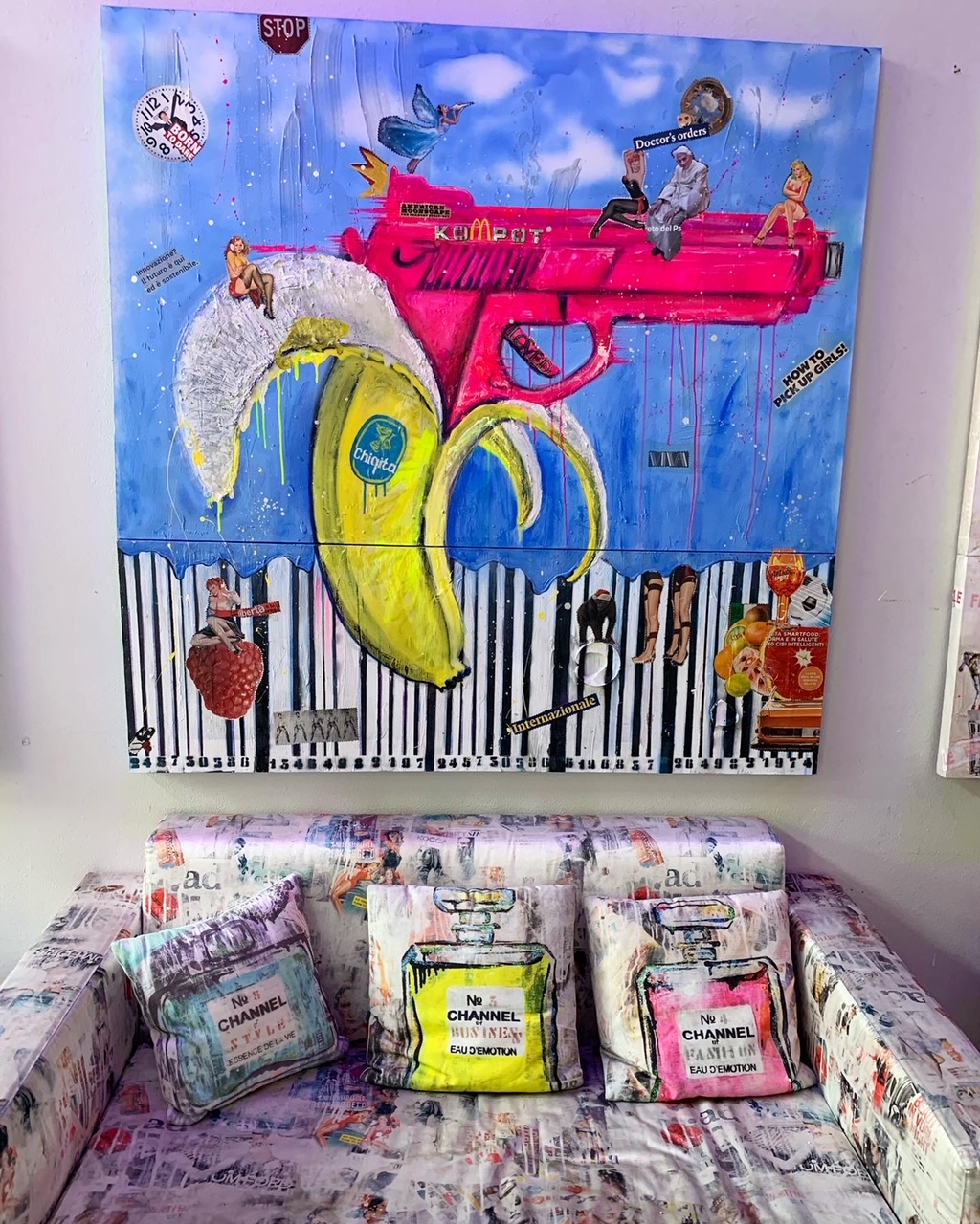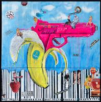 KOMPOT - LA TRADIZIONALE BEVANDA RUSSA, A BASE DI FRUTTA BOLLITA E IMMERSA IN SCIROPPO DI ZUCCHERO. E’ QUESTO IL NOME CHE L’ARTISTA SIBERIANA HA SCELTO PER LA SUA NUOVA SERIE ARTISTICA, L’ISPIRAZIONE DELLA QUALE PARTE DALL’IDEA DI RAPPRESENTARE I PIACERI DELLA VITA, IRONIZZANDO E GIOCANDO SULLA SESSUALITÀ MASCHILE E FEMMINILE ATTRAVERSO LE FORME SIMBOLICHE DEI PRODOTTI ALIMENTARI; UN VIAGGIO SENSORIALE AL QUALE L’ARTISTA CI INVITA, METTENDO ALLA PROVA IL SUO SPETTATORE E PROVOCANDOLO A DECIFRARE I DOPPI SENSI. ULTIMA OPERA REALIZZATA DI QUESTA SERIE, CITA DICHIARATAMENTE IL LAVORO DELL’ARTISTA LEGGENDARIO, SIMBOLO DELLA POP ART AMERICANA E ISPIRAZIONE QUOTIDIANA PER LA RICERCA DELLA PITTRICE SIBERIANA: ANDY WARHOL. LA BANANA DI WARHOL DIVENTA PROIETTILE DI UNA PISTOLA, CHE SPARA ALL’IMPROVVISO E FA RIFLETTERE LO SPETTATORE SUL SIGNIFICATO DELLE PROPRIE AZIONI E REAZIONI." AFTER A LONG JOURNEY OF CREATIVE EXPERIMENTATION, THE 40 YEARS HAVE STIMULATED THE ARTIST AND FASHION DESIGNER LUDMILLA RADCHENKO TO SEEK NEW IDEAS AMONG THE CONTRADICTIONS OF EVERYDAY LIFE. TODAY THE SIBERIAN PAINTER FEELS CONFORTABLE TO BE IRONIC ABOUT THE SOCIAL AND ECONOMIC CHAOS THAT PUTS US IN FRONT OF A CONTINUOUS PROVOCATION. IT IS UP TO US TO DECIDE WHICH IS THE LIMIT BETWEEN LOGIC AND LIGHTNESS, IN ORDER TO LIVE SERENE AND POSITIVE. KOMPOT - THE TRADITIONAL RUSSIAN DRINK, BASED ON BOILED FRUIT AND DIPPED IN SUGAR SYRUP. THIS IS THE NAME THAT THE SIBERIAN ARTIST HAS CHOSEN FOR HER NEW ARTISTIC SERIES, THE INSPIRATION OF WHICH, STARTS FROM THE IDEA OF REPRESENTING THE PLEASURES OF LIFE, MAKING FUN AND PLAYING ON, MALE AND FEMALE SEXUALITY THROUGH THE SYMBOLIC FORMS OF FOOD PRODUCTS; A SENSORY JOURNEY WHERE THE ARTIST INVITES US, PUTTING HER VIEWER BY TESTING AND PROVOKING HIM TO DECODE THE DOUBLE MEANINGS. LAST WORK OF THIS SERIES, EXPLICITLY MENTIONS THE WORK OF THE LEGENDARY ARTIST, SYMBOL OF AMERICAN POP ART AND DAILY INSPIRATION FOR THE RESEARCH OF THE SIBERIAN PAINTER: ANDY WARHOL. WARHOL'S BANANA BECOMES A GUN'S BULLET, WHICH SHOOTS SUDDENLY AND MAKES THE VIEWER REFLECTS ON THE MEANING OF THEIR ACTIONS AND REACTIONS. "