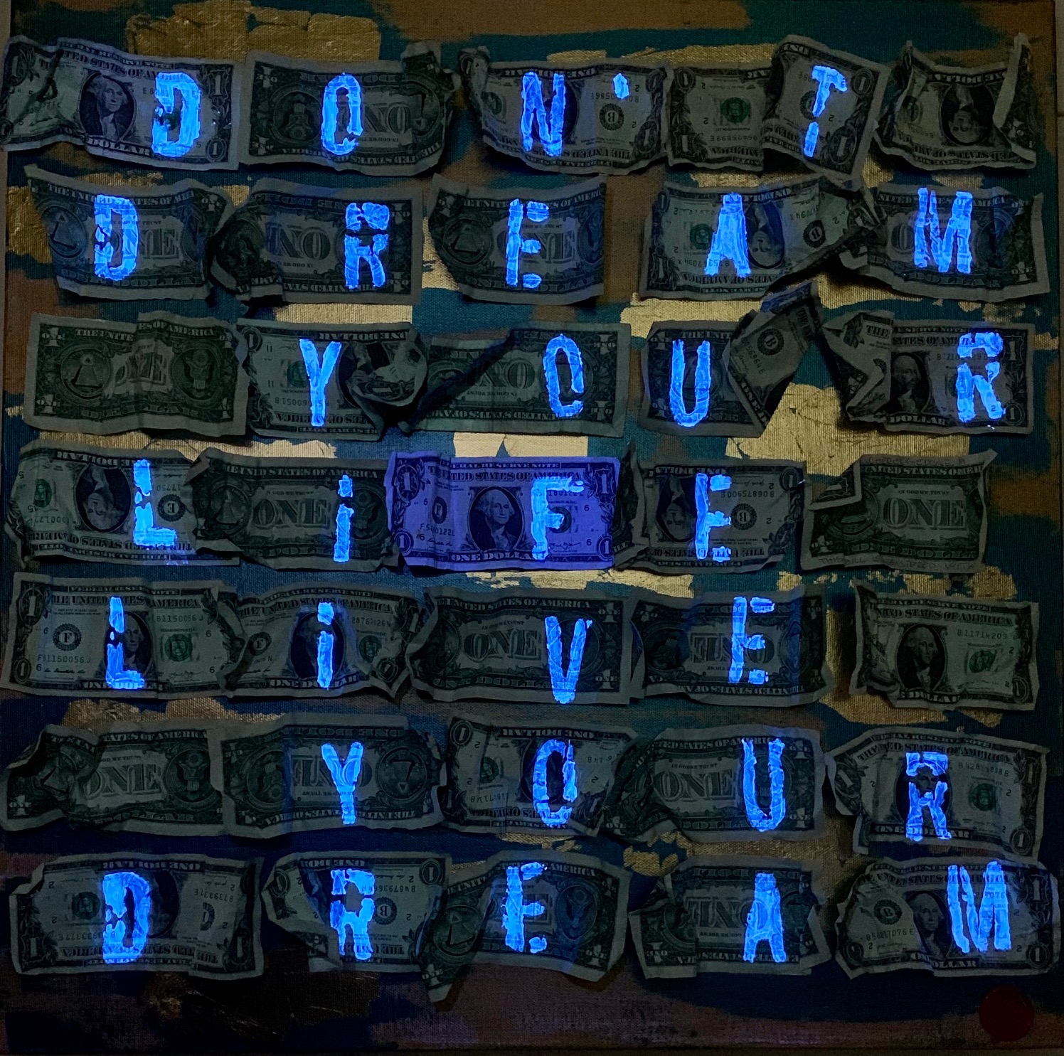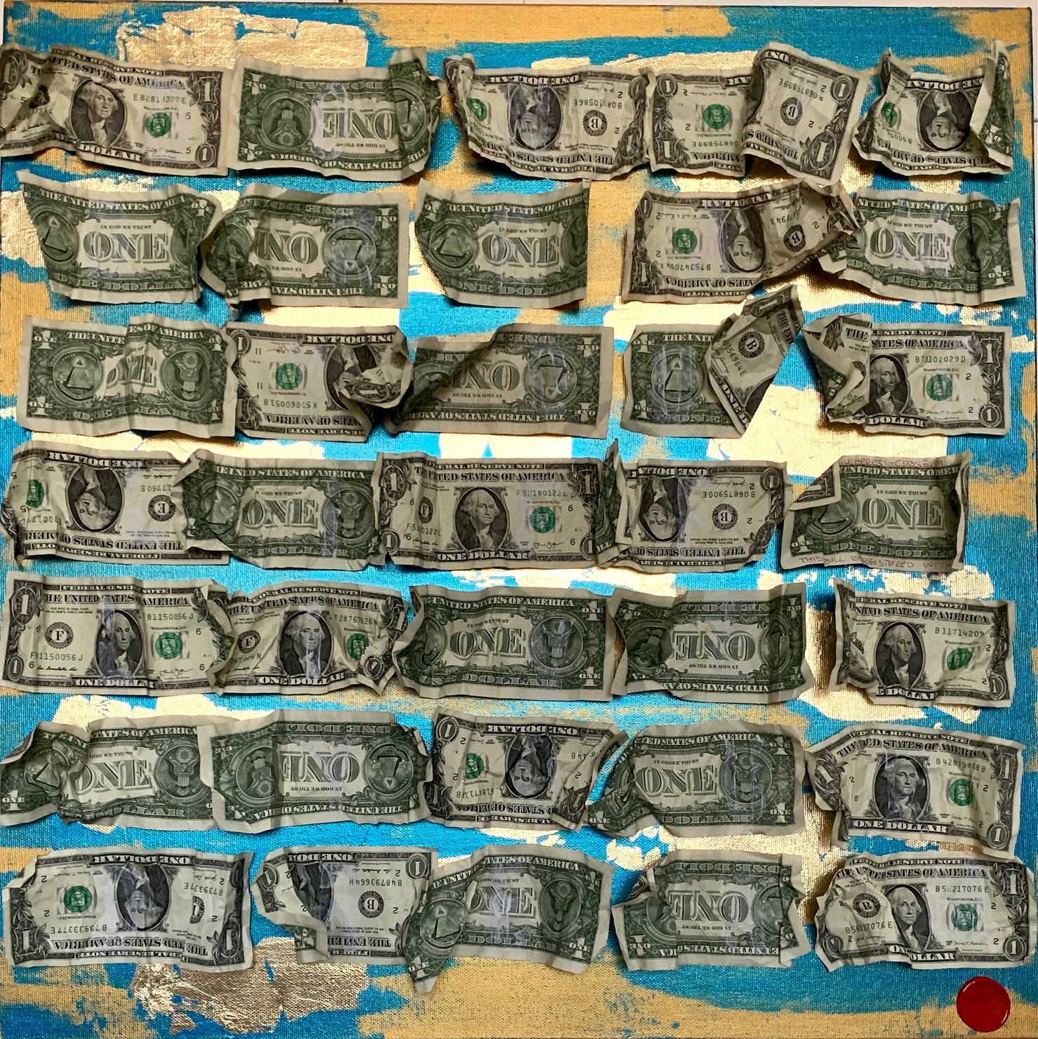 REVOLUTION COLLECTION MATERIAL TECHNIQUE, ACRYLIC METALLIC TORQUOISE AND GOLD COLOR ON CANVAS WITH GOLD AND US $ 1 BILLS APPLICATION. AMERICAN DOLLARS HAVE BECOME - IN THE WESTERN WORLD - THE SYMBOLS OF DREAMS, OF UNION, OF PERSONAL AND INDIVIDUAL FREEDOM, OF HOPES, OF RESEARCH AND OF "THINK FREE". WRITING IS CARRIED THE OUT IN TRANSPARENT AND PHOTOSENSITIVE COLOR. IT IS NECESSARY TO ILLUMINATE THE ARTWORK WITH WOOD LIGHT AND THE WORDS THAT WILL MAKE THE ARTWORK UNIQUE AND MAGICAL WILL APPEAR. THESE WORKS HIDE A SECRET, A BILL IS MARKED ON THE SITE WWW.WHERESGEORGE.COM IN ORDER TO SEE THE WORK TRAVEL THROUGH GALLERIES AND MUSEUMS AROUND THE WORLD. REVOLUTION COLLECTION TECNICA MATERICA, COLORE ACRILICO METALLICO TURCHESE E ORO SU TELA CON APPLICAZIONE DI FOLGIE D'ORO E BANCONOTE AMERICANE 1$. I DOLLARI AMERICANI SONO DIVENTATI - NEL MONDO OCCIDENTALE - I SIMBOLI DEI SOGNI, DELL'UNIONE, DELLA LIBERTÀ PERSONALE E INDIVIDUALE, DELLE SPERANZE, DELLA RICERCA E DEL "THINK FREE". LE SCRITTE SONO STATE ESEGUITE CON COLORE TRASPARENTE E FOTOSENSIBILE. E’ NECESSARIO ILLUMINARE IL QUADRO CON LA LUCE WOOD E APPARIRA’ LA SCRITTA CHE RENDERA’ L’OPERA UNICA E MAGICA. QUESTE OPERE NASCONDONO UN ALTRO SEGRETO, UNA BANCONOTA È STATA TRACCIATA SUL SITO WWW.WHERESGEORGE.COM PER SEGUIRE IL VIAGGIO DELL'OPERA E I SUOI SPOSTAMENTI ATTRAVERSO GALLERIE E MUSEI DI TUTTO IL MONDO