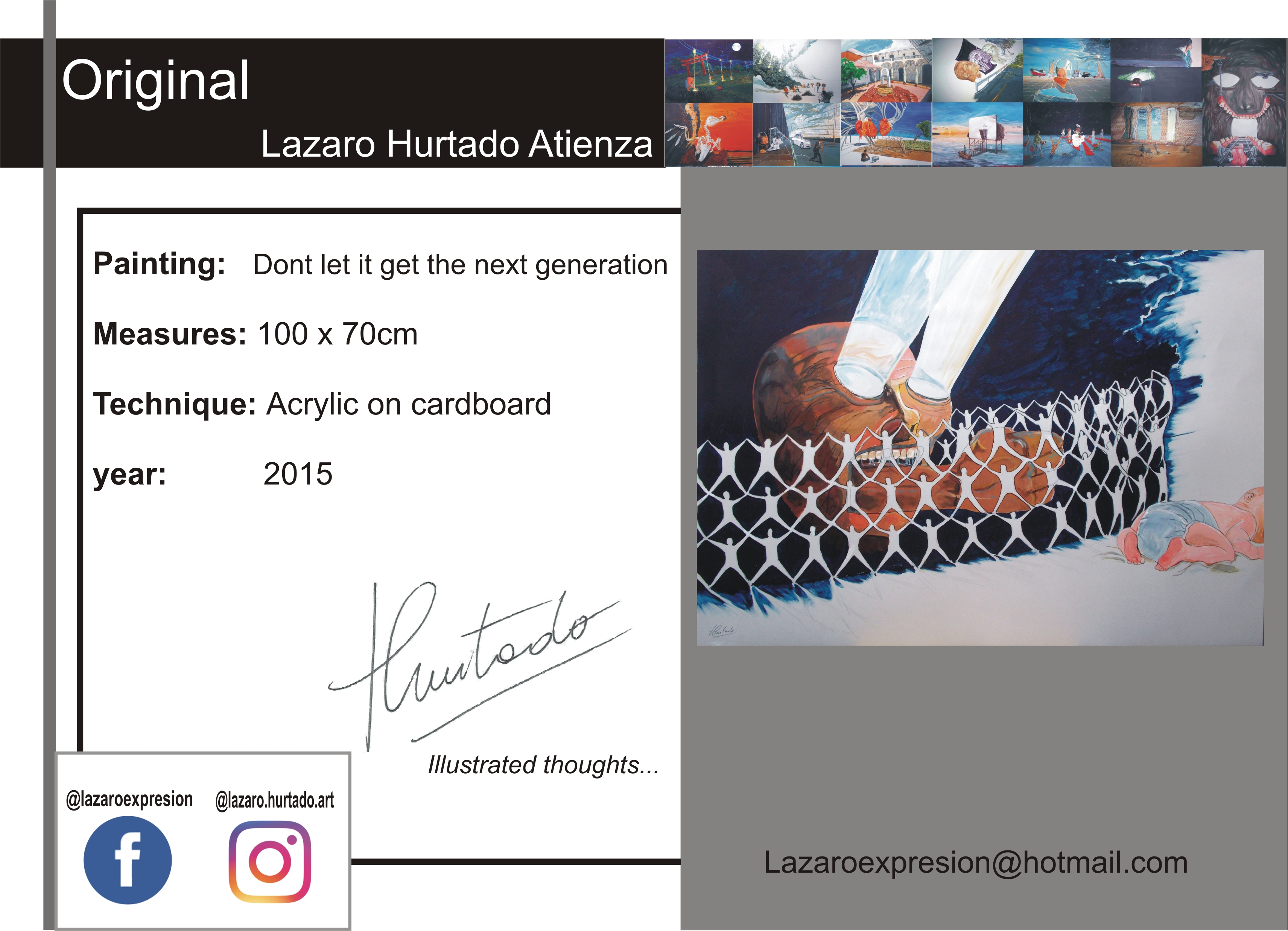 Lázaro Hurtado is an argentinian artist currently living in Buenos Aires, Argentina, were he works .Graduate Fine arts “ Bachillerato de Bellas Artes “ affiliated National University of La Plata. He states than more than an artist, he is a thinker.His work born from the necesity of expressing thoughts and conceptions of the World that surrounds him. The images he offers us project humanistic messages, the nature of mankind, the possible and the ridiculous. He makes comments about reality and the social forces and orders, but at the same time he demostrates a playful face, ironic in some cases. The transcription of inner alchemies into paintings of surrealist character wakes a curiosity in the viewer. The spectators would often find themselves been tickle by the ideas and concepts on reality and human behaviour that he seems to contemplate and rebuilt on his mind. The images you see are the working mechanics of a brain on a mind made world... Media: www.facebook.com/lazaroexpresion http://lazaro-hurtado.pixels.com http://www.redbubble.com/people/lazarohurtado https://twitter.com/lazaroexpresion 2019 _ Bio-Art Contest winner Excellence Prize . Seoul, South korea _ Premios a la Creación Artistica. Universidad de Belgrano. 27° Edición. Buenos Aires 2018 _ Artplu and Artron Art Auction: Western Modern & Contemporary Art _Picturesque Hotel . Wuxi, China 2017 _ X-Power Gallery Taipei . Taiwan _ Shenzhen International Art Fair. China _ Secoo 707 Deco Art Festival. China _ Artplu & Yidian China Art Auction:Western Contemporary Art Auction. China _ Art Nanjing- Baijiahu Art Mansion. China _ Art revolution Taipei 2017. Taiwan _ Get Art Museum Taipei, Taiwan 2016 _ Eggo Art Fair . Buenos Aires. _ ‘Thoughts’ curated by Tintin Yue JCCAC . Hong Kong _ 22 Salon de Pintura Palermo Viejo. Newbery Central Gallery. _ ‘Out of Gallery’ Hilton Hotel. Nanjin City. China _ Art Suning Plaza Collective Exhibition China _ Exposition at School Freud Lacan La Plata . Argentina 2015 _ Premio a la Creación Artística Universidad de Belgrano Buenos Aires _ Ar(t)gentina and Friends Castello Di Coazzolo (AT) Piemonte Italy _ Ar(t)gentina and Friends Pinacoteca Civica Camo ? Museo di Camo (CN) Piemonte Italy _ Ar(t)gentina and Friends Badnight Café Temporary Home Art Gallery Turín Italy _ ‘Illustrated thoughts’ Instituto de Capacitación Política. Argentina _ Museum of Contemporary Art, Artplu Shanghái, China _ 'Art on the Clouds', The Blue Skyline, Camphorwood, Wuxi City, China. _ " VIDEO KILLED THE ART STAR #2 "Spazio Arte 24, Via Corte 24, Dogliani Italy _ Tokyo International Art Fair Digital showcase Quest Hall Harajuku , Tokyo, Japan . _ Art Revolution Taipei 2015 Taiwan _ Arte La Plata stand unipersonal Argentina _ ‘ Colours of the World’ International Collective Exposition Bellas Artes. Museum And Academy., Bs As Argentina _ Motor Village Gallery City of Turin. Italy_ _ "il colori latini nell'arte contemporanea" Mondovi Piazza City of Mondovi, Cuneo, Italy 2014 _ ‘Becoming Conscience’ Cultural Centre Islas Malvinas Bs.As. Argentina _ 160th Stock Market Anniversary Buenos Aires. Argentina _ 1st Salón Municipal de Ilustration .La Plata . Argentina _ That Damned Show Detroit 2014 with a fineart canvas print ‘Lost sometimes’ USA