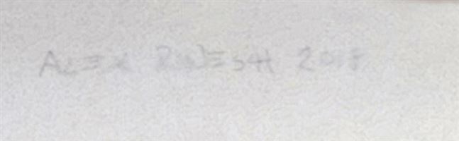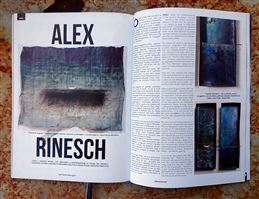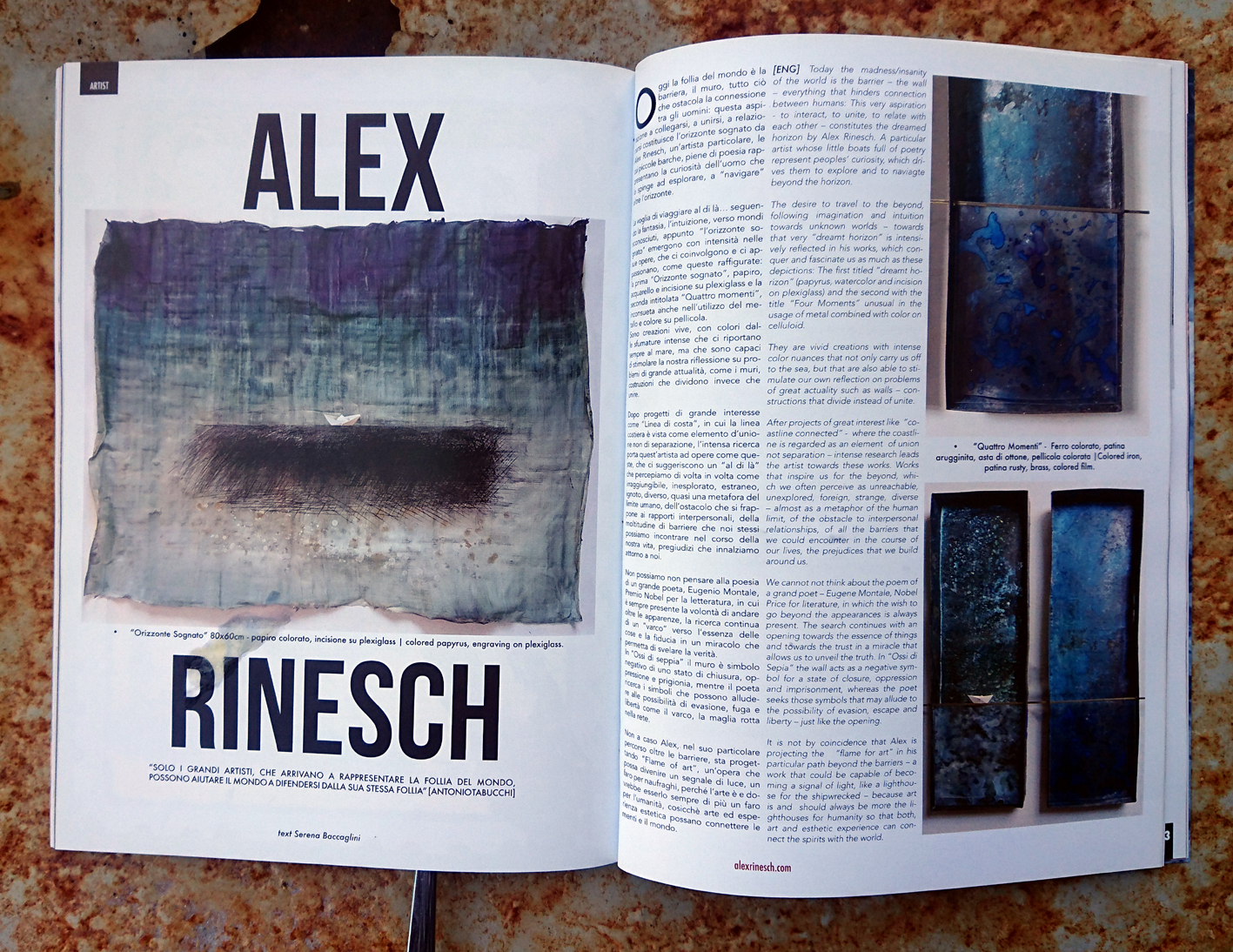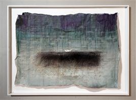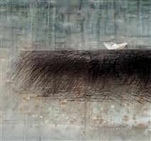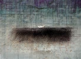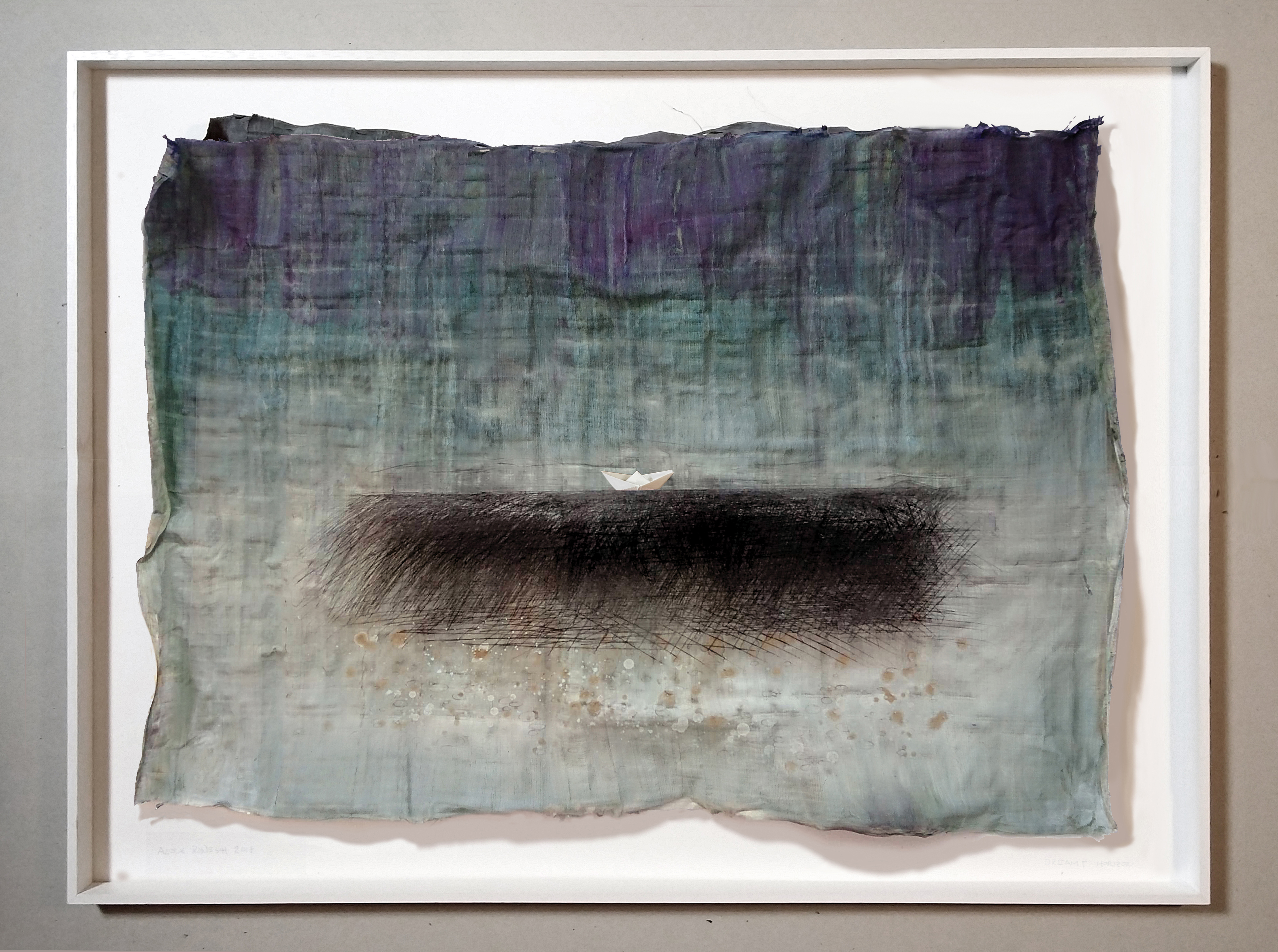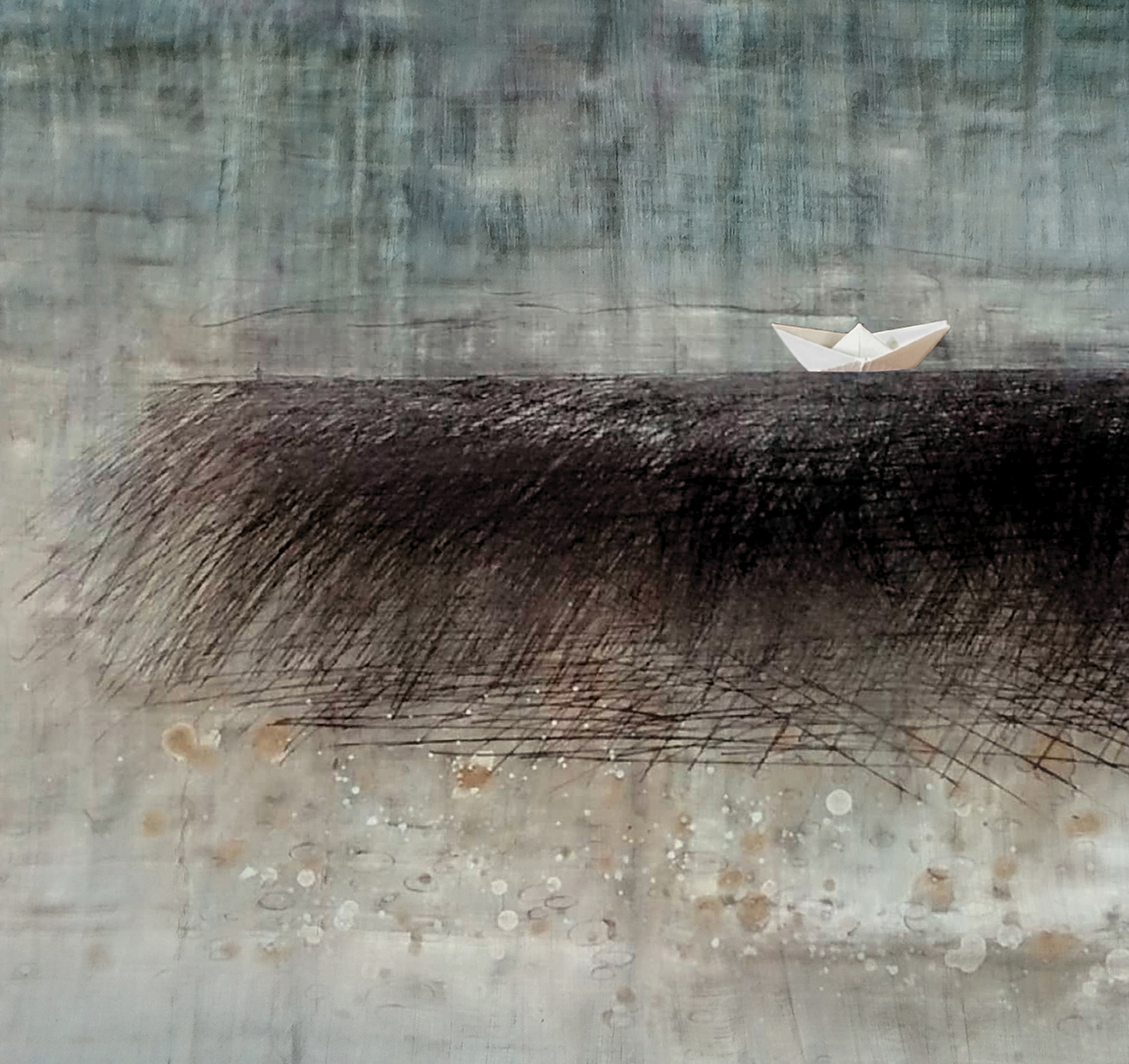 COLLAGE OF A HANDMADE PAPYRUS WITH A SHADING OF BLUEGREY WATERCOLOR A SMALL PAPERBOAT IS MOUNTED IN THE CENTER. THE WHOLE PIECE IS COVERED WITH A PLEXIGLASS ABOUT 2 CM DISTANCE FROM PAPYRUS. THE DARK SEA IS AN ETCHING DONE WITH A STEELNEEDLE, AND FILLED WITH BLACK ETCHING INK. AND SOME DOTS AND SPRINKLES OF ACRYLIC PAINT.