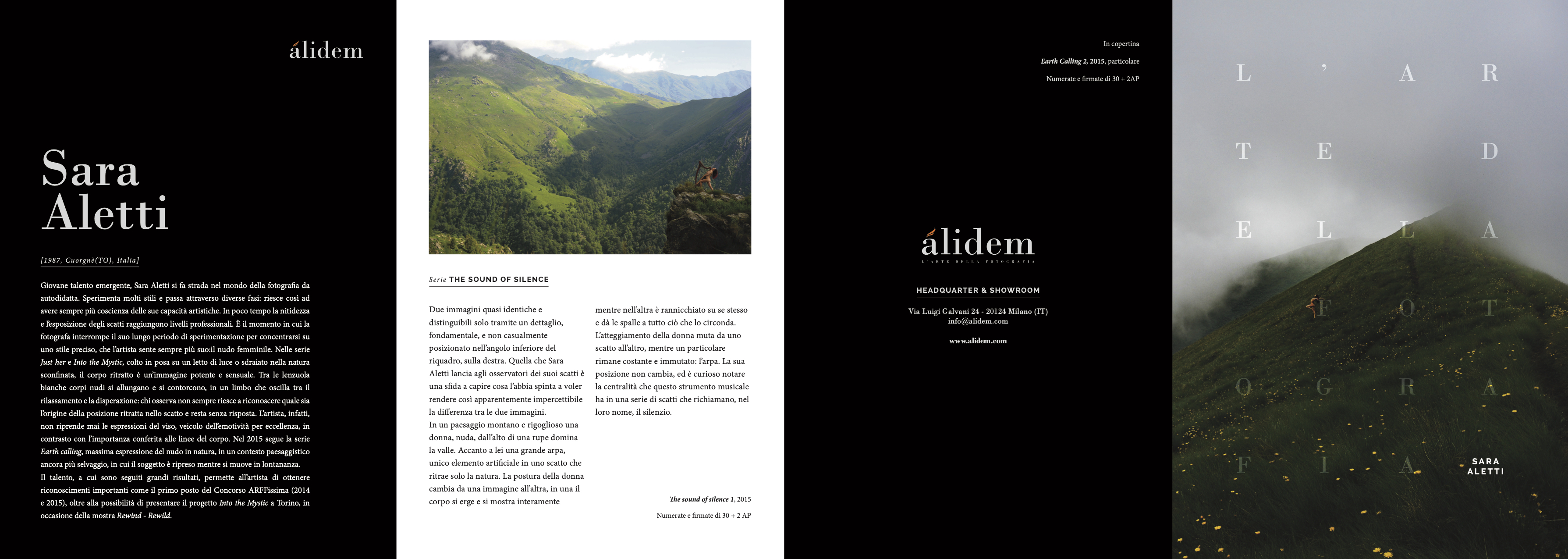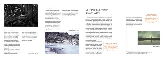 EN A young emerging talent, Sara Aletti gained momentum in the world of photography as a selflearned artist. She experimented various different genres and went through different artistic phases, gaining confidence about her artistic skills. Soon enough, her shots became as neat andwell-exposed as any professional photographer’s. This is when Aletti quits her artistic quest and specialises on one subject, which she feels more and more as her own: female nude. In her two series Just Her and Into the Mystic, female bodies are portrayed while laying on a bed of light or in the vastness of nature, conveying a powerful and sensual message. In the white bed sheets, naked bodies are stretching up or writhing, in a limbo where emotions swing between quietness and desperation: those looking at the image often cannot tell why the body portrayed has taken that position, and the question is left unanswered. Aletti never let us see her subjects’ face – that being the part of the body that reflects our emotions – and focuses on the body lines instead. In 2015, she finished Earth Calling, her best expression of a female nude surrounded by the wildness, a series where the female subject appears to the observers as she moves in the distance. Thanks to her talent, Sara Aletti achieved important goals and was awarded the first prize at the ARFFissima photo contest (in both 2014 and 2015). She was also offered the possibility of showing her project Into the Mystic in Turin, Italy on occasion of the exhibition Rewind-Rewild. IT Giovane talento emergente, Sara Aletti si fa strada nel mondo della fotografia da autodidatta. Sperimenta molti stili e passa attraverso diverse fasi: riesce così ad avere sempre più coscienza delle sue capacità artistiche. In poco tempo la nitidezza e l’esposizione degli scatti raggiungono livelli professionali. È il momento in cui la fotografa interrompe il suo lungo periodo di sperimentazione per concentrarsi su uno stile preciso, che l’artista sente sempre più suo:il nudo femminile. Nelle serie Just her e Into the Mystic, colto in posa su un letto di luce o sdraiato nella natura sconfinata, il corpo ritratto è un’immagine potente e sensuale. Tra le lenzuola bianche corpi nudi si allungano e si contorcono, in un limbo che oscilla tra il rilassamento e la disperazione: chi osserva non sempre riesce a riconoscere quale sia l’origine della posizione ritratta nello scatto e resta senza risposta. L’artista, infatti, non riprende mai le espressioni del viso, veicolo dell’emotività per eccellenza, in contrasto con l’importanza conferita alle linee del corpo. Nel 2015 segue la serie Earth calling, massima espressione del nudo in natura, in un contesto paesaggistico ancora più selvaggio, in cui il soggetto è ripreso mentre si muove in lontananza. Il talento, a cui sono seguiti grandi risultati, permette all’artista di ottenere riconoscimenti importanti come il primo posto del Concorso ARFFissima (2014 e 2015), oltre alla possibilità di presentare il progetto Into the Mystic a Torino, in occasione della mostra Rewind - Rewild.