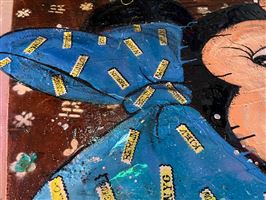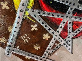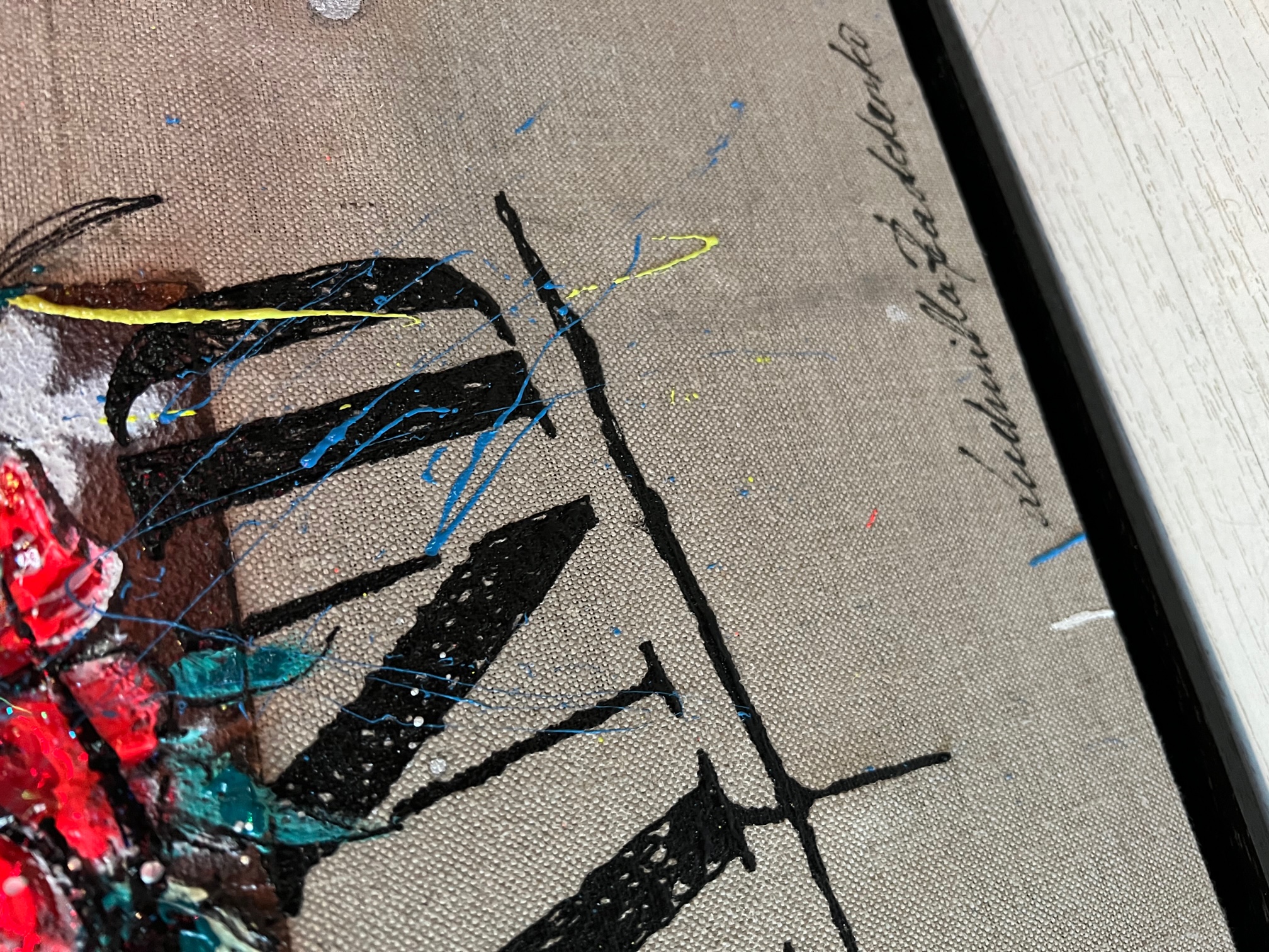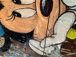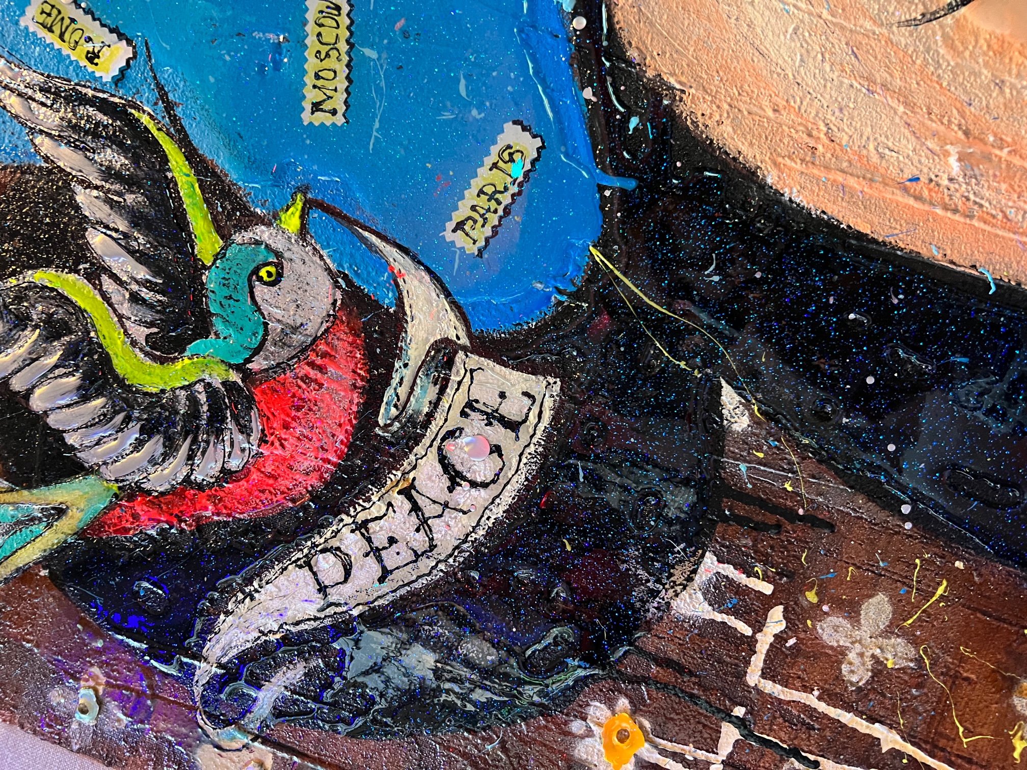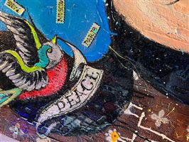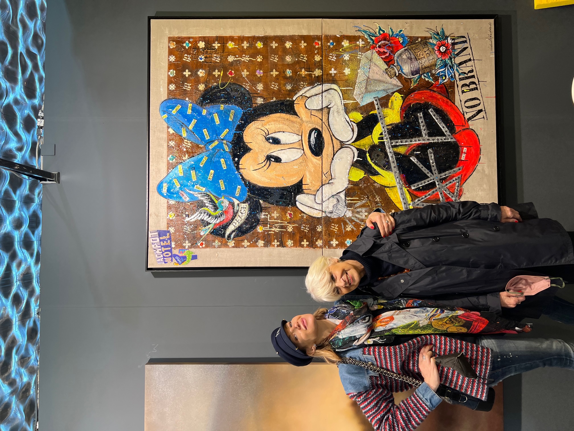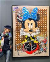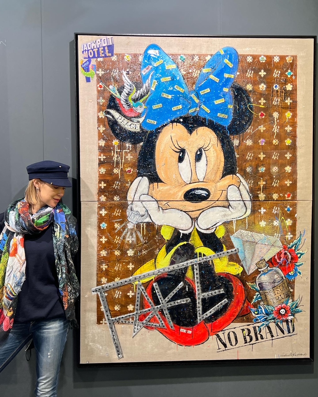 QUALI SONO I VERI VALORI EVIDENZIATI NEI NOSTRIL TEMPI? LL PERSONAGGIO DI MINNIE, RAPPRESENTA METAFORICAMENTE L’ATTESA E LA CONFUSIONE DI QUESTO TRAGICO MOMENTO. LA SCELTA CROMATICA NEL VESTITO DELLA PROTAGONISTA È UN CHIARO RIFERIMENTO ALLA GUERRA TRA RUSSIA E UCRAINA. CELATAMENTE NELLA PAROLA “FAKE” SI METTONO IN DUBBIO VARI ASPETTI DI “GUERRA D’INFORMAZIONE” CHE DIVENTA SOLIDA, QUASI COME FOSSE UNA STRUTTURA IN METALLO. UN AMBASCIATORE DI SPERANZA È RAPPRESENTATO DAL PICCOLO UCCELLO CHE PORTA CON SÉ UN ANNUNCIO DI PACE. QUEST’OPERA VUOLE PORTARCI AD UNA RIFLESSIONE SUI FATTI DI CRONACA ED UN MESSAGGIO DI POSITIVITÀ PER IL FUTURO. OPERA PRESENTATA ALL'ESPOSIZIONE "ARTE GENOVA" PRESSO LA GALLERIA GLI ANGELI. WHAT ARE THE TRUE VALUES HIGHLIGHTED IN OUR TIMES? THE CHARACTER OF MINNIE METAPHORICALLY REPRESENTS THE EXPECTATION AND CONFUSION OF THIS TRAGIC MOMENT. THE CHROMATIC CHOICE IN THE PROTAGONIST'S DRESS IS A CLEAR REFERENCE TO THE WAR BETWEEN RUSSIA AND UKRAINE. HIDDEN IN THE WORD "FAKE" VARIOUS ASPECTS OF "INFORMATION WARFARE" ARE QUESTIONED, WHICH BECOMES SOLID, ALMOST AS IF IT WAS A METAL STRUCTURE. AN AMBASSADOR OF HOPE IS REPRESENTED BY THE SMALL BIRD THAT CARRIES WITH IT A PROCLAMATION OF PEACE. THIS ARTWORK WANTS TO LEAD US TO A REFLECTION ON THE NEWS AND A MESSAGE OF POSITIVITY FOR THE FUTURE. ARTWORK PRESENTED AT THE "GENOA ART" EXHIBITION AT "GALLERIA GLI ANGELI"