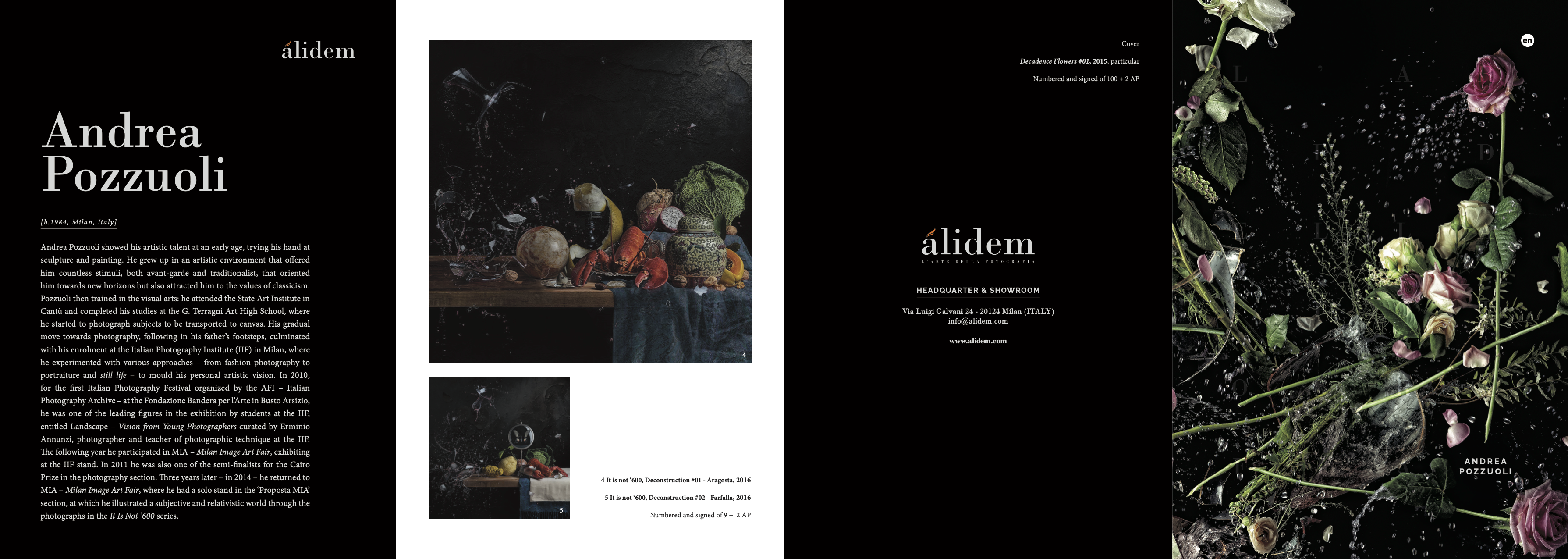 EN Andrea Pozzuoli showed his artistic talent at an early age, trying his hand at sculpture and painting. He grew up in an artistic environment that offered him countless stimuli, both avant-garde and traditionalist, that oriented him towards new horizons but also attracted him to the values of classicism. Pozzuoli then trained in the visual arts: he attended the State Art Institute in Cantù and completed his studies at the G. Terragni Art High School, where he started to photograph subjects to be transported to canvas. His gradual move towards photography, following in his father’s footsteps, culminated with his enrolment at the Italian Photography Institute (IIF) in Milan, where he experimented with various approaches – from fashion photography to portraiture and still life – to mould his personal artistic vision. In 2010, for the first Italian Photography Festival organized by the AFI – Italian Photography Archive – at the Fondazione Bandera per l’Arte in Busto Arsizio, he was one of the leading figures in the exhibition by students at the IIF, entitled Landscape – Vision from Young Photographers curated by Erminio Annunzi, photographer and teacher of photographic technique at the IIF. The following year he participated in MIA – Milan Image Art Fair, exhibiting at the IIF stand. In 2011 he was also one of the semi-finalists for the Cairo Prize in the photography section. Three years later – in 2014 – he returned to MIA – Milan Image Art Fair, where he had a solo stand in the ‘Proposta MIA’ section, at which he illustrated a subjective and relativistic world through the photographs in the It Is Not ’600 series. IT Andrea Pozzuoli sin dalla giovane età esprime il proprio talento artistico cimentandosi nella scultura e nella pittura. Cresce in un ambiente artistico da cui riceve stimoli sia avanguardistici sia tradizionalisti, che lo orientano verso orizzonti nuovi e al contempo lo attraggono verso i valori della classicità. Intraprende un percorso formativo che si inscrive nel segno delle arti visive: frequenta l’Istituto Statale d’Arte a Cantù e conclude gli studi presso il Liceo Artistico G. Terragni, dove inizia a fotografare soggetti da trasporre su tela. Il graduale avvicinamento alla fotografia, seguendo le orme paterne, culmina con l’iscrizione all’Istituto Italiano di Fotografia (IIF) di Milano, dove sperimenta diversi approcci – dalla fotografia di moda alla ritrattistica fino allo still life – per dare forma alla sua personale visione artistica. Nel 2010, in occasione del primo Festival Fotografico Italiano, organizzato dall’AFI – Archivio Fotografico Italiano – presso la Fondazione Bandera per l’Arte di Busto Arsizio, è tra i protagonisti della mostra degli studenti dell’IIF Landscape – Vision from young photographers curata da Erminio Annunzi, fotografo e docente di tecnica fotografica all’Istituto Italiano di Fotografia. L’anno successivo partecipa al MIA – Milan Image Art Fair esponendo con lo stand dell’Istituto Italiano di Fotografia. Sempre nel 2011 è tra i semifinalisti al Premio Cairo nella sezione fotografia. Tre anni più tardi, nel 2014, si ripresenta al MIA – Milan Image Art Fair, dove è protagonista con uno stand personale nella sezione ‘Proposta MIA’, in cui racconta un mondo soggettivo, relativistico, attraverso le fotografie della serie It is not ’600.