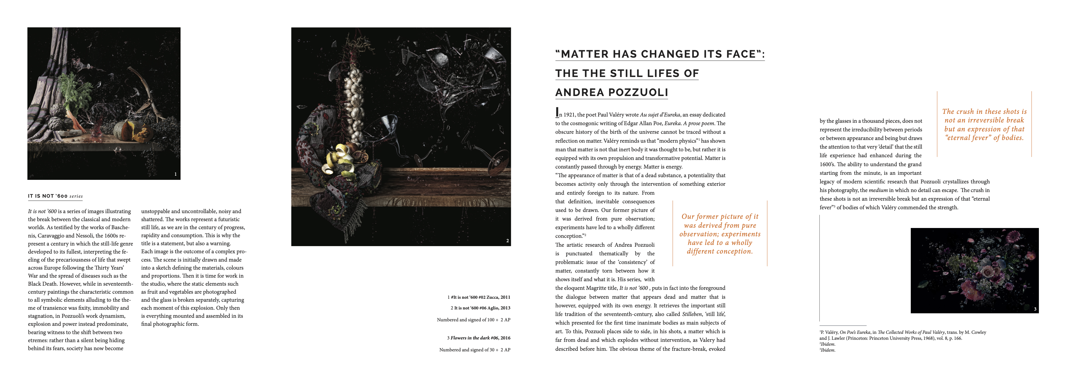 EN Andrea Pozzuoli showed his artistic talent at an early age, trying his hand at sculpture and painting. He grew up in an artistic environment that offered him countless stimuli, both avant-garde and traditionalist, that oriented him towards new horizons but also attracted him to the values of classicism. Pozzuoli then trained in the visual arts: he attended the State Art Institute in Cantù and completed his studies at the G. Terragni Art High School, where he started to photograph subjects to be transported to canvas. His gradual move towards photography, following in his father’s footsteps, culminated with his enrolment at the Italian Photography Institute (IIF) in Milan, where he experimented with various approaches – from fashion photography to portraiture and still life – to mould his personal artistic vision. In 2010, for the first Italian Photography Festival organized by the AFI – Italian Photography Archive – at the Fondazione Bandera per l’Arte in Busto Arsizio, he was one of the leading figures in the exhibition by students at the IIF, entitled Landscape – Vision from Young Photographers curated by Erminio Annunzi, photographer and teacher of photographic technique at the IIF. The following year he participated in MIA – Milan Image Art Fair, exhibiting at the IIF stand. In 2011 he was also one of the semi-finalists for the Cairo Prize in the photography section. Three years later – in 2014 – he returned to MIA – Milan Image Art Fair, where he had a solo stand in the ‘Proposta MIA’ section, at which he illustrated a subjective and relativistic world through the photographs in the It Is Not ’600 series. IT Andrea Pozzuoli sin dalla giovane età esprime il proprio talento artistico cimentandosi nella scultura e nella pittura. Cresce in un ambiente artistico da cui riceve stimoli sia avanguardistici sia tradizionalisti, che lo orientano verso orizzonti nuovi e al contempo lo attraggono verso i valori della classicità. Intraprende un percorso formativo che si inscrive nel segno delle arti visive: frequenta l’Istituto Statale d’Arte a Cantù e conclude gli studi presso il Liceo Artistico G. Terragni, dove inizia a fotografare soggetti da trasporre su tela. Il graduale avvicinamento alla fotografia, seguendo le orme paterne, culmina con l’iscrizione all’Istituto Italiano di Fotografia (IIF) di Milano, dove sperimenta diversi approcci – dalla fotografia di moda alla ritrattistica fino allo still life – per dare forma alla sua personale visione artistica. Nel 2010, in occasione del primo Festival Fotografico Italiano, organizzato dall’AFI – Archivio Fotografico Italiano – presso la Fondazione Bandera per l’Arte di Busto Arsizio, è tra i protagonisti della mostra degli studenti dell’IIF Landscape – Vision from young photographers curata da Erminio Annunzi, fotografo e docente di tecnica fotografica all’Istituto Italiano di Fotografia. L’anno successivo partecipa al MIA – Milan Image Art Fair esponendo con lo stand dell’Istituto Italiano di Fotografia. Sempre nel 2011 è tra i semifinalisti al Premio Cairo nella sezione fotografia. Tre anni più tardi, nel 2014, si ripresenta al MIA – Milan Image Art Fair, dove è protagonista con uno stand personale nella sezione ‘Proposta MIA’, in cui racconta un mondo soggettivo, relativistico, attraverso le fotografie della serie It is not ’600.