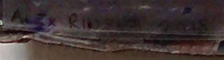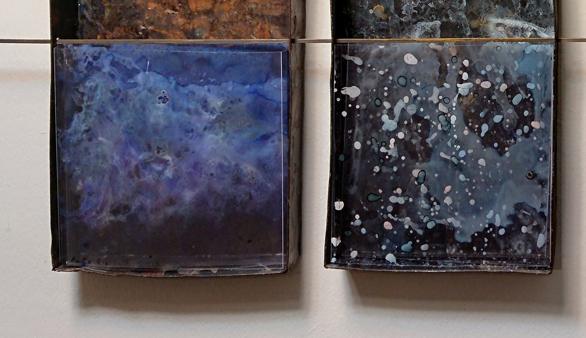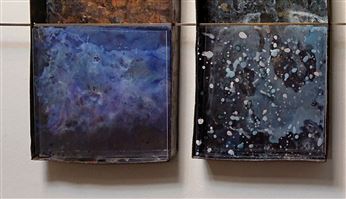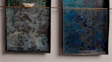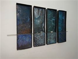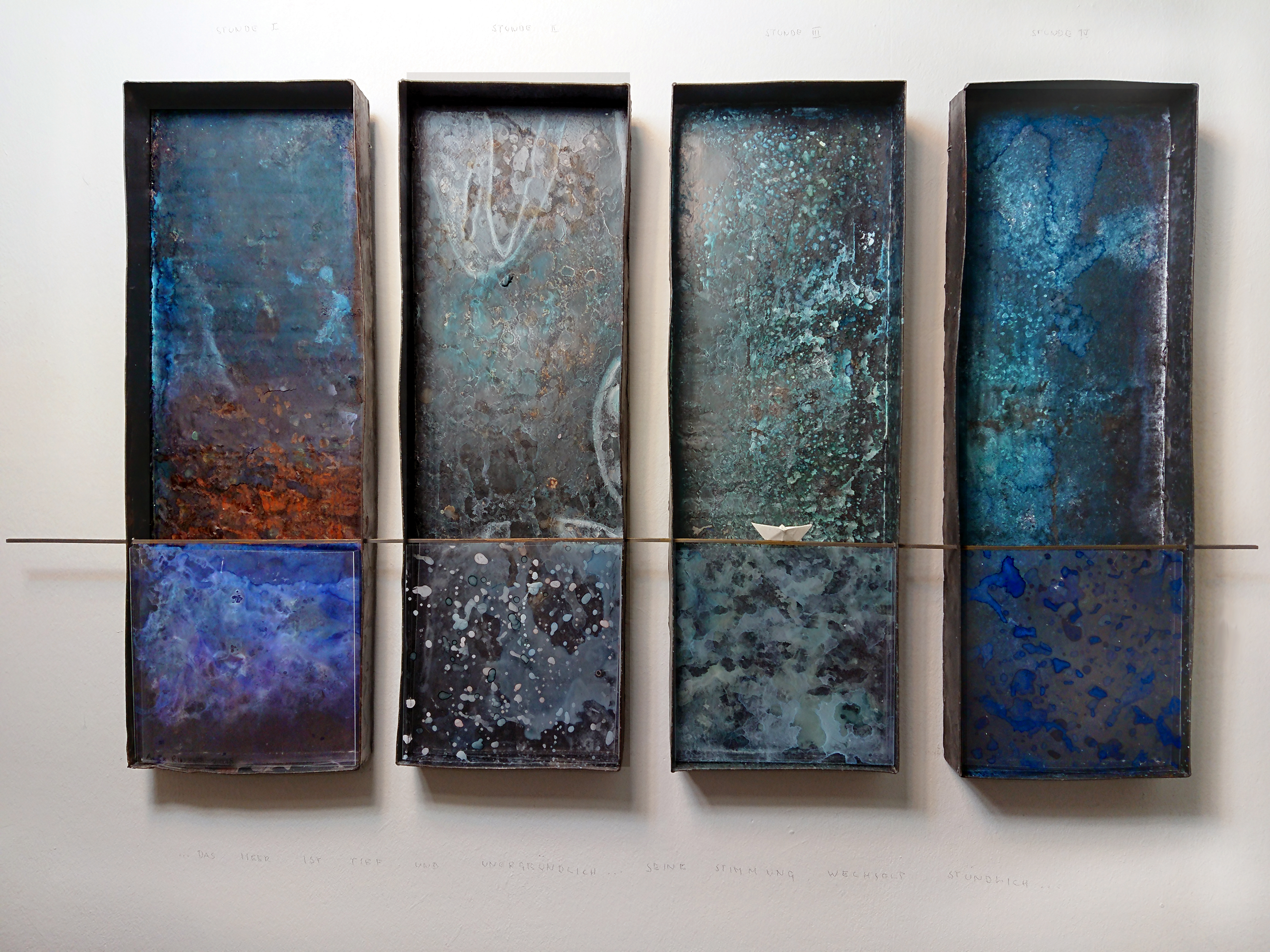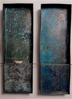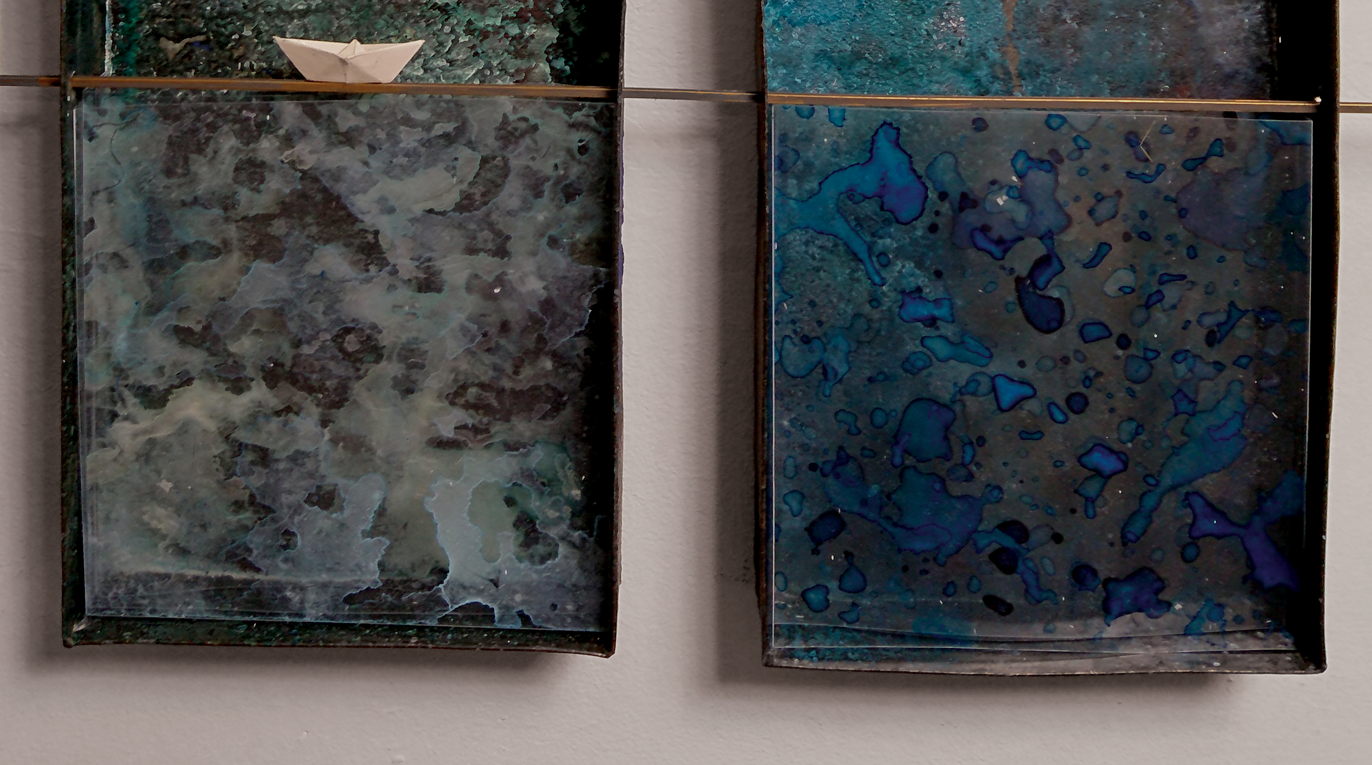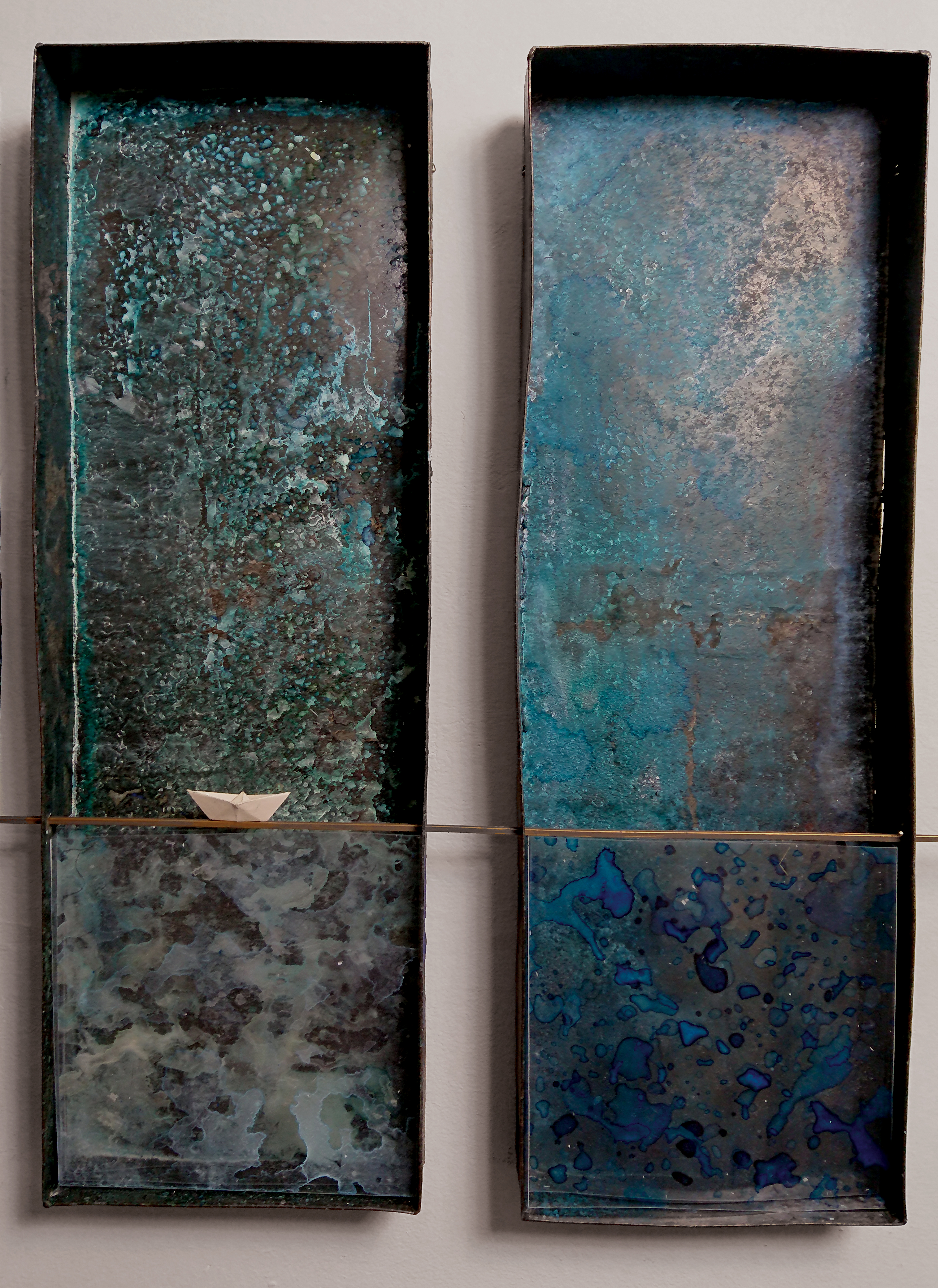 THE FOUR FOUR FLAT OLD IRONTUBS CONNECTED WITH A H-SHAPED BRASSPROFILE, COLOURED WITH ACRILIC PAINT PATINA, THIN ACRYLIC FOIL LAYERS, ONE BEHIND THE OTHER WITH ACRYLIK PAINT, GIVING AN EFFECT OF DEEPNESS.