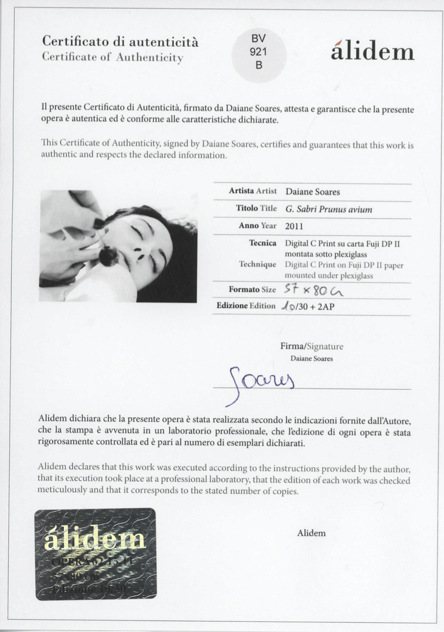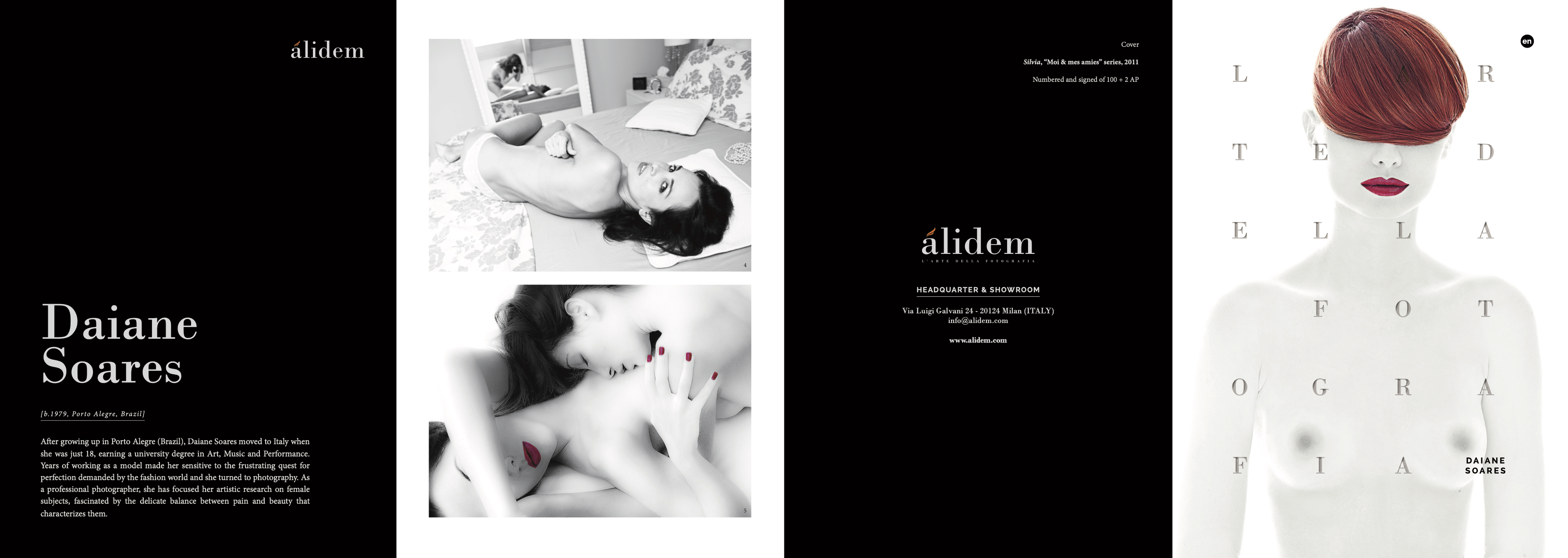 EN Daiane Soares, just of age, leaves Brazil to move to Italy, where she graduated in Art, Music and Entertainment at the University of Bologna. Rich in an extraordinary sensitivity and an in-depth knowledge of the great masters of Italian art - from Leonardo Da Vinci to Michelangelo - she entered the world of art and photography in 2008, after years of work as a model that deeply influenced her. Sensitive to the frustrations of perfection that the world of fashion imposes, Daiane uses photography as a language to express the precarious balance between pain and beauty that characterizes the female subject. Within a few years, Daiane exhibited worldwide, in Europe, the United States and Japan. Among the numerous photographic projects carried out from 2009 to today, Moi & mes amies, Io Donna and Moi Femme, in which the female figure is entrusted with a leading role, are distinguished by their relevance. Some specimens of the first series were exhibited in 2011 at the Galerie de Tourgeville in Calvados in France, in 2013 at the Axelle B Gallery in Houdan and at the Archangel Gallery in Palm Springs in California. Important solo exhibitions were dedicated to her at Space K in Tokyo and at the Adnane Gallery in Geneva in 2013. In the same year she exhibited in the collective exhibition Io Donna set up in the prestigious rooms of the Museum of Eroticism in Paris. IT Daiane Soares, appena maggiorenne, lascia il Brasile per trasferirsi in Italia, dove consegue la Laurea in Arte, Musica e Spettacolo presso l’Università di Bologna. Ricca di una straordinaria sensibilità e di un’approfondita conoscenza dei grandi maestri dell’arte italiana - da Leonardo Da Vinci a Michelangelo - approda al mondo dell’arte e della fotografia nel 2008, dopo anni di lavoro come modella che la influenzano profondamente. Sensibile alle frustrazioni della perfezione che il mondo della moda impone, Daiane usa la fotografia come linguaggio per esprimere il precario equilibrio tra dolore e bellezza che caratterizza il soggetto femminile. Nel giro di pochi anni, Daiane espone in tutto il mondo, in Europa, Stati Uniti e Giappone. Tra i numerosi progetti fotografici realizzati dal 2009 a oggi, si distinguono per rilevanza Moi & mes amies, Io Donna e Moi Femme, in cui alla figura femminile è affidato un ruolo da protagonista. Alcuni esemplari della prima serie sono stati esposti nel 2011 alla Galerie de Tourgeville a Calvados in Francia, nel 2013 all’Axelle B Gallery a Houdan e all’Archangel Gallery di Palm Springs in California. Le sono state dedicate importanti mostre personali allo Space K di Tokyo e all’Adnane Gallery di Ginevra nel 2013. Nello stesso anno ha esposto nella mostra collettiva Io Donna allestita tra le prestigiose sale del Museo dell’Erotismo di Parigi.