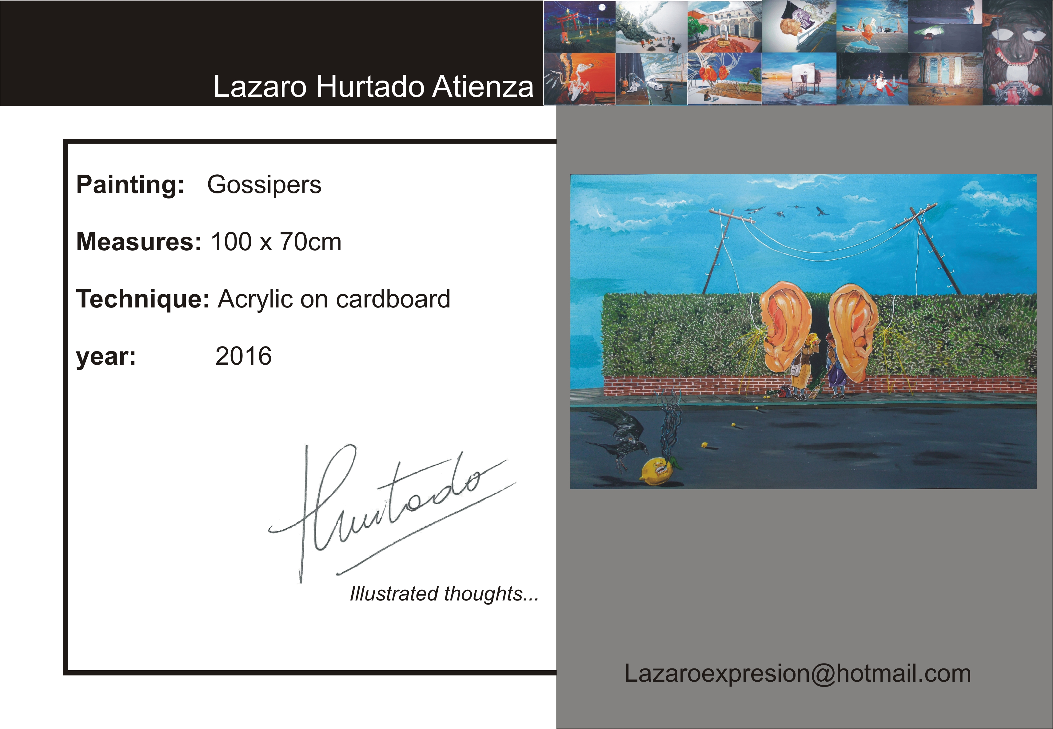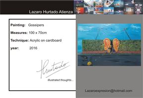 Lázaro Hurtado is an argentinian artist currently living in Buenos Aires, Argentina, were he works .Graduate Fine arts “ Bachillerato de Bellas Artes “ affiliated National University of La Plata. He states than more than an artist, he is a thinker.His work born from the necesity of expressing thoughts and conceptions of the World that surrounds him. The images he offers us project humanistic messages, the nature of mankind, the possible and the ridiculous. He makes comments about reality and the social forces and orders, but at the same time he demostrates a playful face, ironic in some cases. The transcription of inner alchemies into paintings of surrealist character wakes a curiosity in the viewer. The spectators would often find themselves been tickle by the ideas and concepts on reality and human behaviour that he seems to contemplate and rebuilt on his mind. The images you see are the working mechanics of a brain on a mind made world... Media: www.facebook.com/lazaroexpresion http://lazaro-hurtado.pixels.com http://www.redbubble.com/people/lazarohurtado https://twitter.com/lazaroexpresion 2019 _ Bio-Art Contest winner Excellence Prize . Seoul, South korea _ Premios a la Creación Artistica. Universidad de Belgrano. 27° Edición. Buenos Aires 2018 _ Artplu and Artron Art Auction: Western Modern & Contemporary Art _Picturesque Hotel . Wuxi, China 2017 _ X-Power Gallery Taipei . Taiwan _ Shenzhen International Art Fair. China _ Secoo 707 Deco Art Festival. China _ Artplu & Yidian China Art Auction:Western Contemporary Art Auction. China _ Art Nanjing- Baijiahu Art Mansion. China _ Art revolution Taipei 2017. Taiwan _ Get Art Museum Taipei, Taiwan 2016 _ Eggo Art Fair . Buenos Aires. _ ‘Thoughts’ curated by Tintin Yue JCCAC . Hong Kong _ 22 Salon de Pintura Palermo Viejo. Newbery Central Gallery. _ ‘Out of Gallery’ Hilton Hotel. Nanjin City. China _ Art Suning Plaza Collective Exhibition China _ Exposition at School Freud Lacan La Plata . Argentina 2015 _ Premio a la Creación Artística Universidad de Belgrano Buenos Aires _ Ar(t)gentina and Friends Castello Di Coazzolo (AT) Piemonte Italy _ Ar(t)gentina and Friends Pinacoteca Civica Camo ? Museo di Camo (CN) Piemonte Italy _ Ar(t)gentina and Friends Badnight Café Temporary Home Art Gallery Turín Italy _ ‘Illustrated thoughts’ Instituto de Capacitación Política. Argentina _ Museum of Contemporary Art, Artplu Shanghái, China _ 'Art on the Clouds', The Blue Skyline, Camphorwood, Wuxi City, China. _ " VIDEO KILLED THE ART STAR #2 "Spazio Arte 24, Via Corte 24, Dogliani Italy _ Tokyo International Art Fair Digital showcase Quest Hall Harajuku , Tokyo, Japan . _ Art Revolution Taipei 2015 Taiwan _ Arte La Plata stand unipersonal Argentina _ ‘ Colours of the World’ International Collective Exposition Bellas Artes. Museum And Academy., Bs As Argentina _ Motor Village Gallery City of Turin. Italy_ _ "il colori latini nell'arte contemporanea" Mondovi Piazza City of Mondovi, Cuneo, Italy 2014 _ ‘Becoming Conscience’ Cultural Centre Islas Malvinas Bs.As. Argentina _ 160th Stock Market Anniversary Buenos Aires. Argentina _ 1st Salón Municipal de Ilustration .La Plata . Argentina _ That Damned Show Detroit 2014 with a fineart canvas print ‘Lost sometimes’ USA