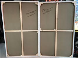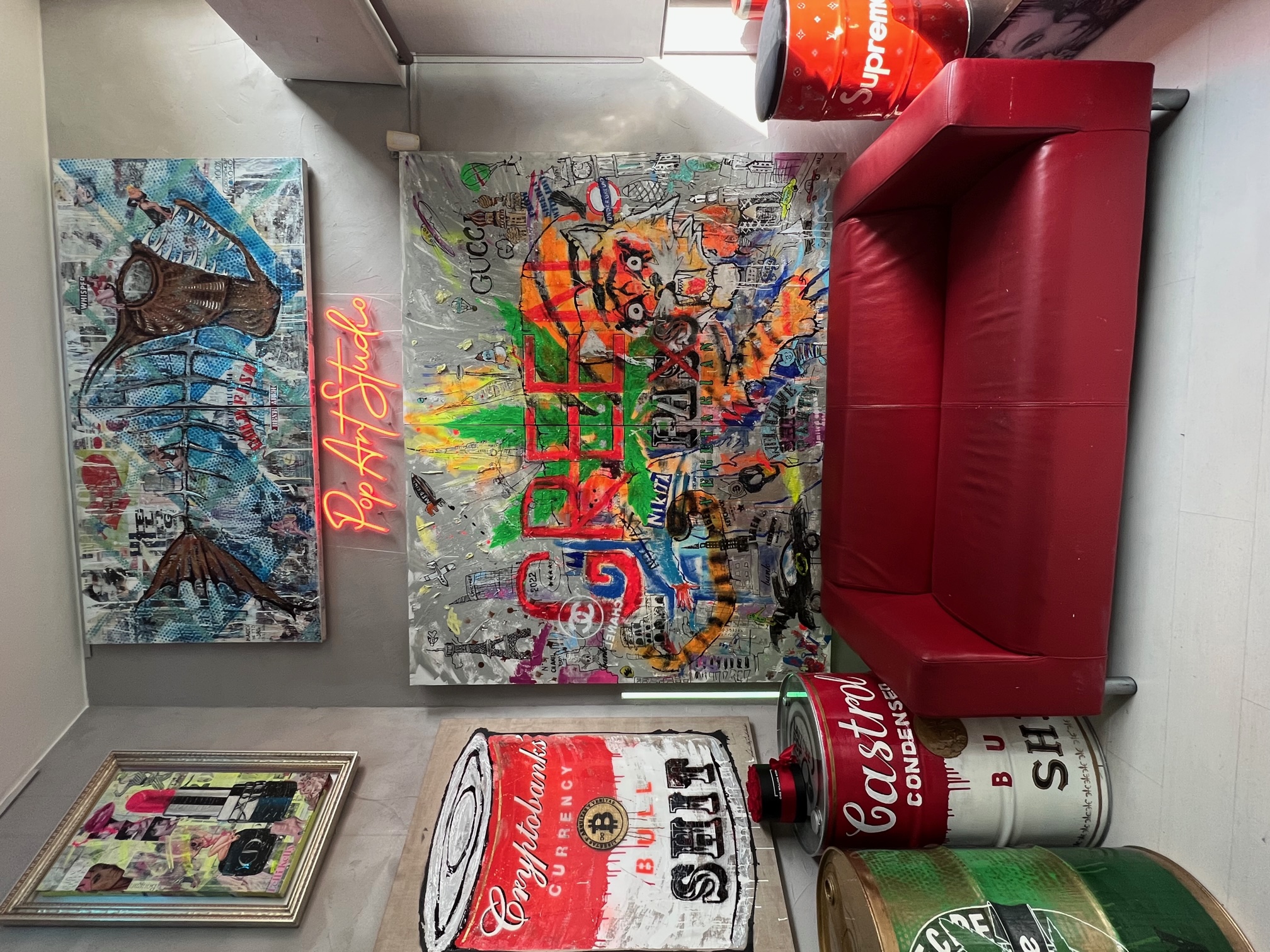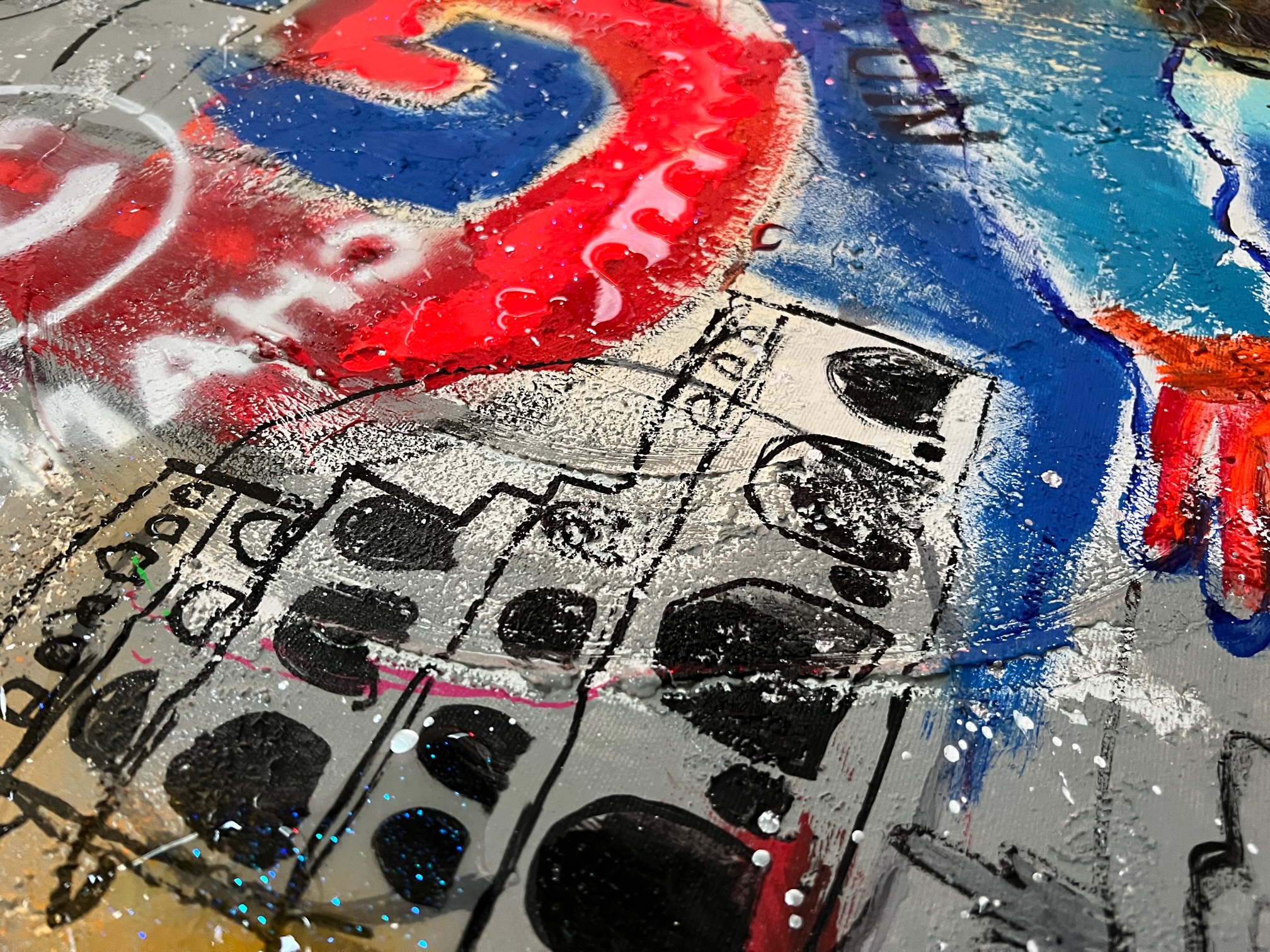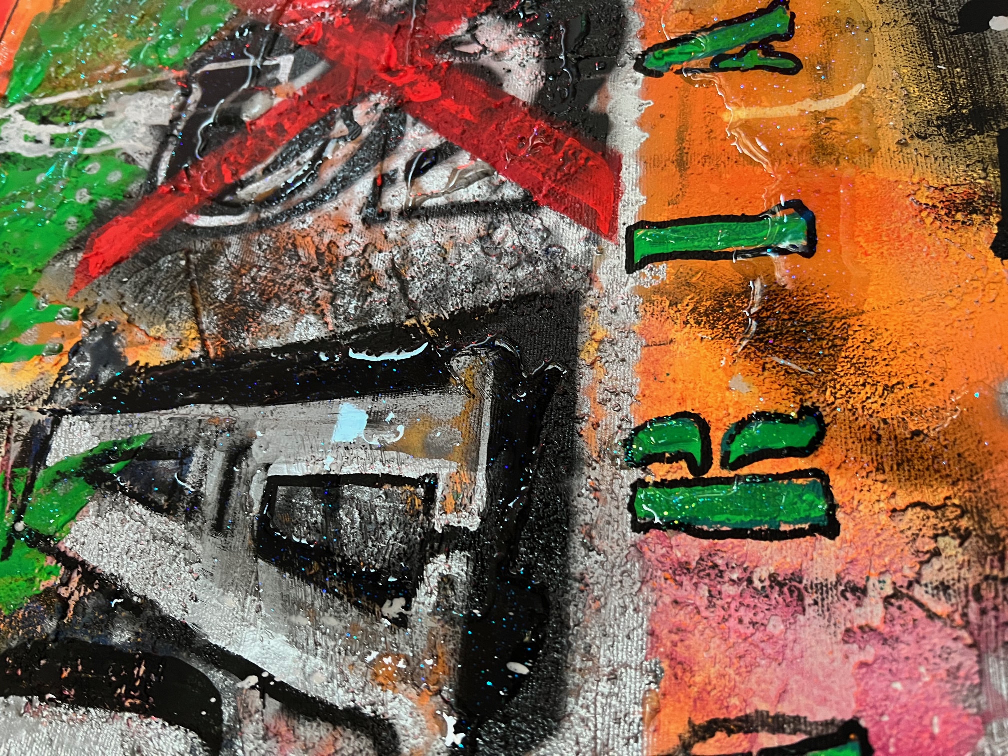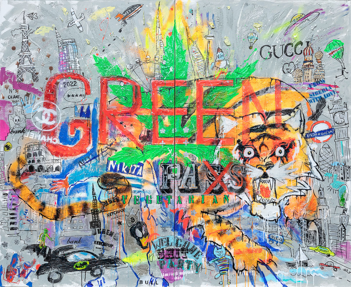 IL 2022 È L’ANNO DELLA TIGRE SECONDO IL CALENDARIO ORIENTALE E L’ANNO DI “CODA” DELLA PANDEMIA DA COVID 19. INOLTRE, LA NOTIZIA DI UN’INASPETTATA GUERRA TRA RUSSIA ED UCRAINA, CONTRIBUISCE A RENDERE LA FATICA SEMPRE PIÙ PRESSANTE. OPERA REALIZZATA A SEI MANI, QUELLE DELL’ARTISTA E DEI SUOI DUE FIGLI, EVA E NIKITA (10 E 5 ANNI),TRASMETTE LA NECESSITÀ DEL CONCETTO DI UNIONE DI UNA FAMIGLIA E DI CONSEGUENZA DI UNIONE TRA I POPOLI. IL TEMA DELLA LIBERTÀ PERSONALE, VIENE EVOCATO DA UNA FOGLIA DI MARIJUANA, SIMBOLO PER ECCELLENZA DI INDIPENDENZA E DALLA GIGANTE SCRITTA “GREEN PASS”, UNA “PAROLA D’ORDINE” QUOTIDIANA CHE OTTIENE UN SECONDO SIGNIFICATO CON UNA GRANDE X CHE CANCELLA LE DUE LETTERE FINALI, TRASFORMANDO LA PAROLA IN PAX DAL LATINO PACE. UN ENNESIMA PROVOCAZIONE DELLA RADCHENKO È L’AGGETTIVO VEGETARIAN CHE POSIZIONA PROPRIO SOTTO L’ANIMALE PIÙ CARNIVOLO E AGRESSIVO CONOSCIUTO. 2022 IS THE YEAR OF THE TIGER ACCORDING TO THE EASTERN CALENDAR AND THE "TAIL" YEAR OF THE COVID 19 PANDEMIC. FURTHERMORE, THE NEWS OF AN UNEXPECTED WAR BETWEEN RUSSIA AND UKRAINE CONTRIBUTES TO MAKING THE EFFORT EVER MORE PRESSING. WORK CREATED BY SIX HANDS, THOSE OF THE ARTIST AND HIS TWO CHILDREN, EVA AND NIKITA (10 AND 5 YEARS OLD), CONVEYS THE NEED FOR THE CONCEPT OF UNION OF A FAMILY AND CONSEQUENTLY OF UNION BETWEEN PEOPLES. THE THEME OF PERSONAL FREEDOM IS EVOKED BY A MARIJUANA LEAF, A SYMBOL OF INDEPENDENCE PAR EXCELLENCE, AND BY THE GIANT WRITTEN "GREEN PASS", A DAILY "PASSWORD" THAT GETS A SECOND MEANING WITH A LARGE X THAT DELETES THE TWO LETTERS FINAL, TRANSFORMING THE WORD INTO PAX FROM THE LATIN PACE. ANOTHER PROVOCATION BY RADCHENKO IS THE ADJECTIVE VEGETARIAN WHICH SHE PLACES RIGHT BELOW THE MOST CARNIVOROUS AND AGGRESSIVE ANIMAL KNOWN.