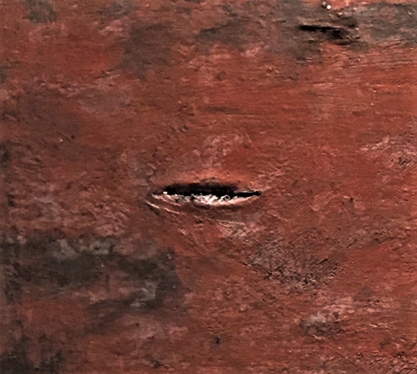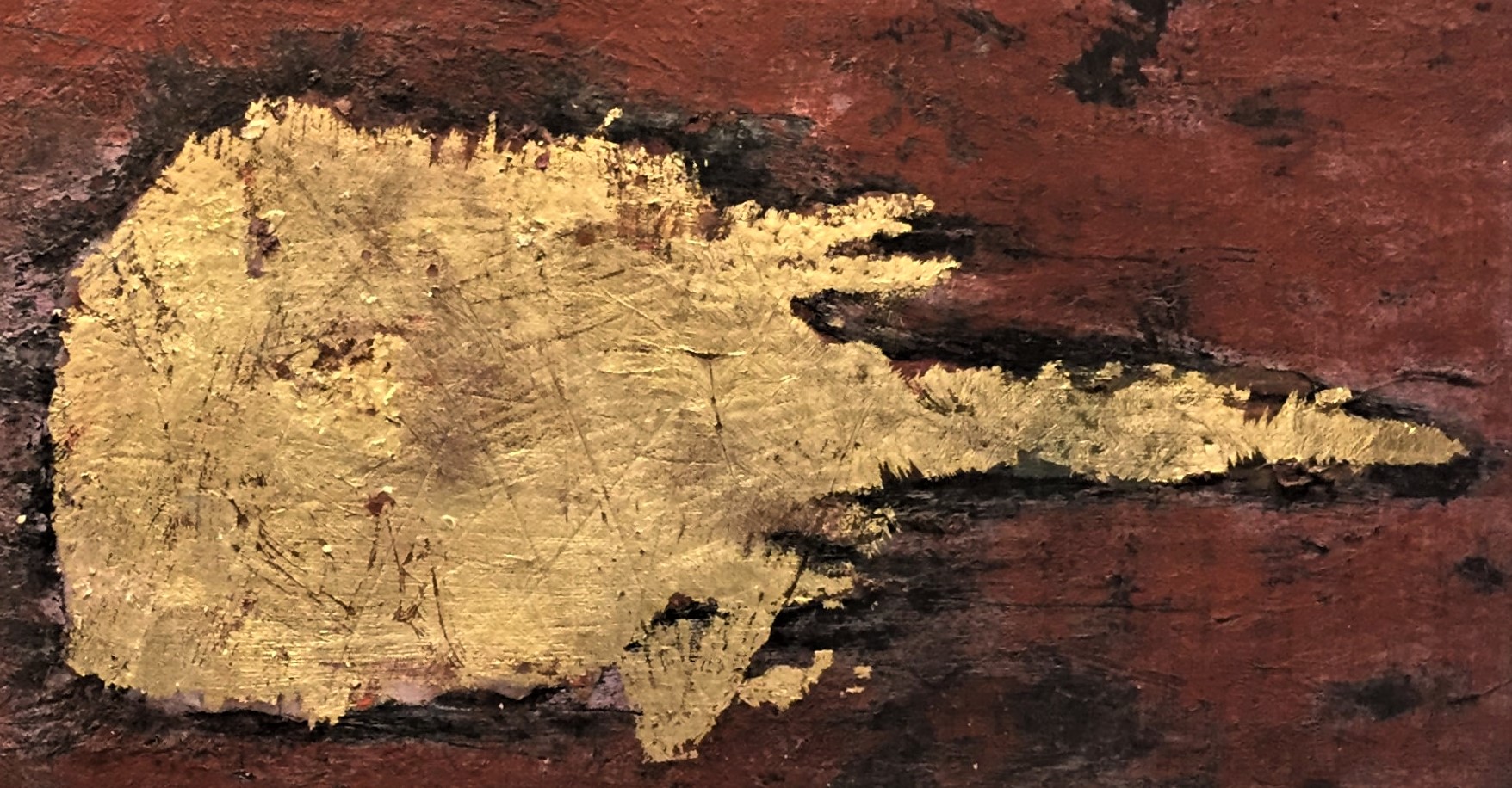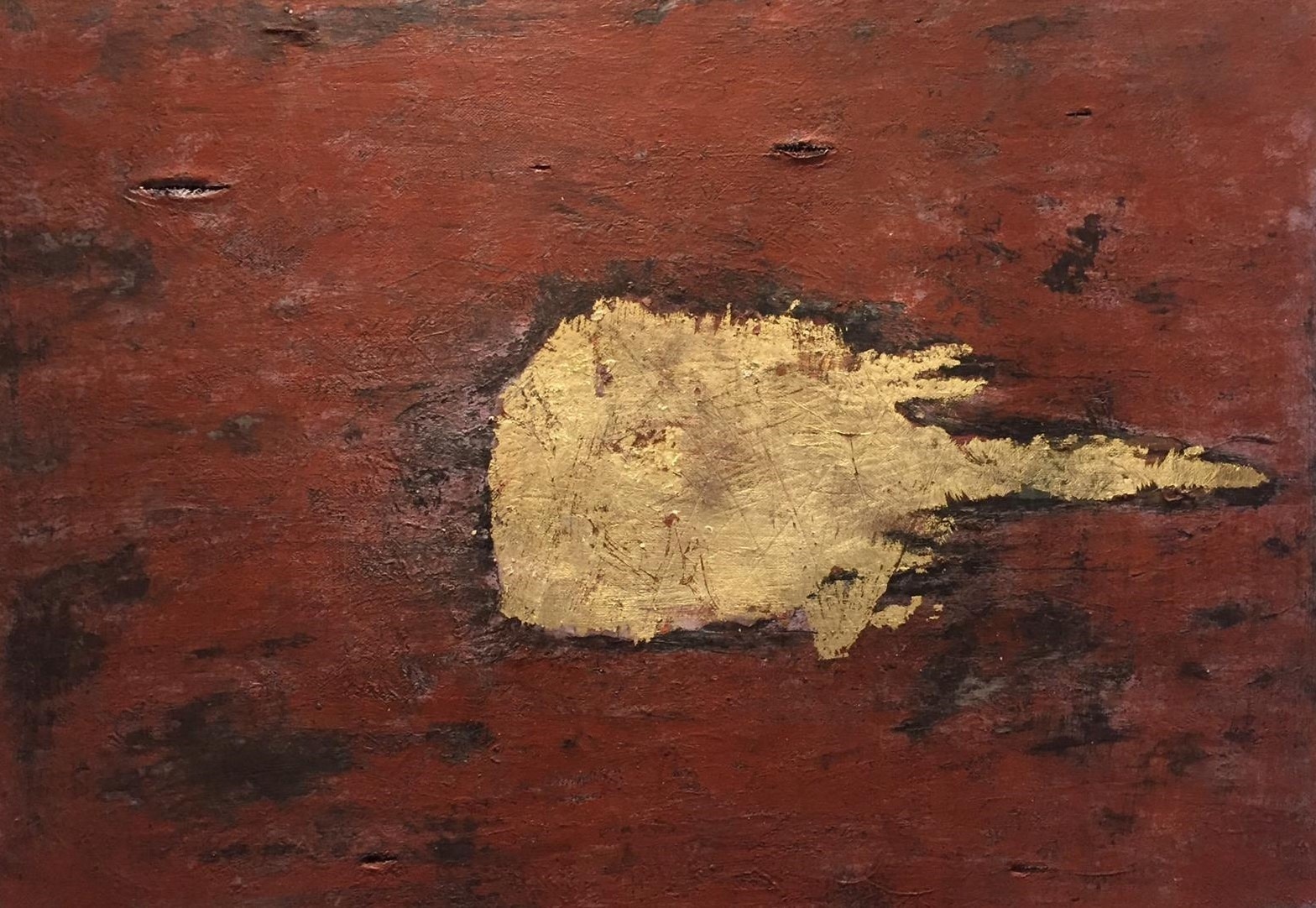 IS IT ALL OVER OR HASN'T IT STARTED? IN THIS UNIVERSE CLOSED WITHIN ITSELF, WHERE THE DAWN OF CONSCIOUSNESS WITHDRAWS FOR AN INSTANT AND THE RANGE OF EXPERIENCES IS RETURNED TO SILENCE, THE MIND BECOMES SIMILAR TO A STARLESS NIGHT. WE HAVE NO TRACES AND TIME AND SPACE APPEAR SUSPENDED. THE CENTRAL NUCLEUS OF LIGHT - BUILT FROM GOLD LEAVES - REFUSES TO BE PIGEONHOLED IN A DYNAMIC MOVEMENT. THE MONOCHROME TERRA DI SIENA BRUCIATA, GENEROUSLY SPATULATED, FRAMES THE SUDDEN GASH TO FREE ONE'S SELF, SO THAT OUR GAZE CAN FLOW ELSEWHERE. È FINITO TUTTO OPPURE NON È COMINCIATO? IN QUESTO UNIVERSO CHIUSO DENTRO DI SÉ, IN CUI L’ALBA DELLA COSCIENZA SI RITRAE UN ISTANTE E LA GAMMA DELLE ESPERIENZE VIENE RESTITUITA AL SILENZIO, LA MENTE SI FA SIMILE A UNA NOTTE SENZA STELLE. NON ABBIAMO TRACCE E IL TEMPO E LO SPAZIO APPAIONO SOSPESI. IL NUCLEO CENTRALE DI LUCE - COSTRUITO DA FOGLIE D’ORO – SI RIFIUTA DI LASCIARSI INCASELLARE IN UN MOVIMENTO DINAMICO. IL MONOCROMO TERRA DI SIENA BRUCIATA, GENEROSAMENTE SPATOLATO, FA DA CORNICE ALLO SQUARCIO IMPROVVISO PER LIBERARE IL PROPRIO IO, COSÌ CHE IL NOSTRO SGUARDO POSSA FLUIRE IN UN ALTROVE. EST-CE FINI OU ÇA N'A PAS COMMENCÉ? DANS CET UNIVERS FERMÉ, OÙ L'AUBE DE LA CONSCIENCE SE RETIRE UN INSTANT ET L'ÉVENTAIL DES EXPÉRIENCES REVIENT AU SILENCE, L'ESPRIT DEVIENT SEMBLABLE À UNE NUIT SANS ÉTOILES. NOUS N'AVONS AUCUNE TRACE ET LE TEMPS ET L'ESPACE SEMBLENT SUSPENDUS. LE NOYAU CENTRAL DE LUMIÈRE - CONSTRUIT À PARTIR DE FEUILLES D'OR - REFUSE D'ÊTRE PRIS AU PIÈGE DANS UN MOUVEMENT DYNAMIQUE. LA TERRA DI SIENA BRUCIATA MONOCHROME, GÉNÉREUSEMENT SPATULÉE, ENCADRE L'ENTAILLE SOUDAINE POUR SE LIBÉRER, AFIN QUE NOTRE REGARD PUISSE COULER AILLEURS.