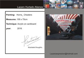 Lázaro Hurtado is an argentinian artist currently living in Buenos Aires, Argentina, were he works .Graduate Fine arts “ Bachillerato de Bellas Artes “ affiliated National University of La Plata. He states than more than an artist, he is a thinker.His work born from the necesity of expressing thoughts and conceptions of the World that surrounds him. The images he offers us project humanistic messages, the nature of mankind, the possible and the ridiculous. He makes comments about reality and the social forces and orders, but at the same time he demostrates a playful face, ironic in some cases. The transcription of inner alchemies into paintings of surrealist character wakes a curiosity in the viewer. The spectators would often find themselves been tickle by the ideas and concepts on reality and human behaviour that he seems to contemplate and rebuilt on his mind. The images you see are the working mechanics of a brain on a mind made world... Media: www.facebook.com/lazaroexpresion http://lazaro-hurtado.pixels.com http://www.redbubble.com/people/lazarohurtado https://twitter.com/lazaroexpresion 2019 _ Bio-Art Contest winner Excellence Prize . Seoul, South korea _ Premios a la Creación Artistica. Universidad de Belgrano. 27° Edición. Buenos Aires 2018 _ Artplu and Artron Art Auction: Western Modern & Contemporary Art _Picturesque Hotel . Wuxi, China 2017 _ X-Power Gallery Taipei . Taiwan _ Shenzhen International Art Fair. China _ Secoo 707 Deco Art Festival. China _ Artplu & Yidian China Art Auction:Western Contemporary Art Auction. China _ Art Nanjing- Baijiahu Art Mansion. China _ Art revolution Taipei 2017. Taiwan _ Get Art Museum Taipei, Taiwan 2016 _ Eggo Art Fair . Buenos Aires. _ ‘Thoughts’ curated by Tintin Yue JCCAC . Hong Kong _ 22 Salon de Pintura Palermo Viejo. Newbery Central Gallery. _ ‘Out of Gallery’ Hilton Hotel. Nanjin City. China _ Art Suning Plaza Collective Exhibition China _ Exposition at School Freud Lacan La Plata . Argentina 2015 _ Premio a la Creación Artística Universidad de Belgrano Buenos Aires _ Ar(t)gentina and Friends Castello Di Coazzolo (AT) Piemonte Italy _ Ar(t)gentina and Friends Pinacoteca Civica Camo ? Museo di Camo (CN) Piemonte Italy _ Ar(t)gentina and Friends Badnight Café Temporary Home Art Gallery Turín Italy _ ‘Illustrated thoughts’ Instituto de Capacitación Política. Argentina _ Museum of Contemporary Art, Artplu Shanghái, China _ 'Art on the Clouds', The Blue Skyline, Camphorwood, Wuxi City, China. _ " VIDEO KILLED THE ART STAR #2 "Spazio Arte 24, Via Corte 24, Dogliani Italy _ Tokyo International Art Fair Digital showcase Quest Hall Harajuku , Tokyo, Japan . _ Art Revolution Taipei 2015 Taiwan _ Arte La Plata stand unipersonal Argentina _ ‘ Colours of the World’ International Collective Exposition Bellas Artes. Museum And Academy., Bs As Argentina _ Motor Village Gallery City of Turin. Italy_ _ "il colori latini nell'arte contemporanea" Mondovi Piazza City of Mondovi, Cuneo, Italy 2014 _ ‘Becoming Conscience’ Cultural Centre Islas Malvinas Bs.As. Argentina _ 160th Stock Market Anniversary Buenos Aires. Argentina _ 1st Salón Municipal de Ilustration .La Plata . Argentina _ That Damned Show Detroit 2014 with a fineart canvas print ‘Lost sometimes’ USA