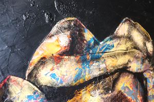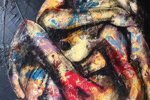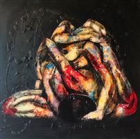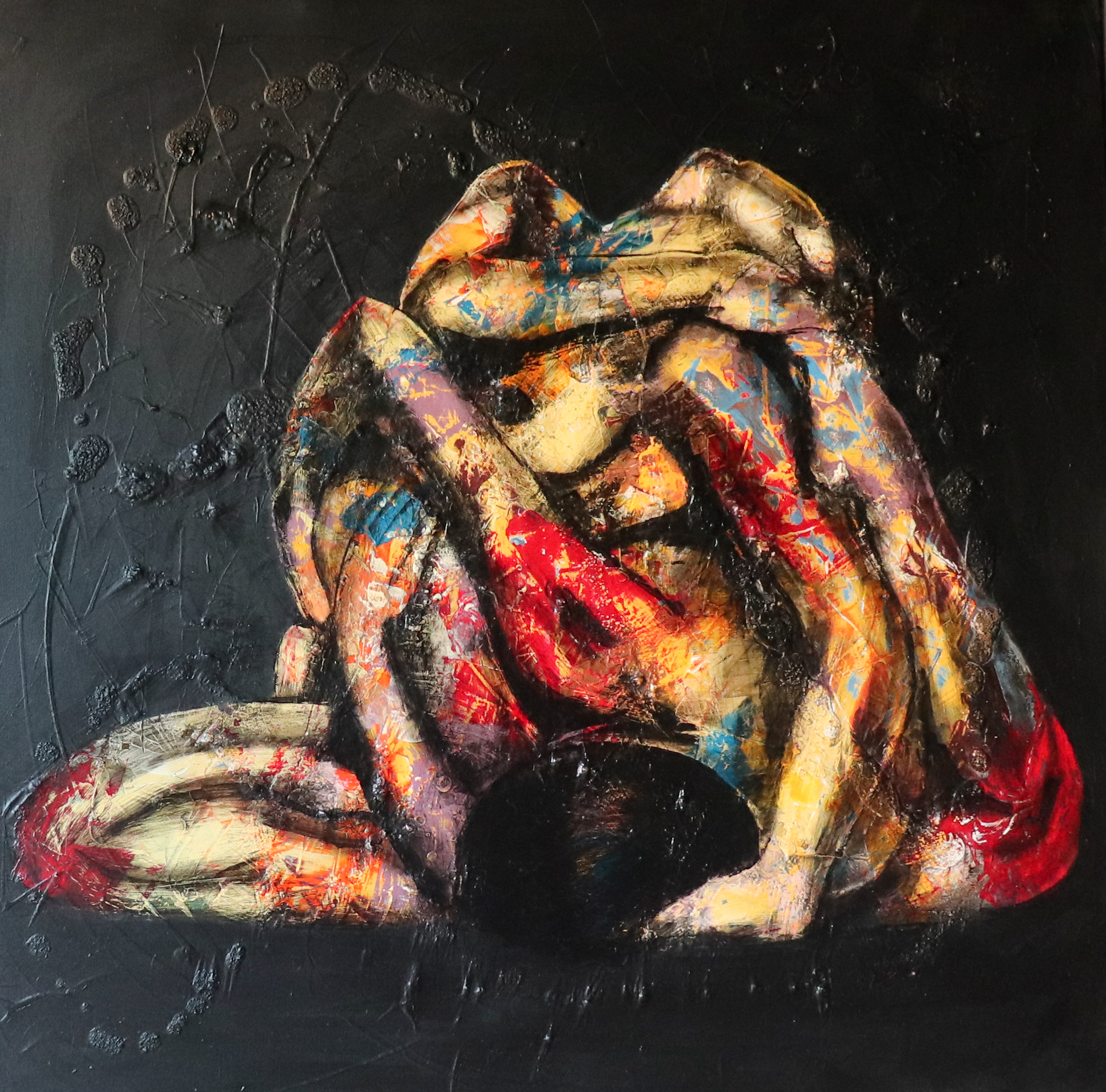 ICS RITRAE DUE CORPI CONTORTI E AGGROVIGLIATI, TALMENTE INTERSECATI DA RISULTARE QUASI UNO UNICO, DUE CORPI PLASTICI IN RELAZIONE CON SÉ STESSI E CON L'ALTRO CHE SEMBRA CI VOGLIANO SUSSURRARE E NELLO STESSO TEMPO URLARE: IO NON SONO SOLO! IO HO BISOGNO DELL' ALTRO! IN UNA SORPRESA DI LUCE E COLORI CI PARLANO CON I COLORI CHE TENDONO AL GIALLO MISCELATI IN TUTTE LE SUE SFUMATURE E CON DELLE NOTE DI ROSSO E AZZURRO.