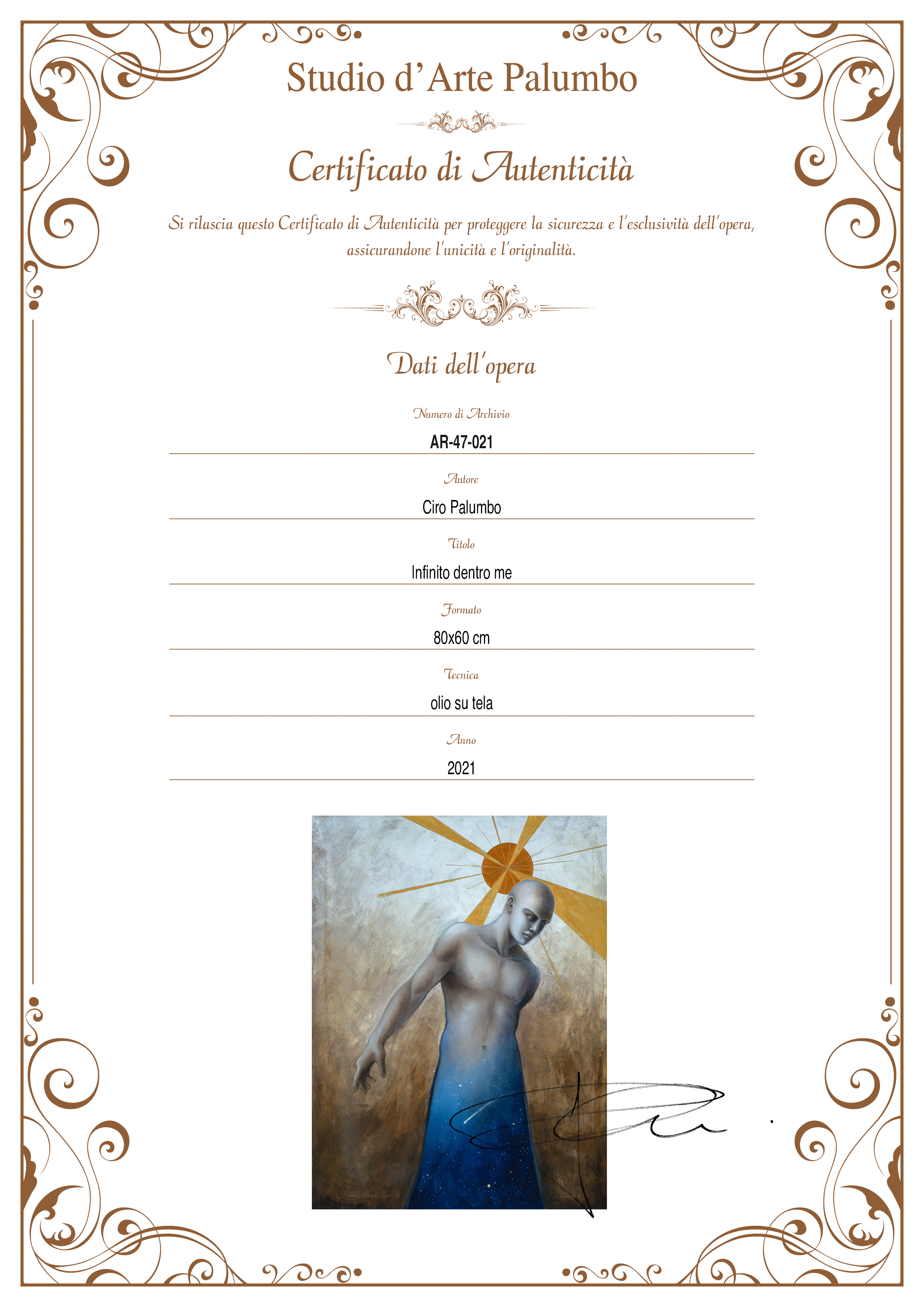 L’OPERA FA PARTE DEL CONCEPT “INFINITO”, UN CICLO PITTORICO DEDICATO AD UN PROGETTO ESCLUSIVO, COSTITUITO DA UN PRESTIGIOSO COFANETTO FATTO A MANO CONTENENTE UN LIBRO D’ARTISTA, IL CATALOGO DELLE OPERE, UN DVD E UNA STAMPA FINEART SU CARTA PREGIATA. IL COFANETTO È REALIZZATO IN UNA TIRATURA LIMITATA DI 150 PEZZI. L’OPERA FA PARTE DI UNA COLLEZIONE IN GESTIONE A 7ETTANTA6EI ART GALLERY L’OPERA È PUBBLICATA NEL CATALOGO “INFINITO” DI CIRO PALUMBO A PAGINA 129
