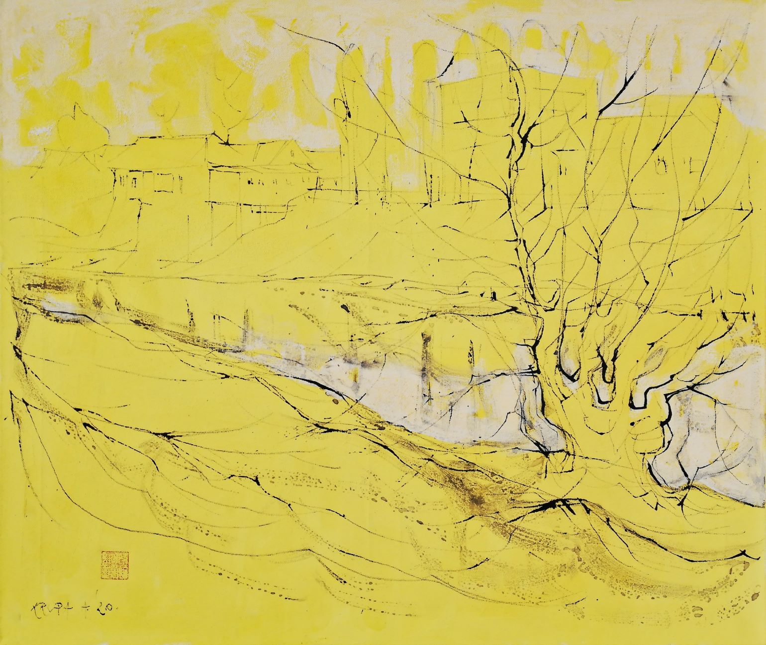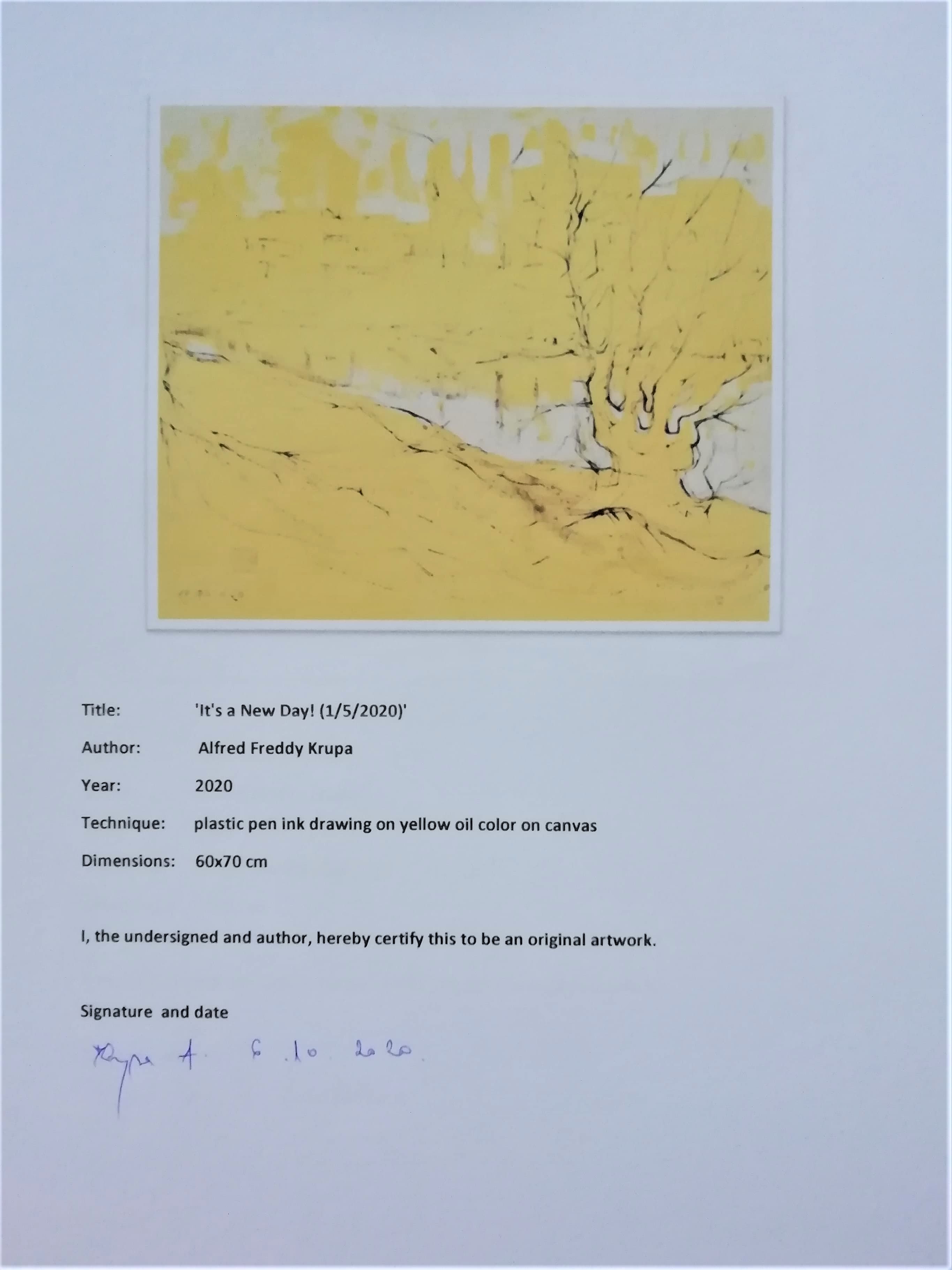 BLACK INK APPLIED WITH A PLASTIC FEATHER (FROM THE INK BOTTLE COVER) AND WHITE INK APPLIED WITH A HARD BRUSH ON LINEN CANVAS 60X70 CM, PRE-COATED / PAINTED WITH YELLOW-WHITE OIL PAINT SO THAT IT CAN BE REFERRED TO AS 'INK ON OIL ON CANVAS'. PAINTED EN PLEIN-AIR.