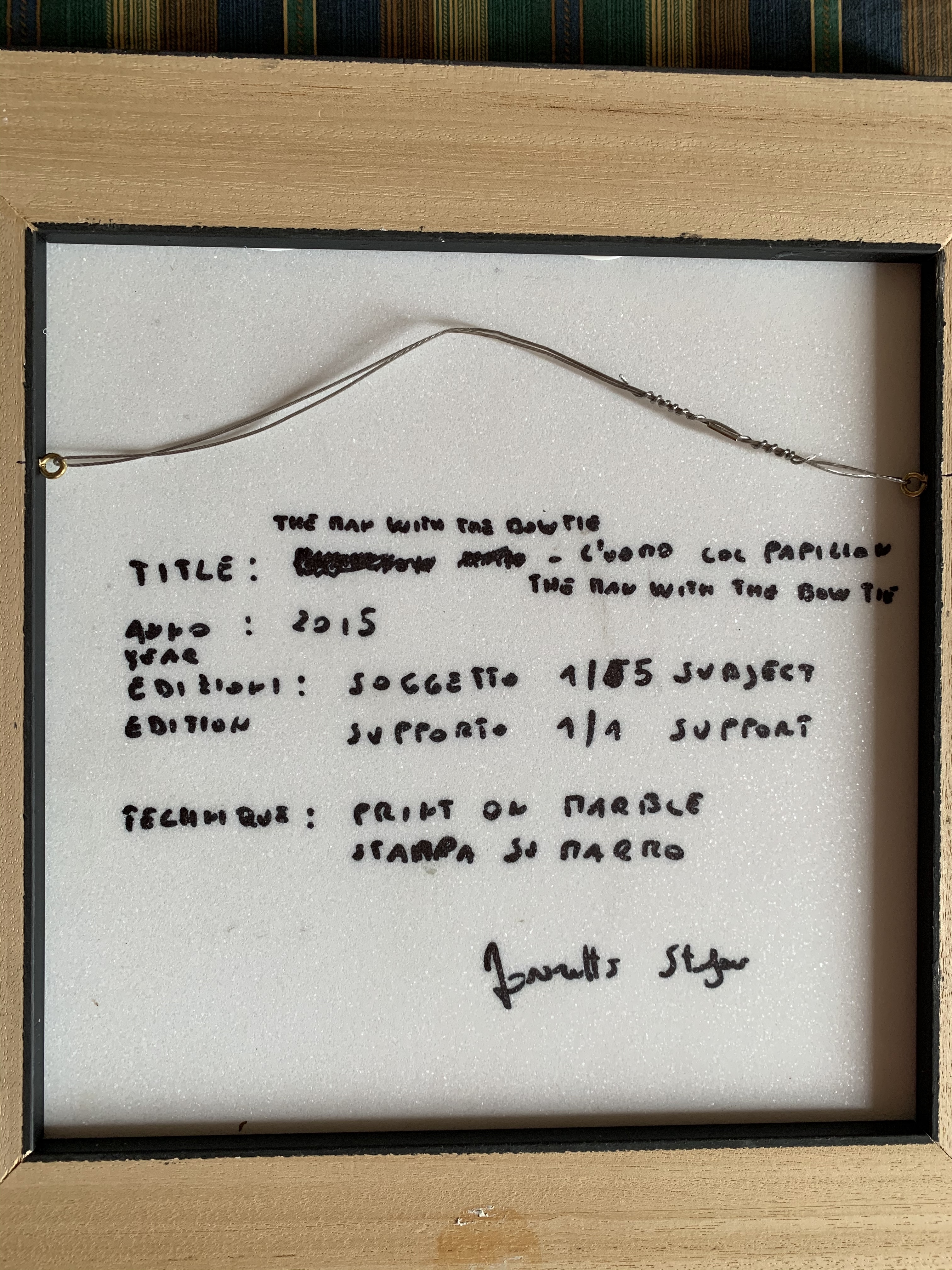 REAL MIRRORED PHOTOGRAPHY OF A MARBLE BLOCK. THE MAN WITH THE BOW TIE CONNECTS US TO THE MYTH OF BEAUTY UNDERSTOOD AS KINDNESS AND ELEGANCE