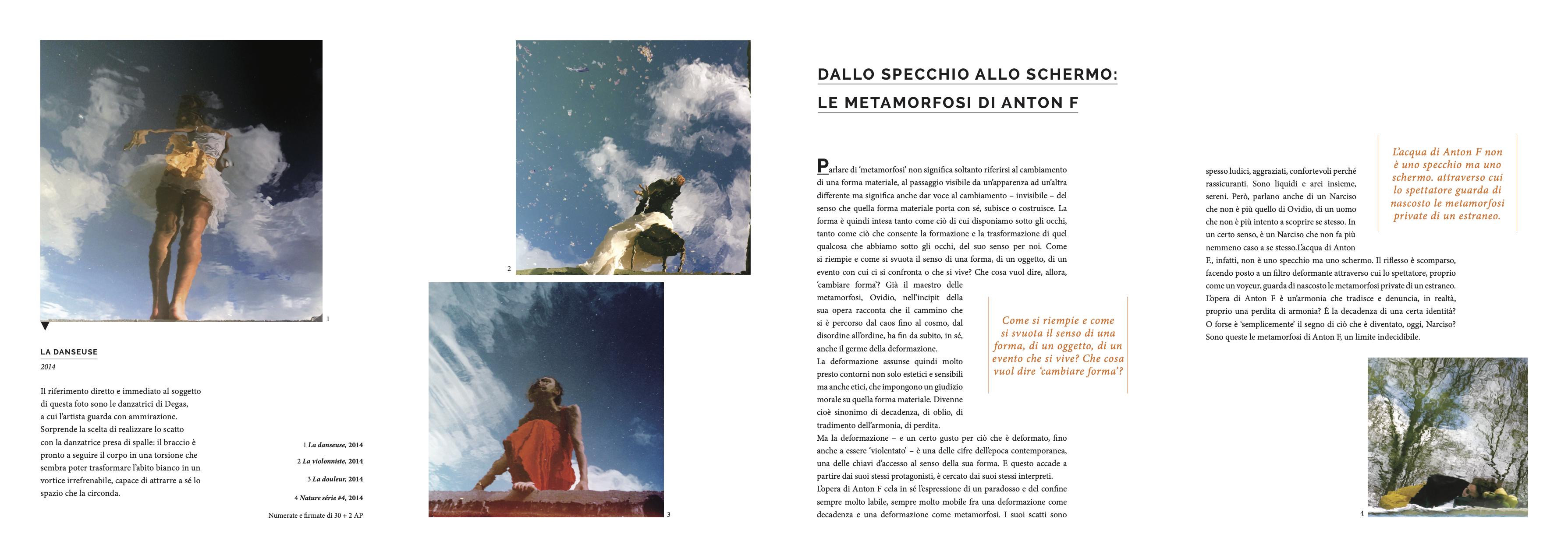 EN Anton F left Lille to move to Bordeaux, and then in 1994 he moved to Paris, where he now lives and works. Although he was tapped to work in economics, after completing his studies he turned to photography and specialized in it, making it a career. Between late 2013 and early 2014 he exhibited Reflets New York 912 at the Galerie Jules&Jim in Paris. In 2014, the Galerie de l’Europe in Paris devoted a retrospective to the photographer to present the Lignes 2013/2014 series, of which Les Musées Barbier-Mueller (Geneva) owns a diptych. His second solo show was inaugurated in 2015 and was reserved for Métamorphoses, the series he then exhibited at the Fondation d’Entreprise HiMedia. The French photographer’s artistic research, selected by the KML Art Foundation, has gained attention in Italy and Europe – mainly in Brussels – but also in New York. IT Anton F lascia Lille per trasferirsi a Bordeaux e poi, dal 1994, a Parigi, dove attualmente vive e lavora. Destinato a una carriera economica, terminati gli studi si avvicina alla fotografia e si specializza per farne la sua professione. Tra la fine del 2013 e l’inizio del 2014 espone Reflets New York 912 negli spazi parigini della Galerie Jules&Jim. A Parigi, nel 2014, la Galerie de l’Europe dedica al fotografo una retrospettiva per presentare la serie Lignes 2013/2014, di cui Les Musées Barbier-Mueller (Ginevra) possiede un dittico. La seconda personale inaugura nel 2015 ed è riservata a Métamorphoses, la serie che è stata successivamente esposta dalla Fondation d’Entreprise HiMedia. La ricerca artistica del fotografo francese, scelta anche da KML Art Foundation, è oggetto di attenzioni nazionali, europee, prevalentemente a Bruxelles, e internazionali, a New York.