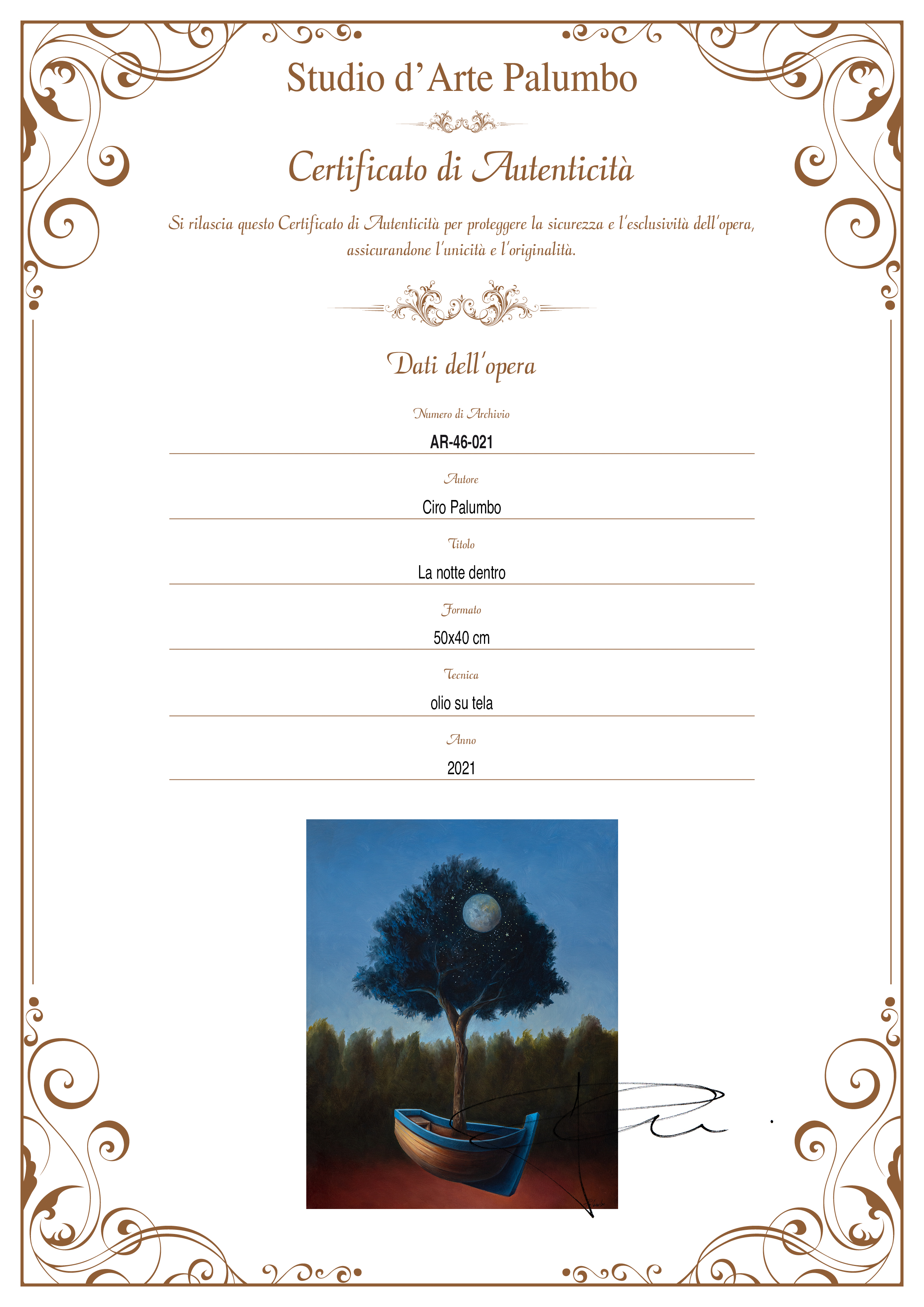 L’OPERA FA PARTE DEL CONCEPT “INFINITO”, UN CICLO PITTORICO DEDICATO AD UN PROGETTO ESCLUSIVO, COSTITUITO DA UN PRESTIGIOSO COFANETTO FATTO A MANO CONTENENTE UN LIBRO D’ARTISTA, IL CATALOGO DELLE OPERE, UN DVD E UNA STAMPA FINEART SU CARTA PREGIATA. IL COFANETTO È REALIZZATO IN UNA TIRATURA LIMITATA DI 150 PEZZI. L’OPERA FA PARTE DI UNA COLLEZIONE IN GESTIONE A 7ETTANTA6EI ART GALLERY L’OPERA È PUBBLICATA NEL CATALOGO “INFINITO” DI CIRO PALUMBO A PAGINA 145