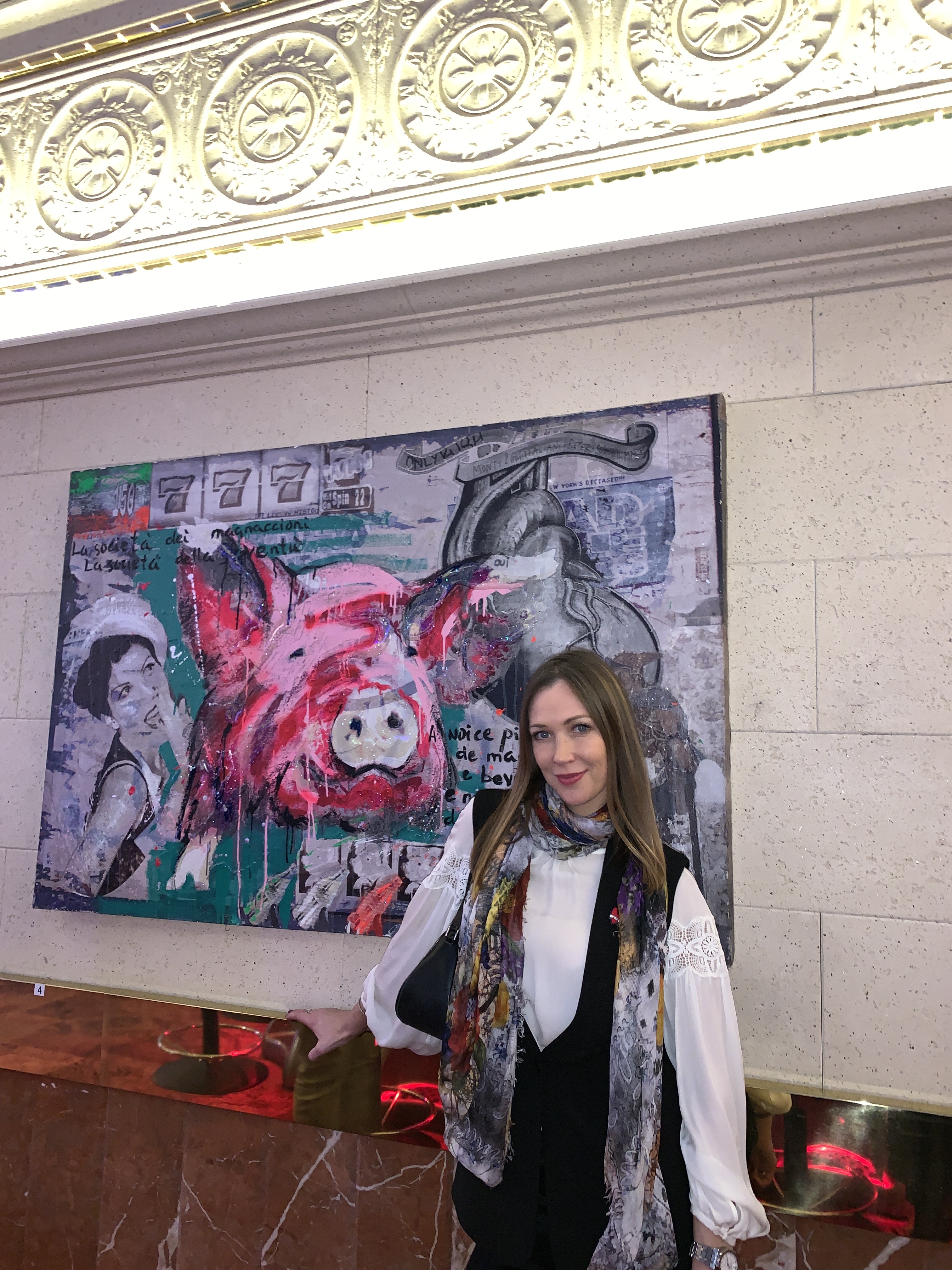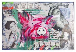 LA SOCIETA DEI MAGNACCIONI, 100X150, REALIZZATA NEL 2012 CON COLLAGE, ACRILICO E RESINA SU TELA, APPARTIENE ALLA SERIE "HUMAN SOCIETY". LA CRITICA DELL'ARTISTA SIBERIANA APPRODA NEL PARLAMENTO ITALIANO, RIVELANDO QUANTO IN ITALIA CI PIACCIA “MANGIARE”. SCRITTE PROVOCATORIE, CONTRO I MECCANISMI ECONOMICI SORGONO DA UN CUORE IN BIANCO E NERO; AL CENTRO DELL'OPERA IL SUINO, È IL RAPPRESENTANTE PER ECCELLENZA DEL MAGNA-MAGNA CHE CI CARATTERIZZA, ALLA FACCIA DEI PIÙ PICCOLI AL DI SOTTO DI LUI SCHIERATI COME IN UN CARRO BESTIAME E RAPPRESENTATI SULLO STESSO LIVELLO DELLA MERCE, DI UN PRODOTTO COMMERCIALE E POP COME LE BOTTIGLIETTE DI COLA. THE MAGNACCIONI SOCIETY, 100X150, MADE IN 2012 WITH COLLAGE, ACRYLIC AND RESIN ON CANVAS, BELONGS TO THE "HUMAN SOCIETY" SERIES. THE CRITICISM OF THE SIBERIAN ARTIST ARRIVES IN THE ITALIAN PARLIAMENT, REVEALING HOW MUCH WE LIKE "EATING" IN ITALY. PROVOCATIVE WRITINGS AGAINST ECONOMIC MECHANISMS ARISE FROM A HEART IN BLACK AND WHITE; AT THE CENTER OF THE WORK, THE PIG IS THE REPRESENTATIVE FOR EXCELLENCE OF THE "EATING-EATING" THAT CHARACTERIZES US, IN THE FACE OF THE LITTLE ONES BELOW LINED UP LIKE IN A CATTLE CAR AND REPRESENTED ON THE SAME LEVEL AS THE GOODS, A COMMERCIAL PRODUCT AND POPS LIKE COLA BOTTLES.