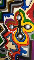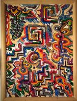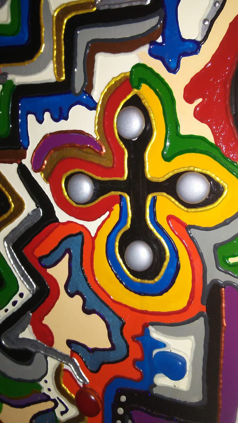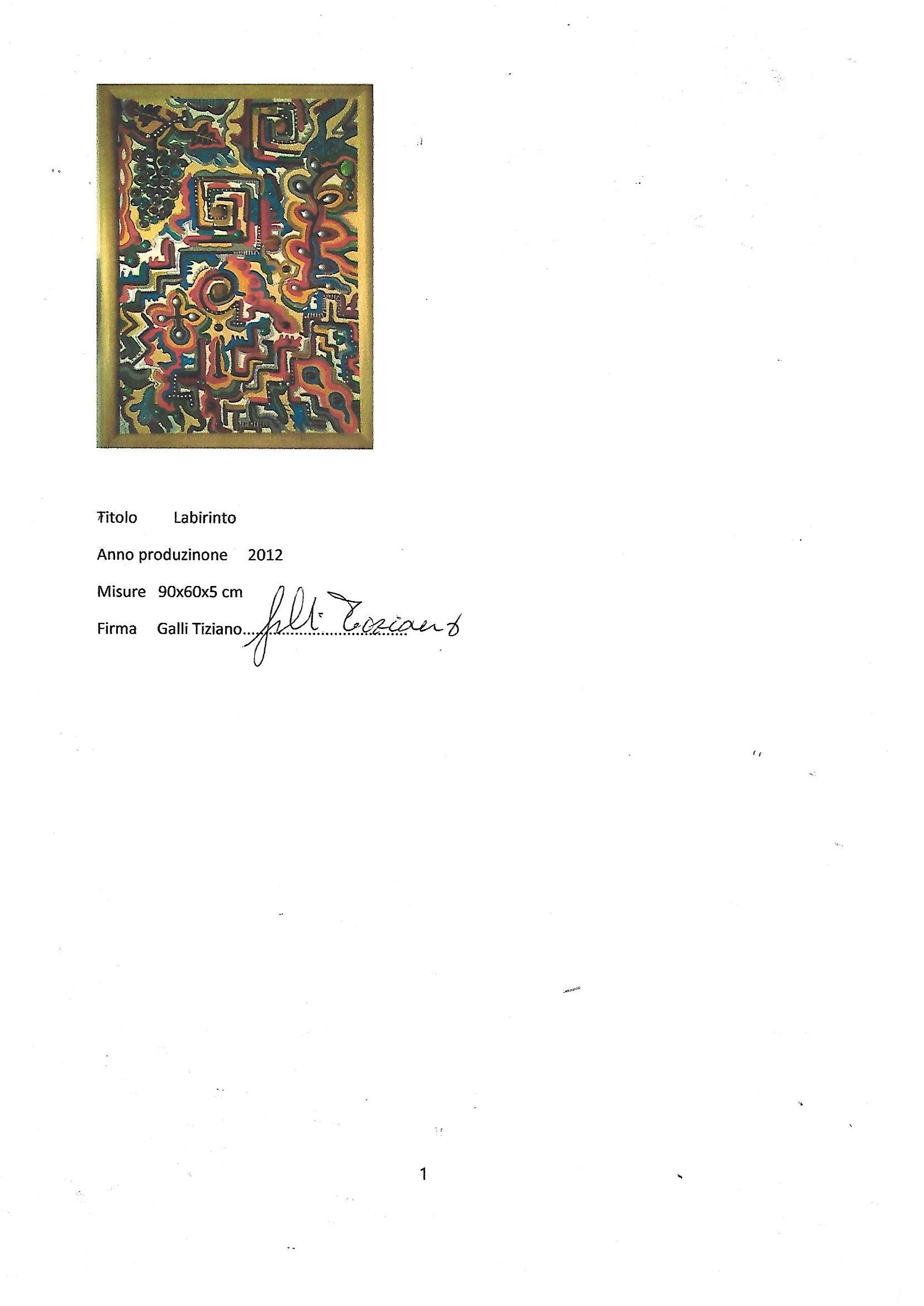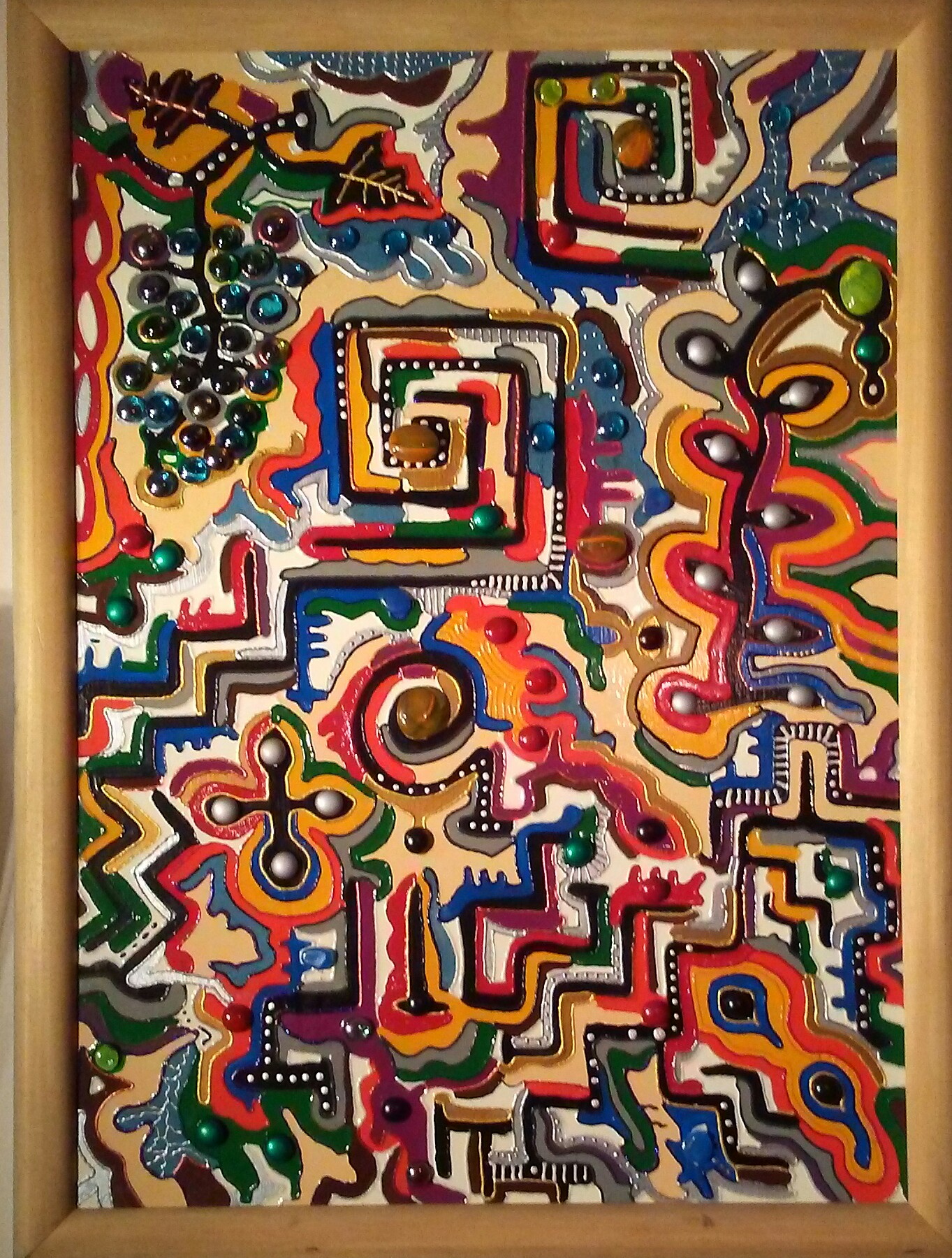 QUANDRO SU PANNELLO DI LEGNO A TECNICA MISTA , CON APPLICAZIONE DI LAPISLAZZOLI VETROSI. RAPPRESENTANTE I PERCORSI TORTUOSI CHE DEVE FARE LA VITA PER ARRICARE AL SUO OBBIETTIVO. LA METAFORA DELLA VOLPE E L' UVA