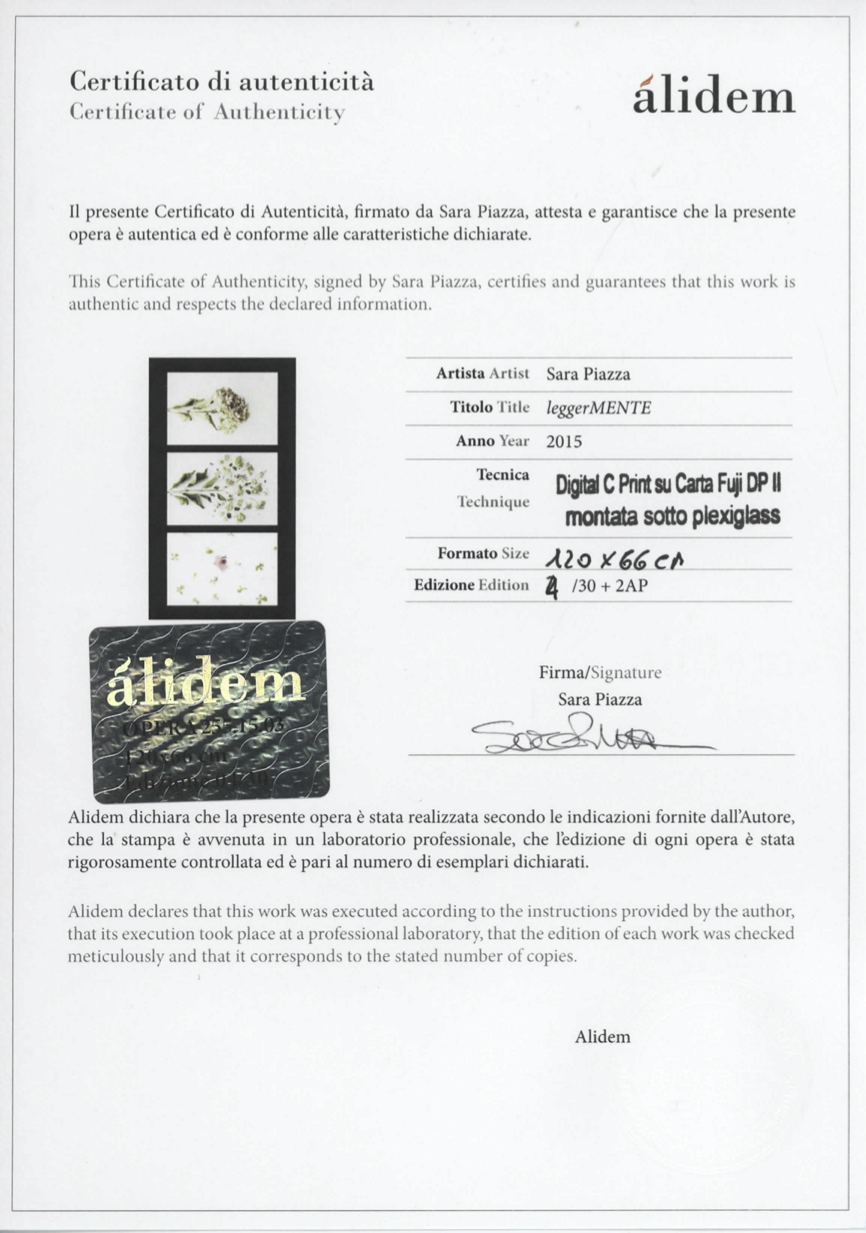 EN After graduating in Physics and Math, Sara Piazza decided to attend the Istituto Italiano di Fotografia in Milan, in order to pursue a professional career in photography. At the IIF, she had a chance to experiment all the potentialities of the photographic medium. At the end of her studies, she was selected by the Istituto Italiano di Fotografia to feature in a collective show organised on occasion of the eight edition of Photofestival, a cultural event sponsored by AIF - Associazione Italiana Foto e Digital Imaging - and part of the photo fair Photoshow (Milan, 2009). In the following years, Sara Piazza participated in several international art fairs. In 2013, her work was staged at Swab Barcelona, in 2014 and 2015 at the Affordable Art Fair Milano. Her shots have also been shown in France, at the Galerie Etienne des Causans (Paris, 2014), on occasion of the Salone Art3F (Lyon, 2015) and the Salon international d’art contemporain Art3F (Nice, 2015), and in the Netherlands at the Affordable Art Fair Amsterdam (2015). IT Dopo la laurea in Scienze Fisiche e Matematiche Sara Piazza avvia la sua carriera di fotografa professionista diplomandosi presso l’Istituto Italiano di Fotografia di Milano dove inizia molto presto a sperimentare le potenzialità del mezzo fotografico. Al termine del suo percorso formativo è selezionata dall’Istituto Italiano di Fotografia per la mostra collettiva curata in occasione dell’ottava edizione di Photofestival un evento culturale promosso da AIF - Associazione Italiana Foto e Digital Imaging – collateralmente alla fiera di fotografia Photoshow (Milano 2009). Nel corso degli anni Sara Piazza è stata protagonista di importanti fiere di arte contemporanea a livello internazionale. Nel 2013 è presente a Swab Barcelona nel 2014 e nel 2015 ad Affordable Art Fair Milano. Parallelamente agli impegni italiani le opere fotografiche di Sara raggiungono anche la Francia presso la Galerie Etienne des Causans (Parigi 2014) e in occasione del Salone Art3F (Lione 2015) e del Salon international d’art contemporain Art3F (Nizza 2015) e l’Olanda Affordable Art Fair Amsterdam (2015).