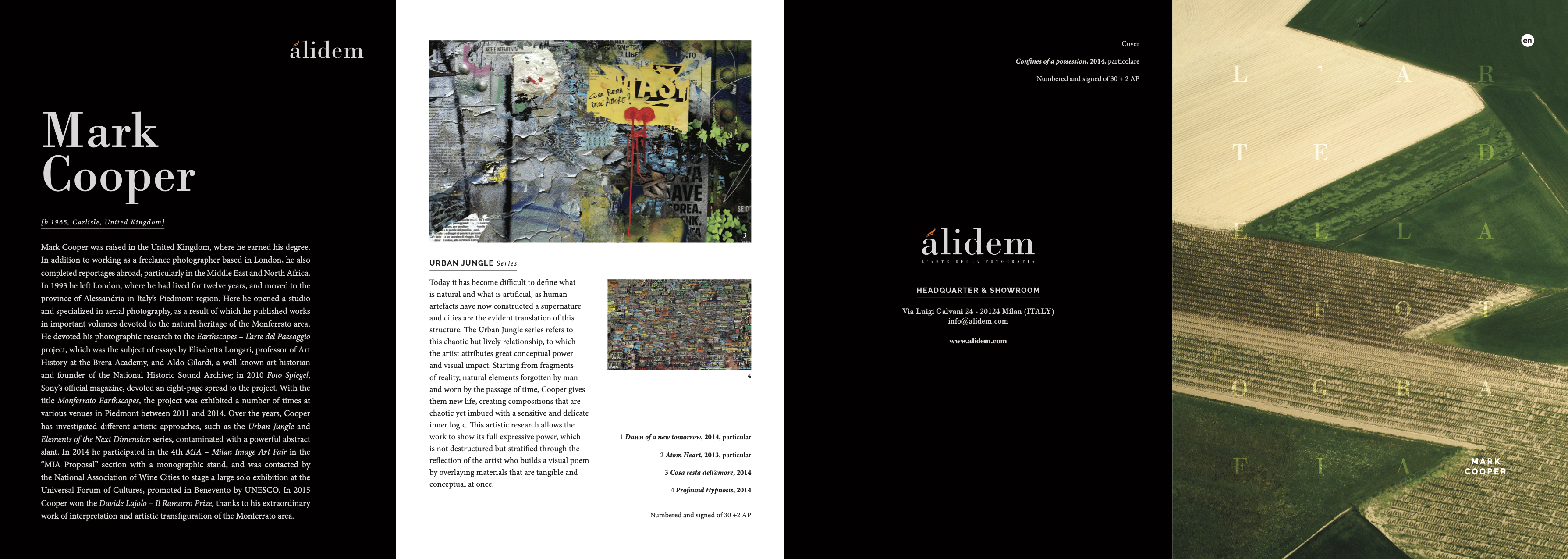 EN Mark Cooper was raised in the United Kingdom, where he earned his degree. In addition to working as a freelance photographer based in London, he also completed reportages abroad, particularly in the Middle East and North Africa. In 1993 he left London, where he had lived for twelve years, and moved to the province of Alessandria in Italy’s Piedmont region. Here he opened a studio and specialized in aerial photography, as a result of which he published works in important volumes devoted to the natural heritage of the Monferrato area. He devoted his photographic research to the Earthscapes – L’arte del Paesaggio project, which was the subject of essays by Elisabetta Longari, professor of Art History at the Brera Academy, and Aldo Gilardi, a well-known art historian and founder of the National Historic Sound Archive; in 2010 Foto Spiegel, Sony’s official magazine, devoted an eight-page spread to the project. With the title Monferrato Earthscapes, the project was exhibited a number of times at various venues in Piedmont between 2011 and 2014. Over the years, Cooper has investigated different artistic approaches, such as the Urban Jungle and Elements of the Next Dimension series, contaminated with a powerful abstract slant. In 2014 he participated in the 4th MIA – Milan Image Art Fair in the “MIA Proposal” section with a monographic stand, and was contacted by the National Association of Wine Cities to stage a large solo exhibition at the Universal Forum of Cultures, promoted in Benevento by UNESCO. In 2015 Cooper won the Davide Lajolo – Il Ramarro Prize, thanks to his extraordinary work of interpretation and artistic transfiguration of the Monferrato area. IT Mark Cooper cresce e si diploma nel Regno Unito. Parallelamente all’attività di fotografo freelance con base a Londra, ha realizzato reportage all’estero, soprattutto in Medio Oriente e Africa settentrionale. Nel 1993 lascia Londra, dove ha vissuto per dodici anni, e si trasferisce in Piemonte, nella provincia di Alessandria. Nella città piemontese apre il suo studio e si specializza in fotografia aerea, che gli vale la pubblicazione su importanti volumi dedicati al patrimonio naturale del Monferrato. Dedica la propria ricerca fotografica al progetto Earthscapes - L’arte del Paesaggio, di cui hanno scritto Elisabetta Longari, docente di Storia dell’arte presso l’Accademia di Belle Arti di Brera, e Aldo Gilardi, noto storico dell’arte e fondatore della Fonoteca Nazionale Storica, e a cui Foto Spiegel, la rivista ufficiale della Sony, nel 2010 ha dedicato uno speciale di otto pagine. Con il titolo Monferrato Earthscapes il progetto è stato più volte esposto tra il 2011 e il 2014 in differenti contesti piemontesi. Nel corso degli anni, Mark Cooper approfondisce differenti ricerche artistiche, come le serie Urban Jungle e Elements of the Next Dimension, che contamina con una forte tendenza astratta. Nel 2014 partecipa con uno stand monografico alla quarta edizione di MIA – Milan Image Art Fair nella sezione ‘Proposta MIA’, viene contattato dall’Associazione Nazionale Città del Vino per realizzare una grande personale al Forum Universale delle Culture, promosso a Benevento dall’UNESCO. Nel 2015 vince il premio Davide Lajolo – Il Ramarro grazie ad uno straordinario lavoro di interpretazione e trasfigurazione artistica del territorio monferrino.