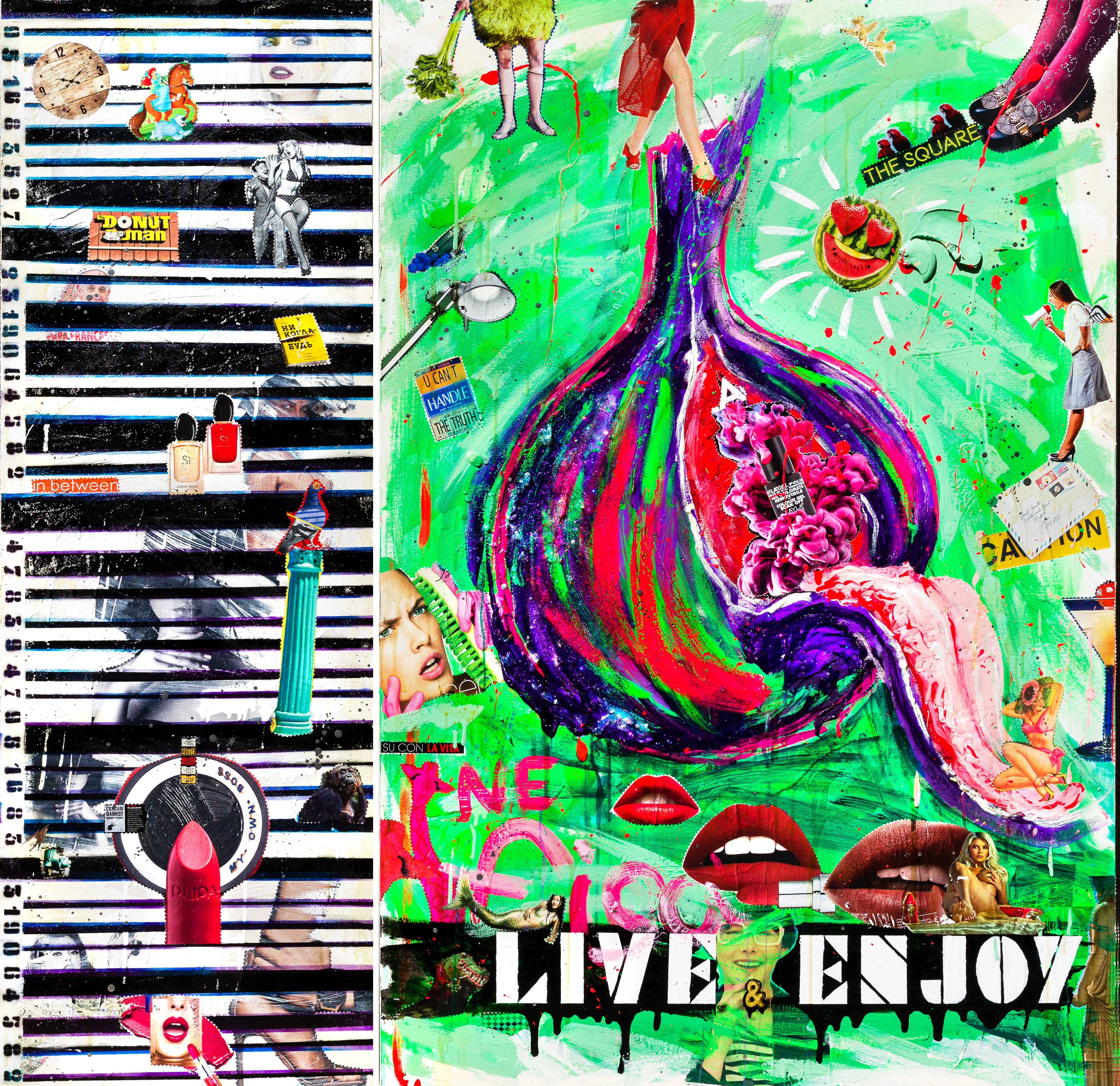 DOPO UN LUNGO PERCORSO DI SPERIMENTAZIONE CREATIVA, I 40 ANNI HANNO STIMOLATO L’ARTISTA E FASHION DESIGNER LUDMILLA RADCHENKO A RICERCARE NUOVI SPUNTI TRA LE CONTRADDIZIONI DELLA QUOTIDIANITÀ. OGGI LA PITTRICE SIBERIANA SI SENTE IN GRADO DI IRONIZZARE SUL CAOS SOCIALE ED ECONOMICO CHE CI METTE DAVANTI AD UNA CONTINUA PROVOCAZIONE. STA A NOI DECIDERE QUALE SIA IL LIMITE TRA LOGICA E LEGGEREZZA, PER CERCARE DI VIVERE SERENI E POSITIVI. KOMPOT - LA TRADIZIONALE BEVANDA RUSSA, A BASE DI FRUTTA BOLLITA E IMMERSA IN SCIROPPO DI ZUCCHERO. E’ QUESTO IL NOME CHE L’ARTISTA SIBERIANA HA SCELTO PER LA SUA NUOVA SERIE ARTISTICA, L’ISPIRAZIONE DELLA QUALE PARTE DALL’IDEA DI RAPPRESENTARE I PIACERI DELLA VITA, IRONIZZANDO E GIOCANDO SULLA SESSUALITÀ MASCHILE E FEMMINILE ATTRAVERSO LE FORME SIMBOLICHE DEI PRODOTTI ALIMENTARI; UN VIAGGIO SENSORIALE AL QUALE L’ARTISTA CI INVITA, METTENDO ALLA PROVA IL SUO SPETTATORE E PROVOCANDOLO A DECIFRARE I DOPPI SENSI.LIVE&ENJOY- LO SLOGAN DI LUDMILLA CHE SEMBRA QUASI SUPERFICIALE, MA È UNA MISSIONE DIFFICILE- POTER EQUILIBRARE IL TUTTO E SENTIRSI REALIZZATI, UTILI, IN SALITA VERSO I NOSTRI OBBIETTIVI MA PROVARE QUEL PIACERE SOTTILE DI GODERE CIÒ CHE CI CIRCONDA E PER COSA VIVIAMO. L’IDEA DI RAPPRESENTARE “I PIACERI”, ED IRONIZZARE METTENDO IN CENTRO ANCHE LA SESSUALITÀ MASCHILE E FEMMINILE ATTRAVERSO I PRODOTTI ALIMENTARI È PROPRIO UN VIAGGIO SENSORIALE CHE PROPONE LUDMILLA METTENDO ALLA PROVA IL SUO SPETTATORE, PROVOCANDOLO DI DECIFRARE I DOPPI SENSI. AFTER A LONG JOURNEY OF CREATIVE EXPERIMENTATION, THE 40 YEARS HAVE STIMULATED THE ARTIST AND FASHION DESIGNER LUDMILLA RADCHENKO TO SEEK NEW IDEAS AMONG THE CONTRADICTIONS OF EVERYDAY LIFE. TODAY THE SIBERIAN PAINTER FEELS CONFORTABLE TO BE IRONIC ABOUT THE SOCIAL AND ECONOMIC CHAOS THAT PUTS US IN FRONT OF A CONTINUOUS PROVOCATION. IT IS UP TO US TO DECIDE WHICH IS THE LIMIT BETWEEN LOGIC AND LIGHTNESS, IN ORDER TO LIVE SERENE AND POSITIVE. KOMPOT - THE TRADITIONAL RUSSIAN DRINK, BASED ON BOILED FRUIT AND DIPPED IN SUGAR SYRUP. THIS IS THE NAME THAT THE SIBERIAN ARTIST HAS CHOSEN FOR HER NEW ARTISTIC SERIES, THE INSPIRATION OF WHICH, STARTS FROM THE IDEA OF REPRESENTING THE PLEASURES OF LIFE, MAKING FUN AND PLAYING ON, MALE AND FEMALE SEXUALITY THROUGH THE SYMBOLIC FORMS OF FOOD PRODUCTS; A SENSORY JOURNEY WHERE THE ARTIST INVITES US, PUTTING HER VIEWER BY TESTING AND PROVOKING HIM TO DECODE THE DOUBLE MEANINGS. IN 2015, ON THE OCCASION OF EXPO AND INSPIRED BY THE THEME, THE ARTIST DEDICATED HERSELF TO A SERIES ENTIRELY DEVOTED TO FOOD, WHICH IS STILL ONE OF THE MOST POP EVER MADE; THE FEEDING'S THEME, TOPIC OF OUR CULTURE, EXPLORES AND IRONICALLY ANALYZES THE TREND OF TODAY'S CONSUMPTION, ALSO THROUGH CLEAR REFERENCES TO THE CRISIS FACED BY SOME COUNTRIES IN THE WORLD. BEHIND THE EVIDENT VIVIDNESS OF THE COLORS, THE AIM OF THESE WORKS IS TO STIMULATE THE VIEWER'S REFLECTION, GUIDING IT TOWARDS GREATER AWARENESS. EACH OF THE SIX WORKS IN THE SERIES HAS A STRONG PERSONALITY, CONFERRED BY THE SIBERIAN ARTIST BY COMBINING THE COLLAGE TECHNIQUE WITH A MAJESTIC WORK OF HANDMADE RESIN, ACRYLIC AND POLISH DETAILS: THE VISUAL IMPACT RESULTS TO BE MATERIAL AND THREE-DIMENSIONAL, ALMOST A TACTILE INSPIRATION. LIVE & ENJOY - THE SLOGAN BY LUDMILLA THAT SEEMS ALMOST SUPERFICIAL, BUT IT IS A DIFFICULT MISSION - TO BE ABLE TO BALANCE EVERYTHING AND FEEL FULFILLED, USEFUL, UPHILL TOWARDS OUR GOALS, BUT TRY THAT SLIGHT PLEASURE OF ENJOYING WHAT SURROUNDS US AND WHAT WE LIVE FOR. THE IDEA OF REPRESENTING "THE PLEASURES", AND IRONICALLY CENTERING MALE AND FEMALE SEXUALITY THROUGH FOOD PRODUCTS, IS JUST A SENSORY JOURNEY THAT LUDMILLA PROPOSES PUTTING HER VIEWER TO THE TEST, CAUSING HIM TO INTERPRET DOUBLE MEANINGS.