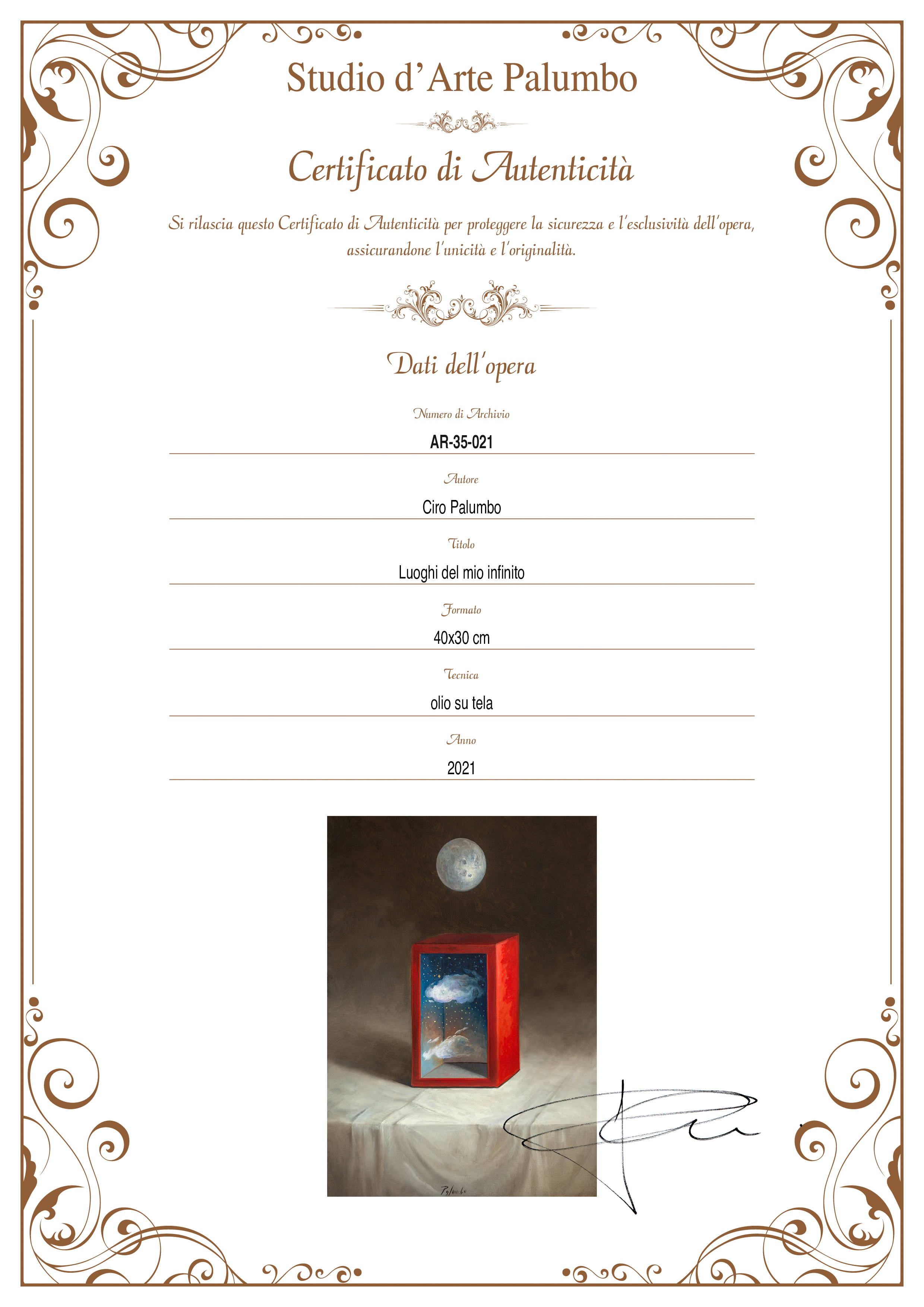 L’OPERA FA PARTE DEL CONCEPT “INFINITO”, UN CICLO PITTORICO DEDICATO AD UN PROGETTO ESCLUSIVO, COSTITUITO DA UN PRESTIGIOSO COFANETTO FATTO A MANO CONTENENTE UN LIBRO D’ARTISTA, IL CATALOGO DELLE OPERE, UN DVD E UNA STAMPA FINEART SU CARTA PREGIATA. IL COFANETTO È REALIZZATO IN UNA TIRATURA LIMITATA DI 150 PEZZI. L’OPERA FA PARTE DI UNA COLLEZIONE IN GESTIONE A 7ETTANTA6EI ART GALLERY L’OPERA È PUBBLICATA NEL CATALOGO “INFINITO” DI CIRO PALUMBO A PAGINA 49