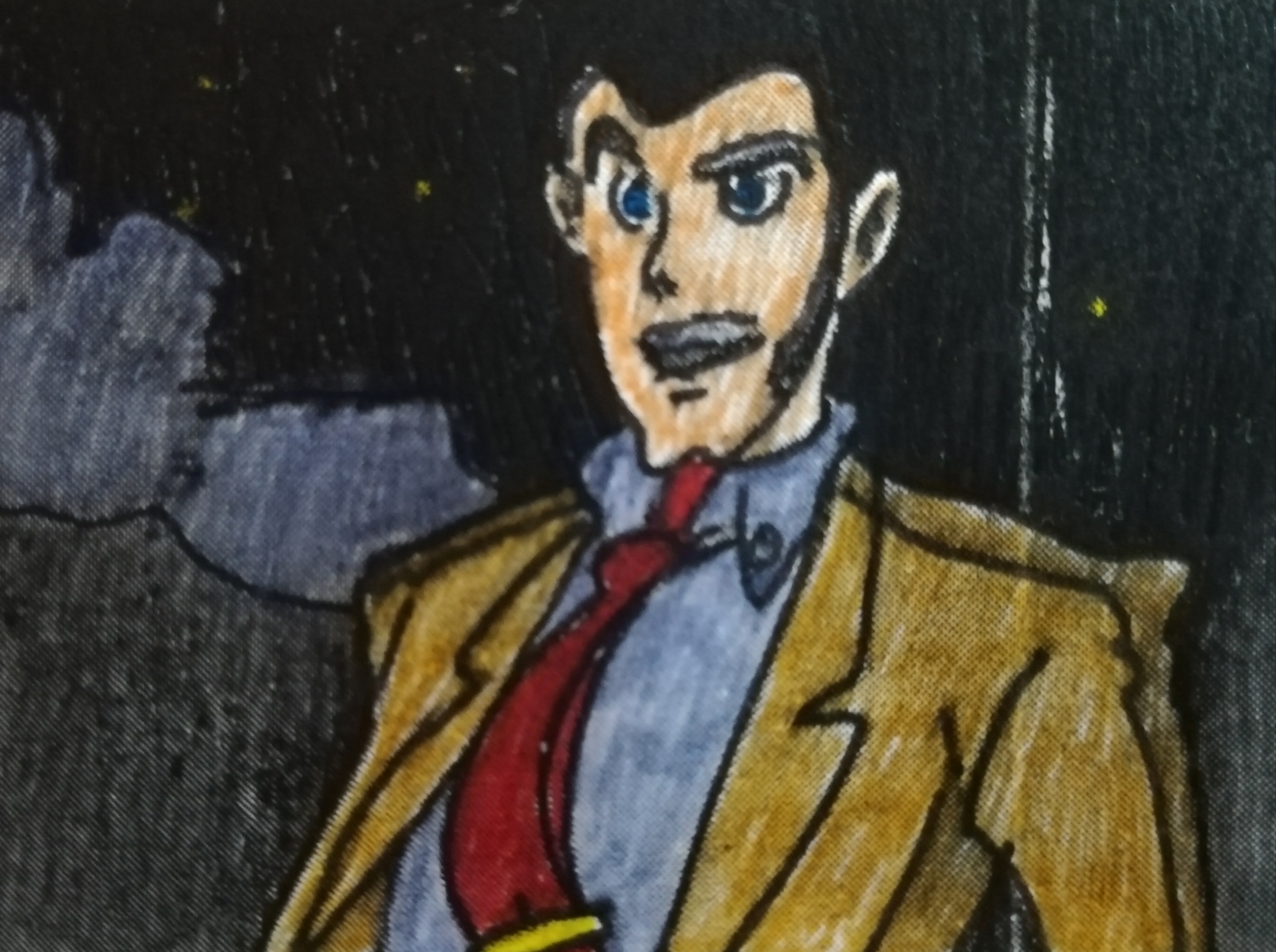 IN THIS CASE I TRIBUTED THE “LUPIN III CARTOON”, I CAPTURED ONE IMAGE, PRINTED DOWN, I RETOUCHED BY HAND, THEN I REWORKED IT PERFORMING A DIGITAL TRANSFORMATION. YOU CAN SEE THE DRAFT BELOW ON THE LEFT, I NAMED THE FILE LUPIN ON PAPER. THE DIGITAL TRANSFORMATION ON THE RIGHT BELOW, NAMED LUPIN DIGITAL . THE PHYSICAL PIECE IS 22 LENGHT (CM) AND 15 HEIGHT (CM), I SELL THE TWO FILES DIGITALLY CERTIFICATED BY ARTID IN PAIRING WITH THE PAPER COPY.