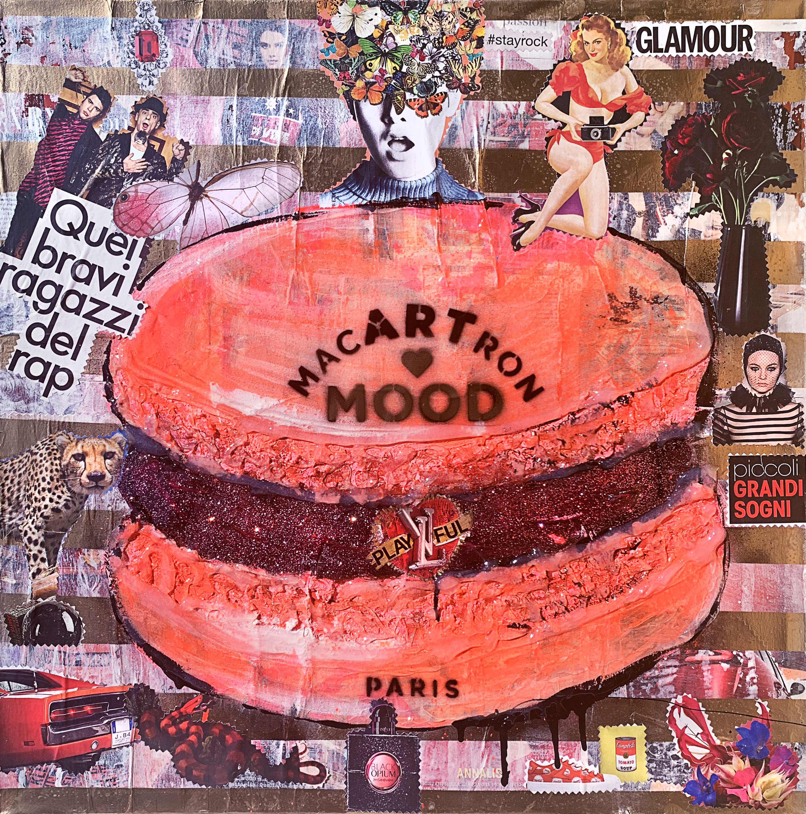 CHI NON HA AVUTO MODO DI APPREZZARE I PASTICCINI PIÙ “IN” DEL MOMENTO? DIRETTAMENTE DALLA FRANCIA, I MACARONS DIVENTANO VEICOLO DEL MESSAGGIO DELLA SERIE DI OPERE MACARTRON BY LUDMILLA RADCHENKO, DOVE LA PAROLA “ART” SI INSERISCE NEL NOME DELL'ICONICO DOLCETTO. LA SERIE RAPPRESENTA, ATTRAVERSO COLORI E ABBINAMENTI DIVERSI, I MOLTI STATI D'ANIMO E GLI UMORI CHE CARATTERIZZANO I VARI MOMENTI DELLE NOSTRE GIORNATE; L'ARTISTA ACCOSTA A CIASCUN MOOD IL NOME DI UNO DEI MAGGIORI BRAND FRANCESI, IN BASE A QUELLE CHE STORICAMENTE SONO LE SUE CARATTERISTICHE (ROMANTIC BY DIO, PLAYFUL BY LUIS VUITTON ETC..). OGNI OPERA È CARATTERIZZATA NELLA SUA UNICITÀ, PUR PARTENDO DA UNO STESSO CONCETTO INIZIALE, E REALIZZATA COMPLETAMENTE A MANO; IL RISULTATO È UNA SERIE ELEGANTE E RAFFINATA, IN PERFETTO STILE PARIGINO. QUESTA È UN OPERA DALL'EDIZIONE SPECIALE, PERSONALIZZATA COME PEZZO UNICO, LA QUOTAZIONE DI CUI NON È BASATA SUL COEFFICIENTE ATTUALE DELL'ARTISTA. È STATA CREATA APPOSITAMENTE COME UNA SERIE LIMITED EDITION CHE PERMETTE AL PUBBLICO PIÙ VASTO DI POSSEDERE UN OPERA DI LUDMILLA RADCHENKO A CONDIZIONI PIÙ ACCESSIBILI. WHO HAS NOT HAD THE CHANCE TO APPRECIATE THE MOST "MUST HAVE" PASTRIES OF THE MOMENT? DIRECTLY FROM FRANCE, THE MACARONS BECOME THE VEHICLE OF THE MESSAGE OF THE MACARTRON SERIES OF WORKS BY LUDMILLA RADCHENKO, WHERE THE WORD "ART" IS INSERTED IN THE NAME OF THE ICONIC SWEET. THE SERIES REPRESENTS, THROUGH DIFFERENT COLORS AND COMBINATIONS, THE MANY MOODS AND HUMORS THAT CHARACTERIZE THE VARIOUS MOMENTS OF OUR DAYS; THE ARTIST COMBINES THE NAME OF ONE OF THE MAJOR FRENCH BRANDS WITH EACH MOOD, BASED ON WHAT MOSTLY ARE ITS CHARACTERISTICS (ROMANTIC BY DIO, PLAYFUL BY LUIS VUITTON ETC ..). EACH WORK IS CHARACTERIZED IN ITS UNIQUENESS, ALTHOUGH STARTING FROM THE SAME INITIAL CONCEPT, AND COMPLETELY HANDMADE; THE RESULT IS AN ELEGANT AND REFINED SERIES, IN PERFECT PARISIAN STYLE. TECHNIQUE: COLLAGE ON CANVAS, ACRYLIC AND RESIN 60X60CM. THIS IS AN ARTWORK FROM THE SPECIAL EDITION, CUSTOMIZED AS A UNIQUE PIECE, THE QUOTATION OF WHICH IS NOT BASED ON THE ARTIST'S CURRENT COEFFICIENT. IT WAS CREATED SPECIFICALLY AS A LIMITED EDITION SERIES THAT ALLOWS THE WIDER PUBLIC TO OWN A LUDMILLA RADCHENKO WORK ON MORE ACCESSIBLE TERMS.