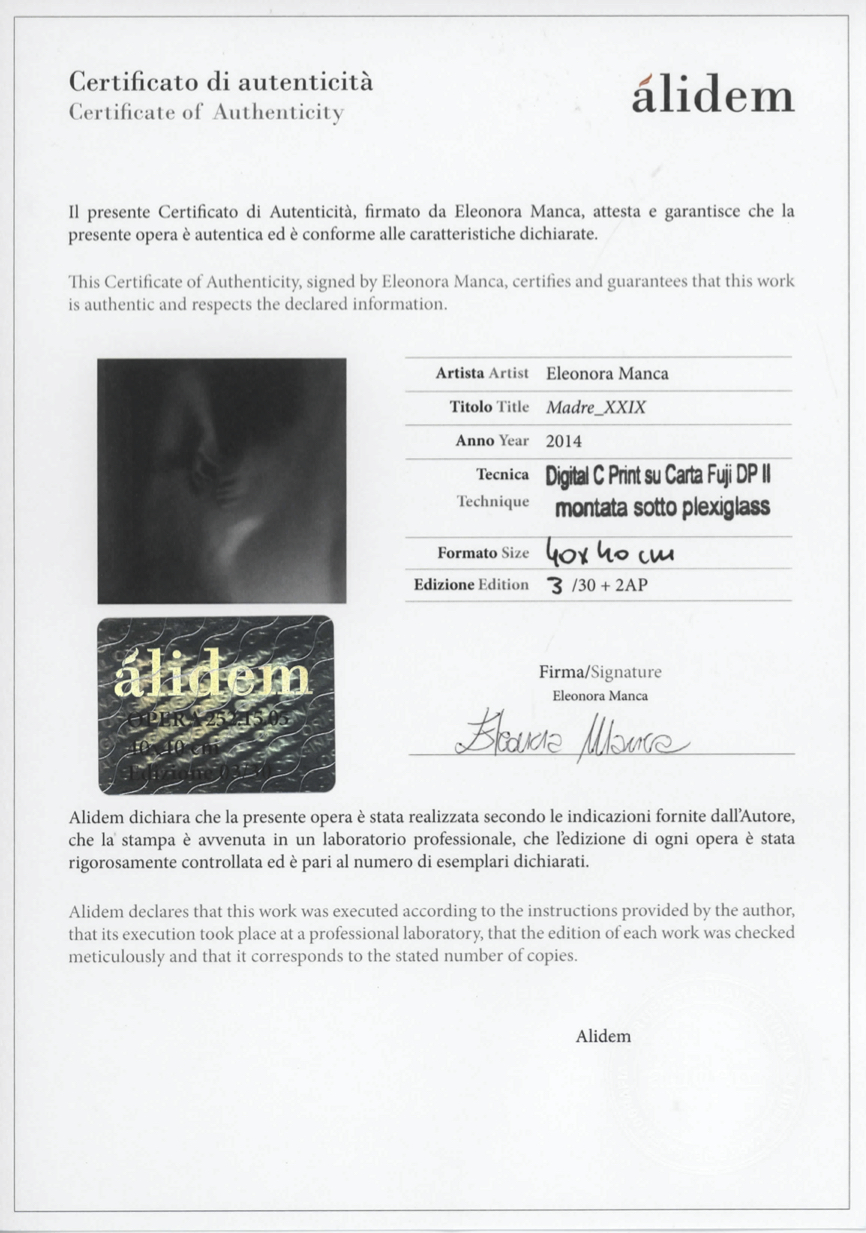 EN After studying Art History at the University of Pisa, Eleonora Manca moved to Turin, where she earned her master’s in Theatre and Stagecraft. Alongside her academic training, she developed her own artistic research, initially with drawing and painting, and then specializing in new media, mainly video, performance and photography. In 2013 Giorgio Bonomi featured Manca at the collective exhibition Il corpo solitario. L’autoscatto nella fotografia contemporanea, which he curated in Turin. That year the artist participated in Paraphotò, the exhibition project that Davide Giglio and Daniele Ratti, in collaboration with the Centro Visual in Turin, curated for Paratissima IX. In 2015 her photographic production was exhibited in Italy, in Turin at Paratissima XI, and in Portugal, at Alcobaca, which hosted the exhibition Alberto Guerreiro curated for the Book and Movies International Prize. Also in 2015, Carlo Emanuele Bugatti and Giorgio Bonomi selected some of her photographs for an exhibition at the MUSINF in Senigallia, and these works have now entered the collection of the Italian Archive of Photographic Self- portraits. Alongside photography exhibitions, Manca has also been featured at film festivals and international video-art festivals. A visual artist, photographer, video artist and video performer, Manca was chosen as “artist of the month” by the Centro IGAV in Turin (March 2015) and was mentioned in the Gold section of Fotografi Italiani 2015, a web catalogue curated by Benedetta Spagnuolo. IT Dopo gli studi in Storia dell’Arte presso l’Università di Pisa Eleonora Manca si trasferisce a Torino e si specializza in Teatro e Arti della Scena. Parallelamente alla formazione accademica sviluppa la propria ricerca artistica dapprima con il disegno e la pittura e poi sperimentando nuovi media principalmente il video la performance e la fotografia. Nel 2013 Giorgio Bonomi inserisce Eleonora Manca tra i protagonisti della mostra collettiva Il corpo solitario. L’autoscatto nella fotografia contemporanea che cura a Torino. Lo stesso anno l’artista partecipa a Paraphotò il progetto espositivo che Davide Giglio e Daniele Ratti in collaborazione con Centro Visual di Torino curano per Paratissima IX. Nel 2015 la sua produzione fotografica è esposta in Italia a Torino in occasione di Paratissima XI e in Portogallo ad Alcobaca dove ha luogo la mostra che Alberto Guerreiro cura per Book and Movies International Prize. Lo stesso anno Carlo Emanuele Bugatti e Giorgio Bonomi selezionano alcune opere fotografiche dell’artista per una mostra presso il MUSINF di Senigallia che entrano a far parte della collezione dell’Archivio Italiano dell’Autoritratto Fotografico. Parallelamente alle esposizioni di fotografia Eleonora Manca è protagonista di Film Festival e Festival Internazionali di Video Arte. Artista visiva fotografa videoartista e video performer Eleonora dopo essere stata eletta artista del mese dal Centro IGAV di Torino (marzo 2015) è citata nella sezione Gold di Fotografi Italiani 2015 un catalogo web curato da Benedetta Spagnuolo.