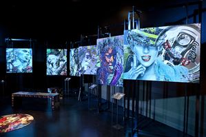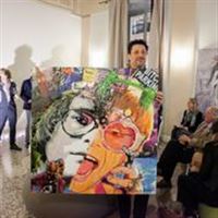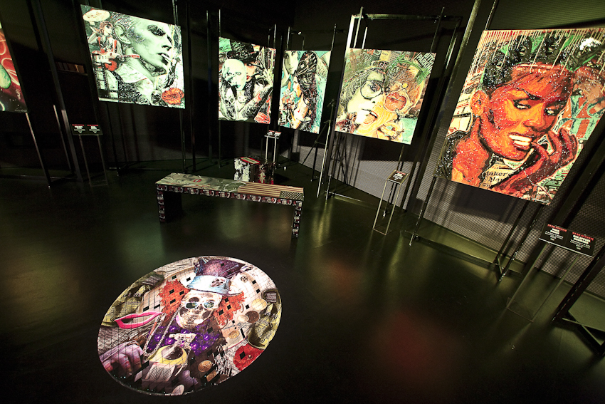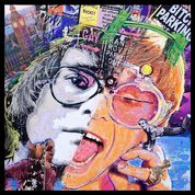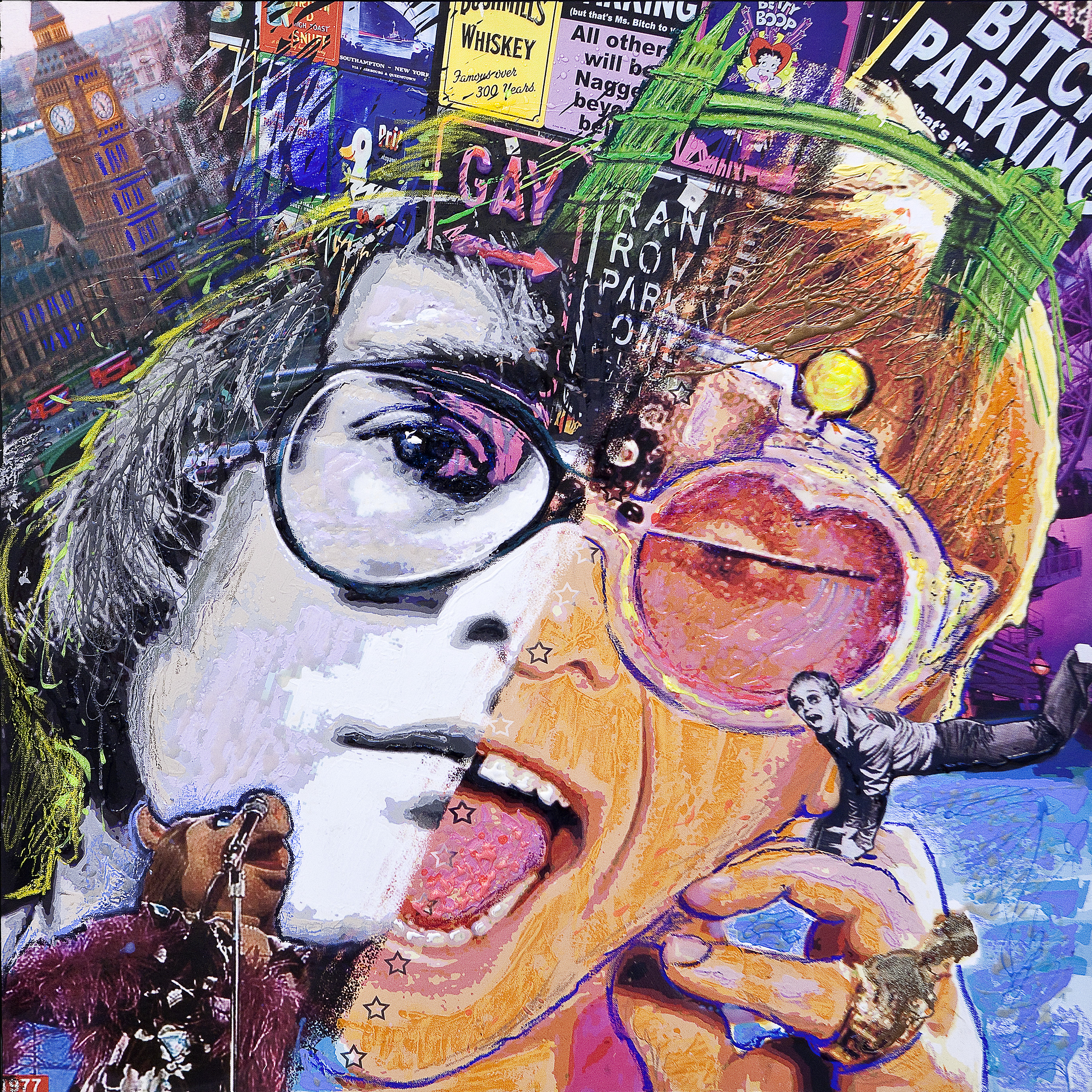 UNA SERIE DEDICATA AL MONDO DELLO SPETTACOLO ED AI PERSONAGGI CHE LO POPOLANO. UN SISTEMA VIZIATO DALLE IMPOSTAZIONI SOCIALI DIVENTA LA GALASSIA DELLE “STAR SYSTEM”, COMPOSTO DALLE ICONE DEL COMPORTAMENTO SOCIALE. LUDMILLA RADCHENKO È UNA “MODELLA” CHE GUARDA QUESTI PERSONAGGI, ALL’INTERNO DELLA GALASSIA MEDIATICA.LE STELLE VICINE E LONTANE APPARENTEMENTE SONO TUTTE SULLO STESSO PIANO. I SUOI PERSONAGGI, FLUTTUANTI IN UN TEMPO ASSENTE MA RICCO DI PASSIONE, ASSUMUNO LA DIGNLITÀ DI EROI E ALCUNI ANCHE DI MITI. PER UNA GIOVANE DONNA DEL CONTEMPORANEO OCCIDENTALE PROVENIENTE DA UNA CULTURA DIFFERENTE DALLA NOSTRA, LE DIFFICOLTÀ DI LEGGERE UNA STORIA DI PROTAGONISTI INNALZATI AD EROI A MITI TRASGRESSIVI APPARTENUTI AD UNA GENERAZIONE INDUSTRIALE O POSTINDUSTRIALE. MAGIC ELTON JOHN, 110X110, OPERA DEL 2010 REALLIZATA CON LA TECNICA DEL COLLAGE DIGITALE, ACRILICO FLUORESCENTE E RESINA DEDICATA AL MITO DI ELTON JOHN. GRAZIE AI COLORI FLUO IL QUADRO È CAPACE DI CREARE UNA LUMINESCENZA PARTICOLARE ANCHE AL BUIO. ULTIMA OPERA RIMASTA DELLA SERIE STAR SYSTEM. A SERIES DEDICATED TO THE WORLD OF THE SHOW AND TO THE CHARACTERS WHO ARE A PART OF IT A SYSTEM POORED BY SOCIAL SETTINGS BECOMES THE GALAXY OF THE "STAR SYSTEM ”, COMPOSED BY THE ICONS OF SOCIAL BEHAVIOR. LUDMILLA RADCHENKO IS A "MODEL" WHO LOOKS AT THESE CHARACTERS, FROM THE INSIDE OF THE MEDIA GALAXY. NEAR AND DISTANT STARS APPARENTLY THEY ARE ALL ON THE SAME FLOOR. HES CHARACTERS, FLOATING IN AN ABSENT TIME BUT FULL OF PASSION, I ASSUME THE DIGNITY OF HEROES AND SOME OF MYTHS. FOR A YOUNG WOMAN OF THE WESTERN CONTEMPORARY FROM A CULTURE DIFFERENT FROM OURS, THE DIFFICULTIES OF READING A STORY OF PROTAGONISTS RISE TO HEROES TO TRANSGRESSIVE MYTHS BELONGING TO A GENERATION INDUSTRIAL OR POST-INDUSTRIAL. MAGIC ELTON JOHN, 110X110, ARTWORK OF 2010 CREATED WITH THE TECHNIQUE OF DIGITAL COLLAGE, FLUORESCENT ACRYLIC AND RESIN DEDICATED TO THE MYTH OF ELTON JOHN. THANKS TO THE FLUORESCENT COLORS, THE PAINTING IS CAPABLE OF CREATING A PARTICULAR LUMINESCENCE EVEN IN THE DARK. LAST REMAINING WORK OF THE STAR SYSTEM SERIES.