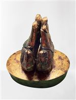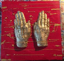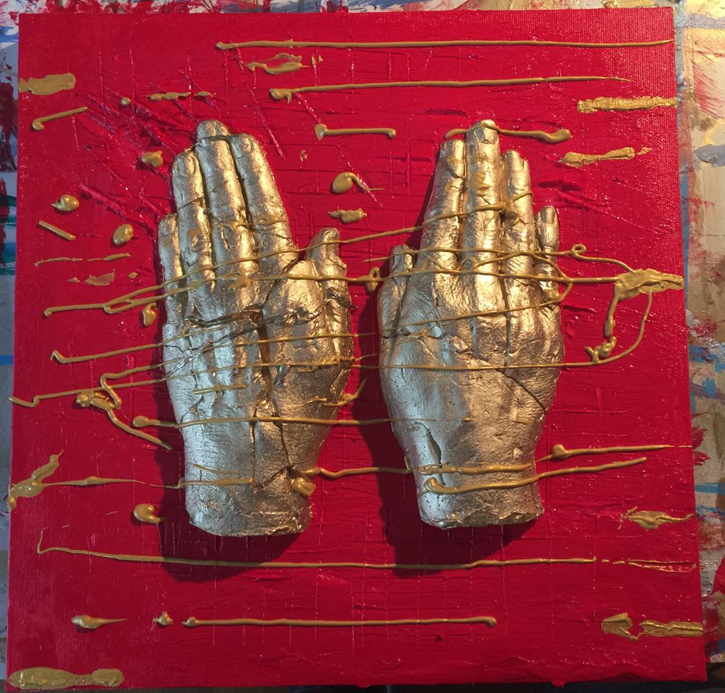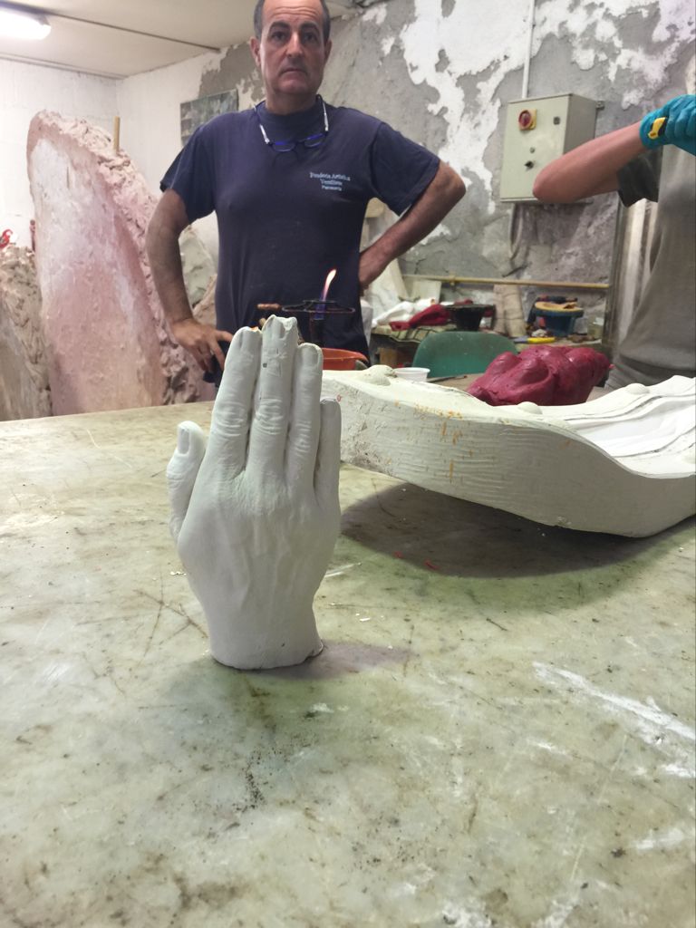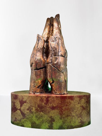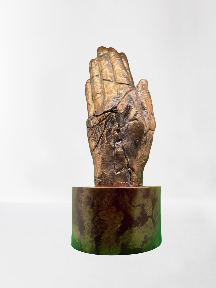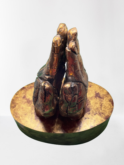 LE MANI IN PREGHIERA E' UNA FUSIONE IN BRONZO ESEGUITA A PIETRASANTA NELLA FONDERIA VERSILIESE, LA STESSA CHE REALIZZA LE SCULTURE DI BOTERO. E' UN'UNICA REALIZZAZIONE A CERA PERSA ED E' UNO DEI PIU' IMPORTANTI SOGGETTI DELLE OPERE DI GIANNA MOISE, REALIZZATI SIA IN VETRO DI MURANO SIA IN PITTURA.